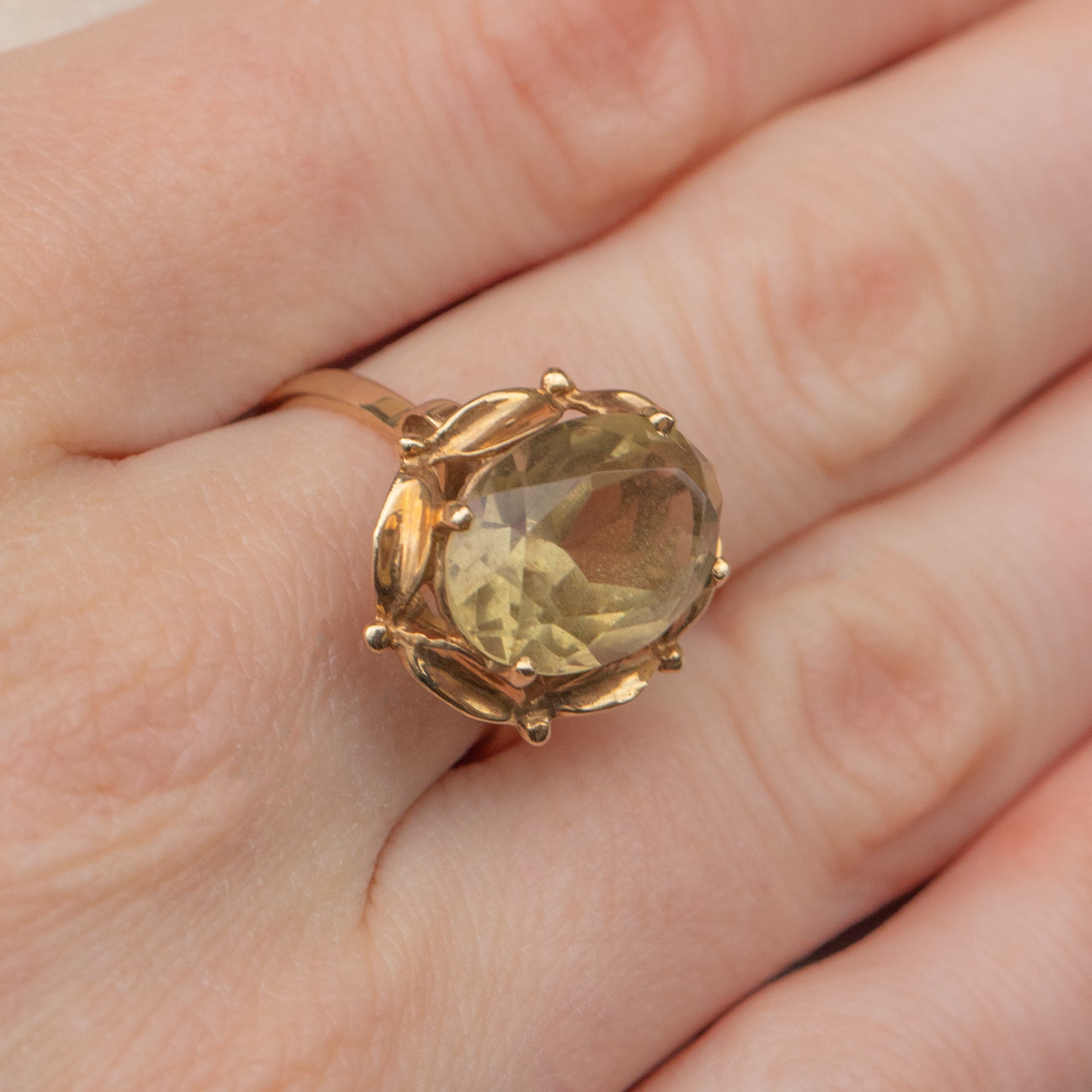 EXCELLENT. This 9ct Gold Citrine dress ring is in excellent condition. The Citrine is secure, free from nibbles or abrasions, and the settings are super pretty. The ring band is robust and it wear comfortably on the finger!