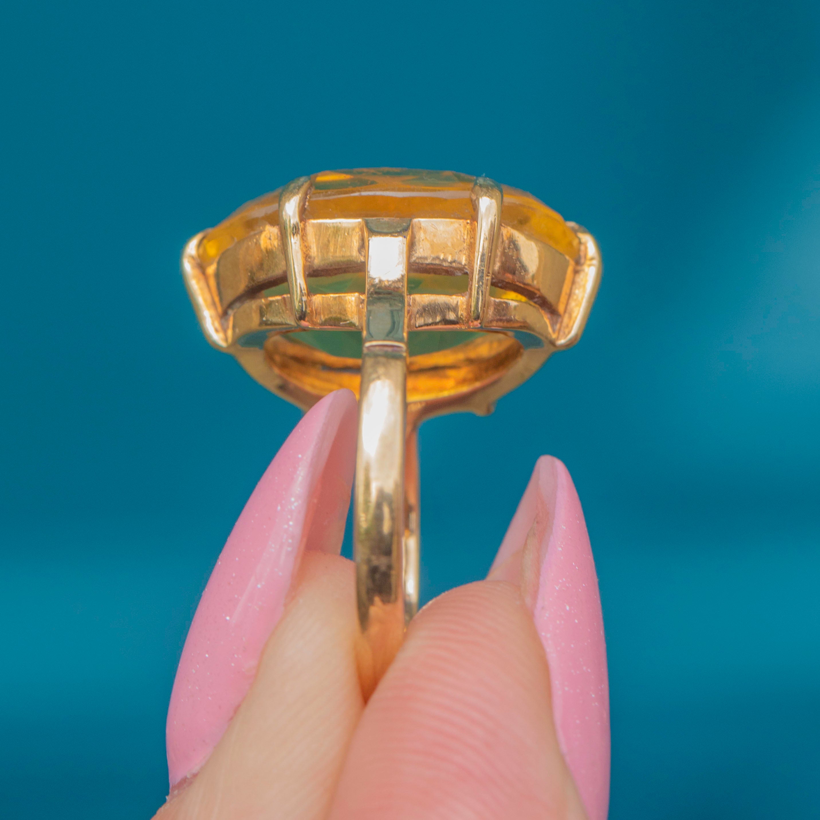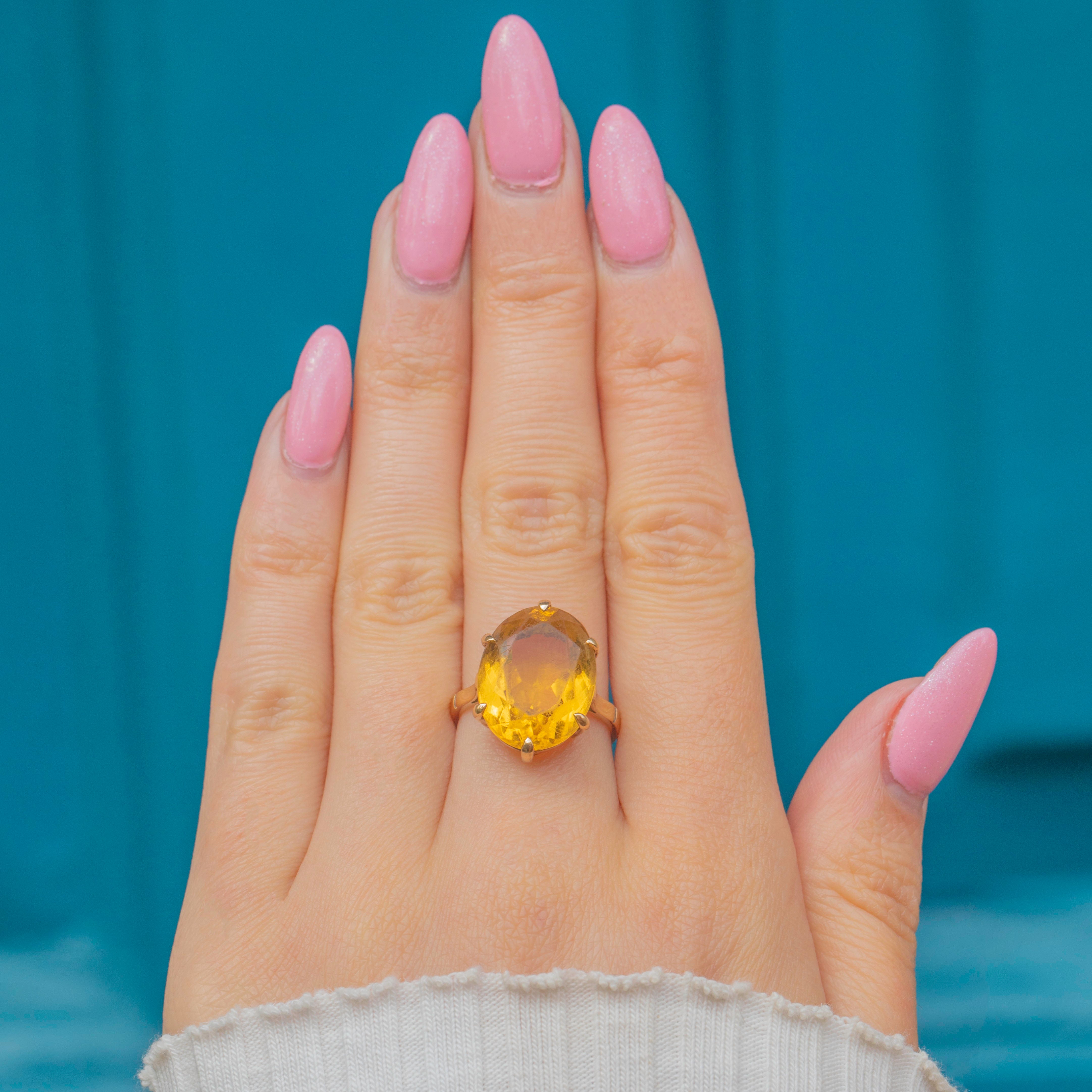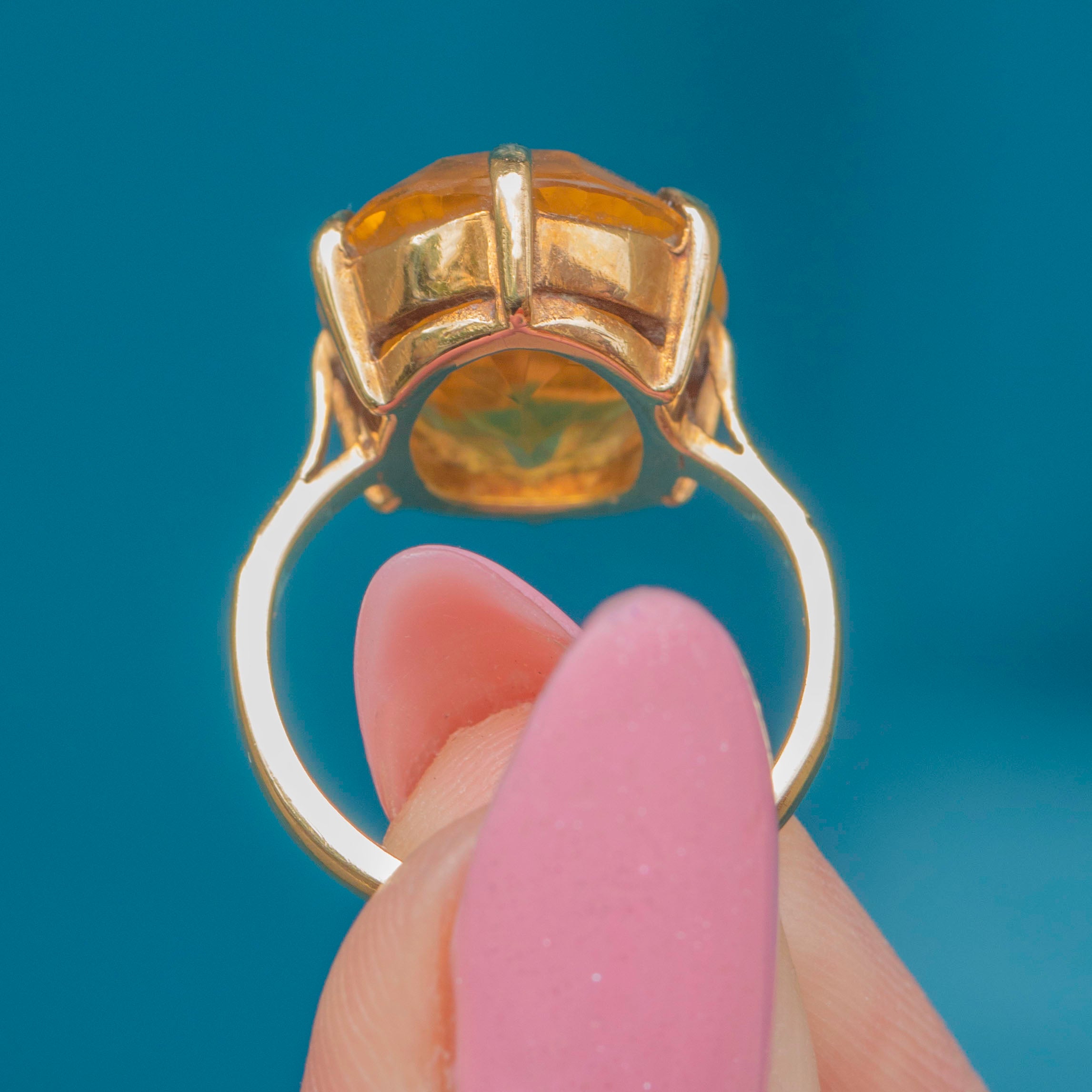 VERY GOOD-EXCELLENT: This vintage 9ct Gold 6.00ct Citrine dress ring is in great condition! Her Citrine is radiant, with some minor surface scratches which are difficult to see without a loupe. Set securely in her claw settings, this Citrine ring can be worn with utmost confidence!