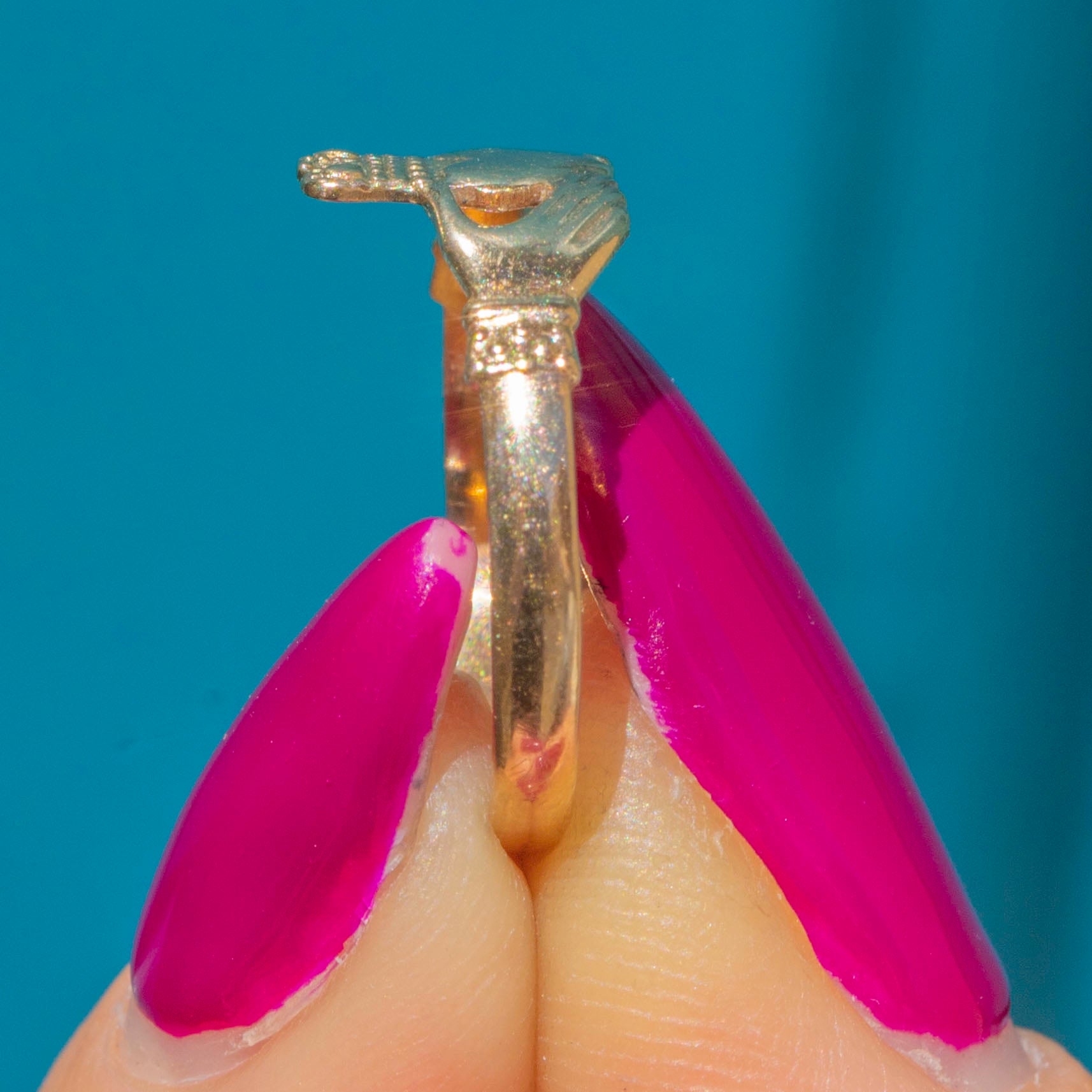 VERY GOOD-EXCELLENT: The Gold is bright and has retained a nice sheen, with only minimal signs of wear. The band is not perfectly round, but it remains comfortable to wear. With little else to note, this Claddagh ring is ready to be worn and enjoyed!