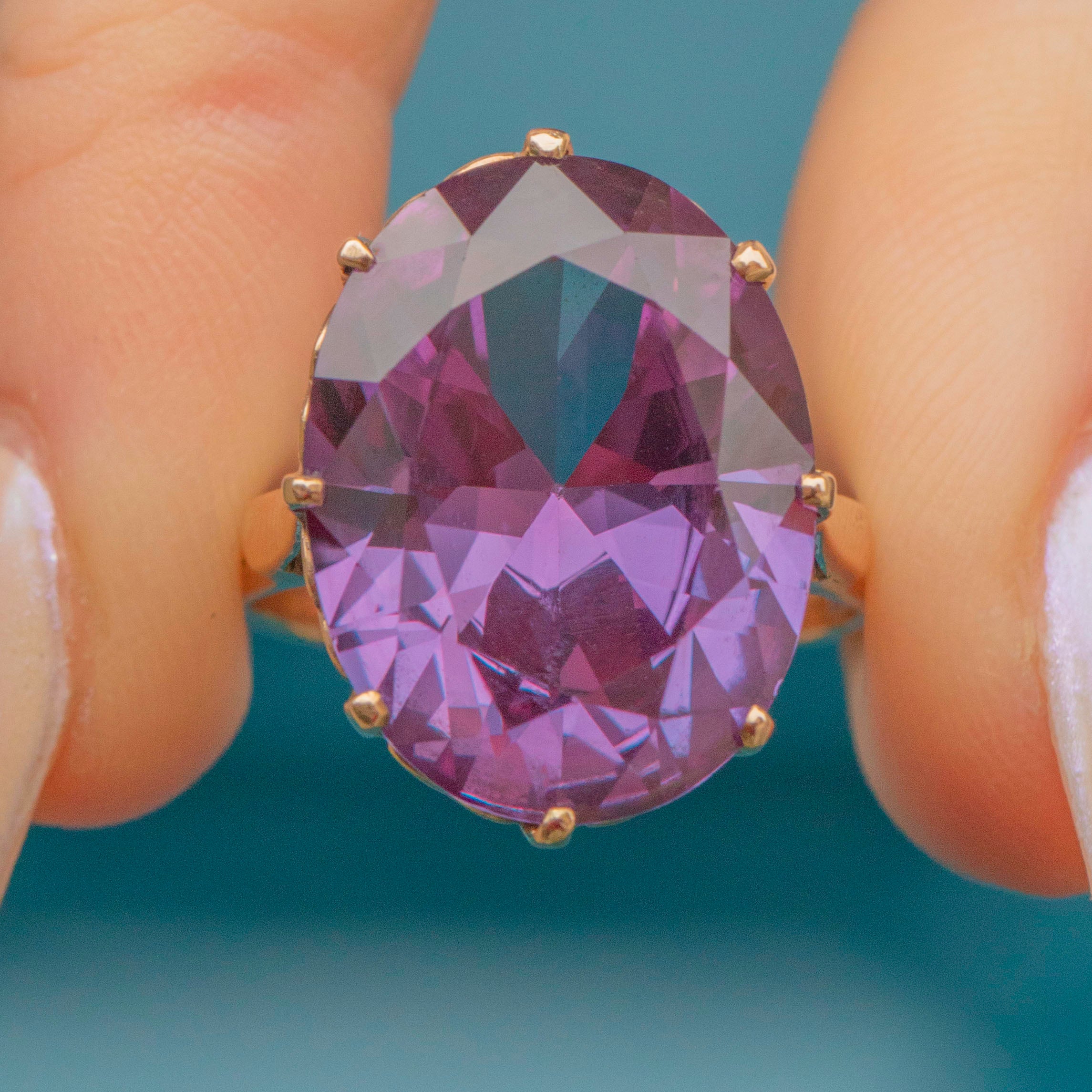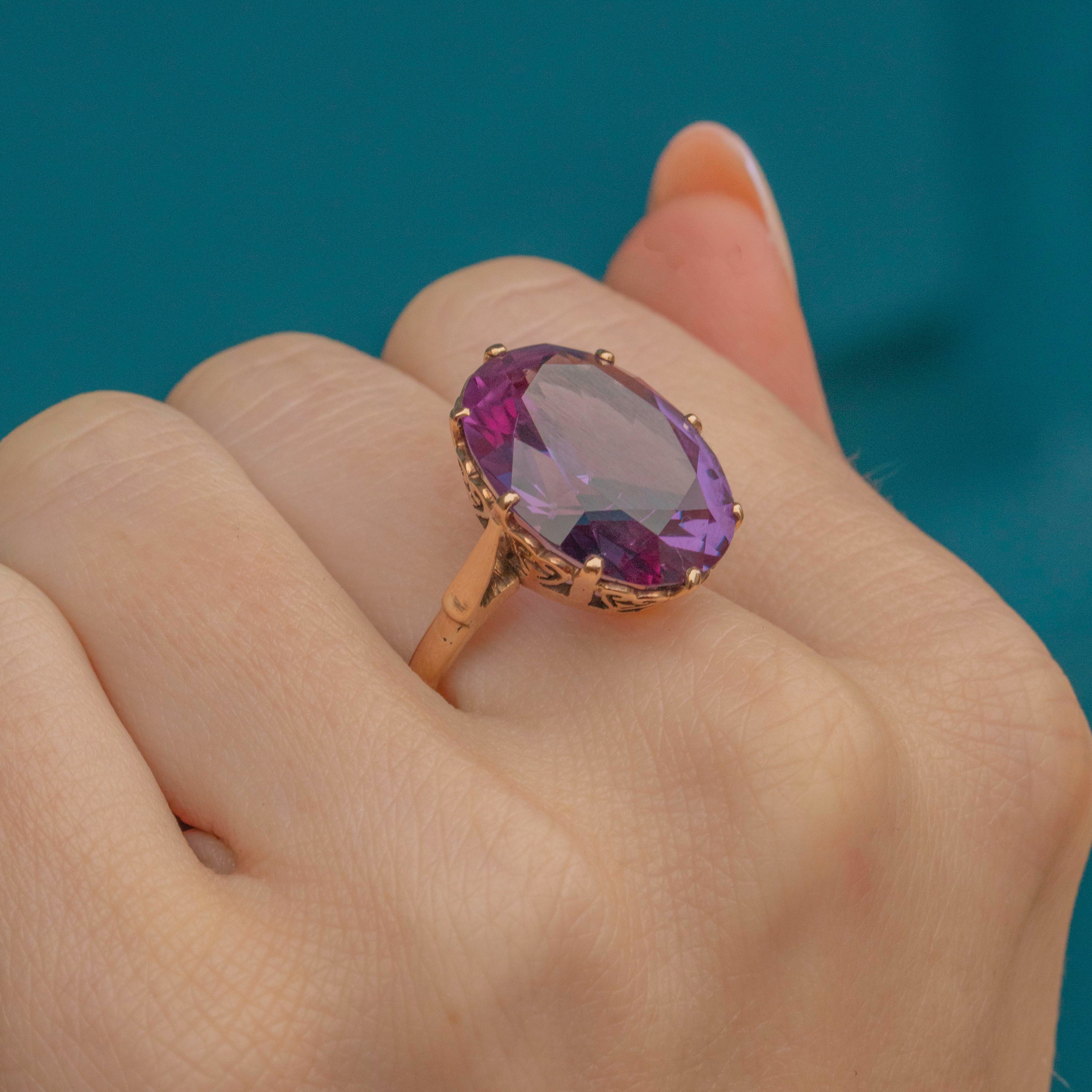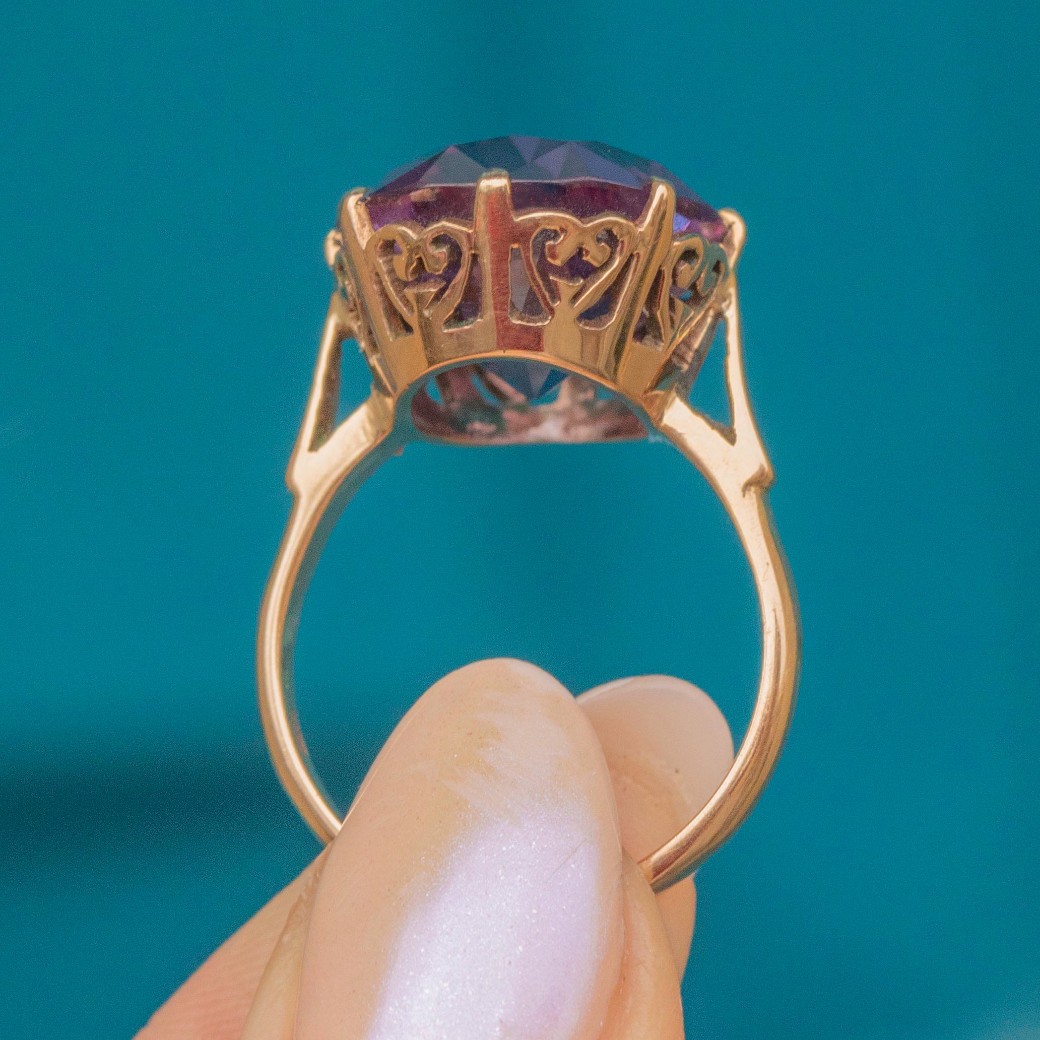 The phenomenal 15.00ct synthetic colour-change Sapphire sits proudly atop an intricate gallery with little heart details, allowing the light to stream through the gemstone from every angle. Wrapping around your finger with pure decadence, the smooth 9ct Gold band sits comfortably and promises many more years of wear and enjoyment!