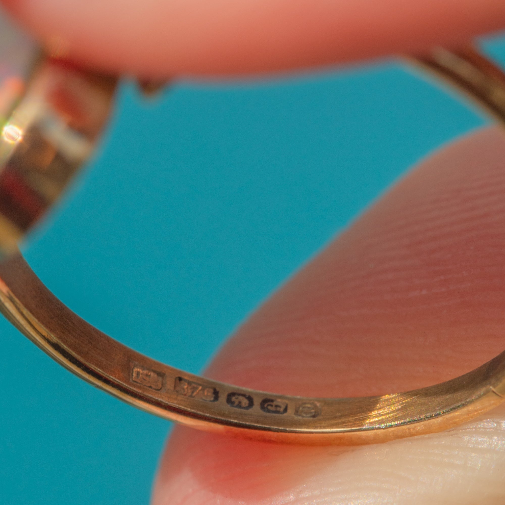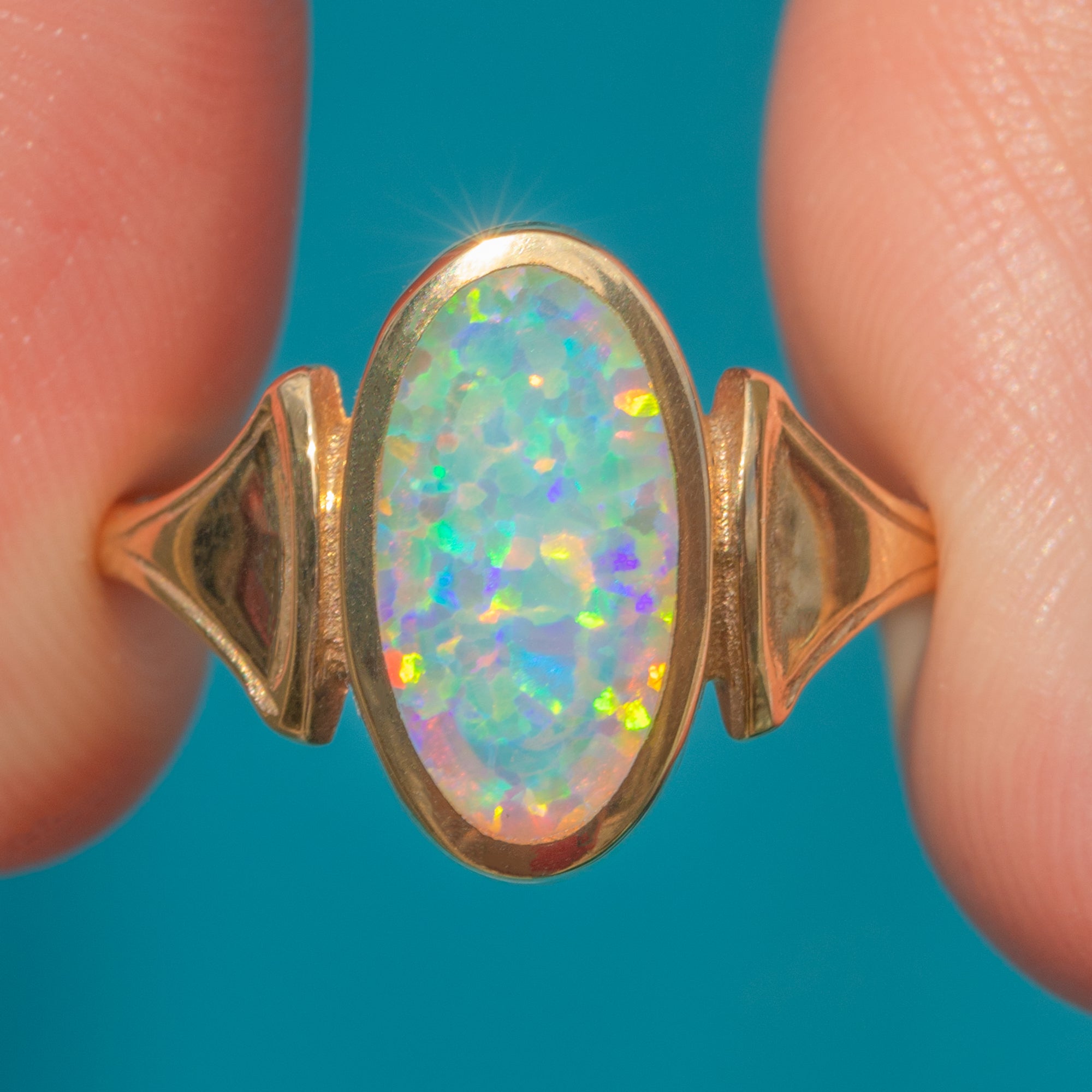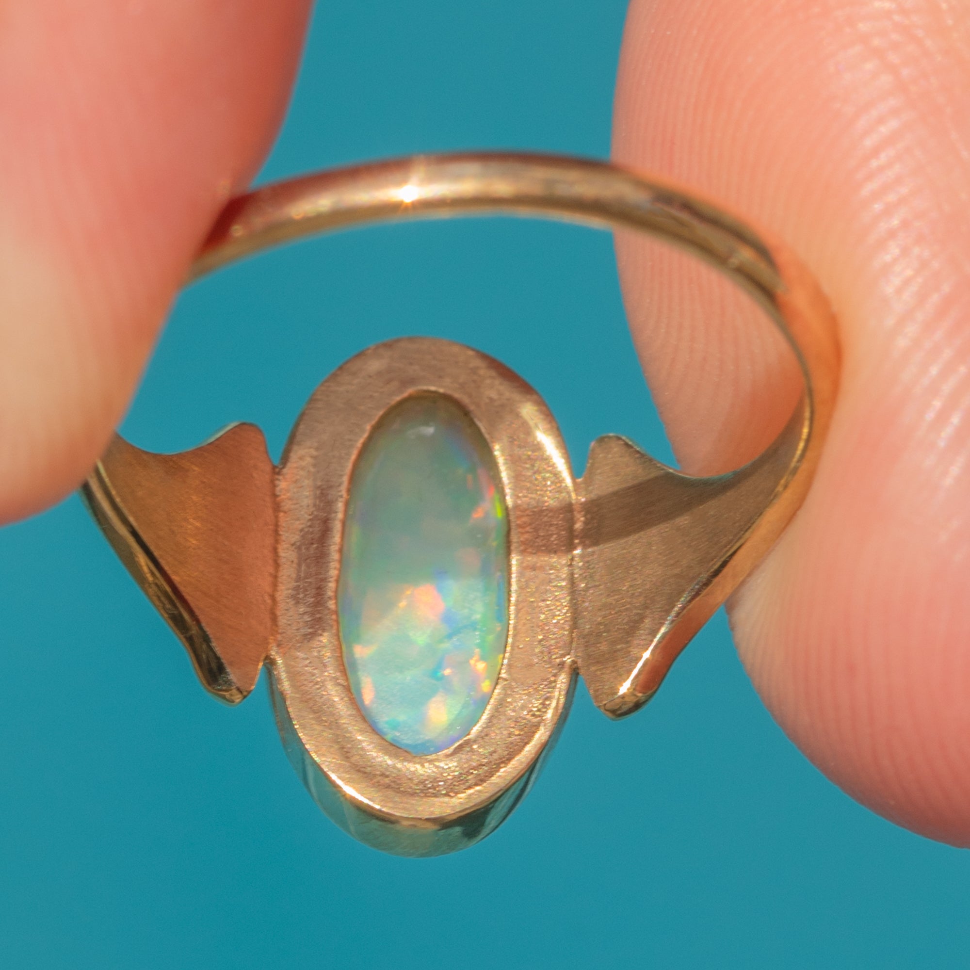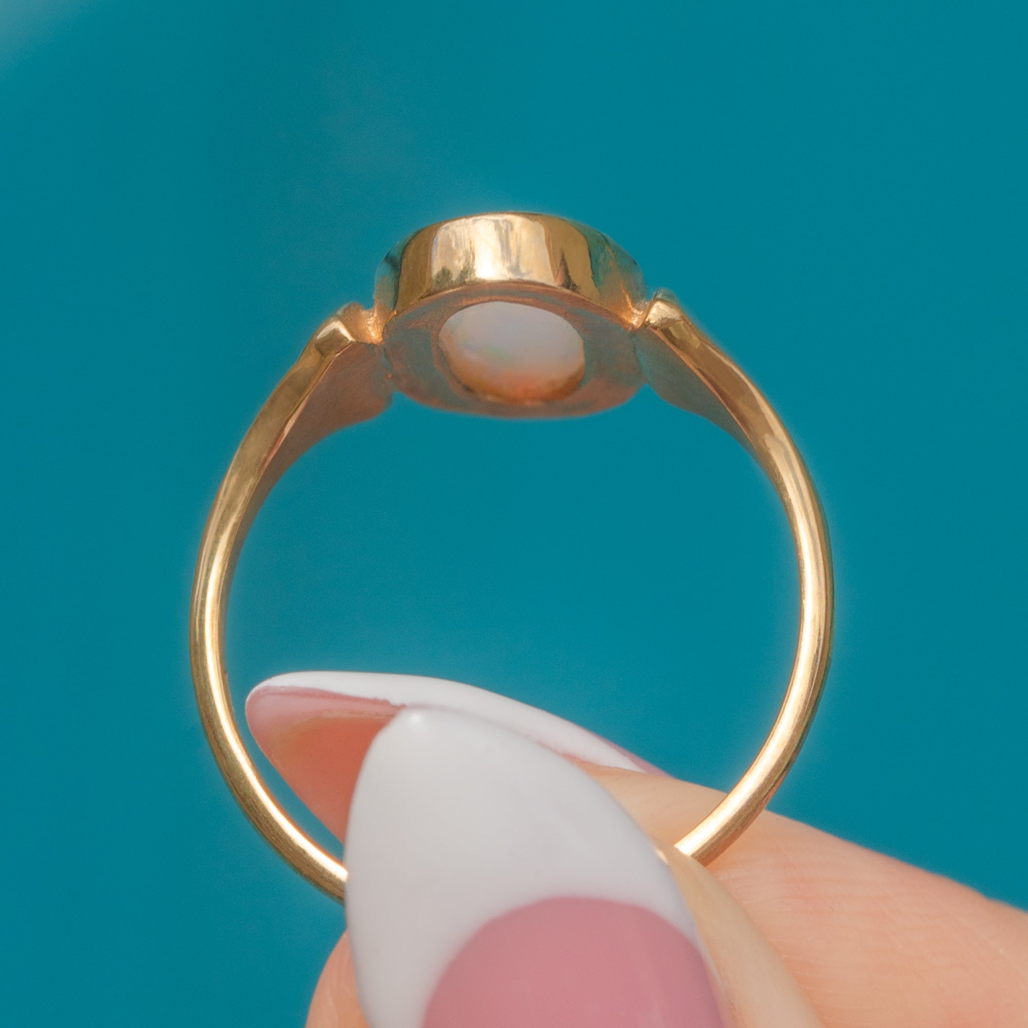 EXCELLENT: The Opal is free from any scuffs or scratches and is set securely within its bezel settings. The Gold is bright and glossy with only minor dings commensurate with age. Fully hallmarked and with little else to note, this vintage Opal ring is a must-have for your collection.