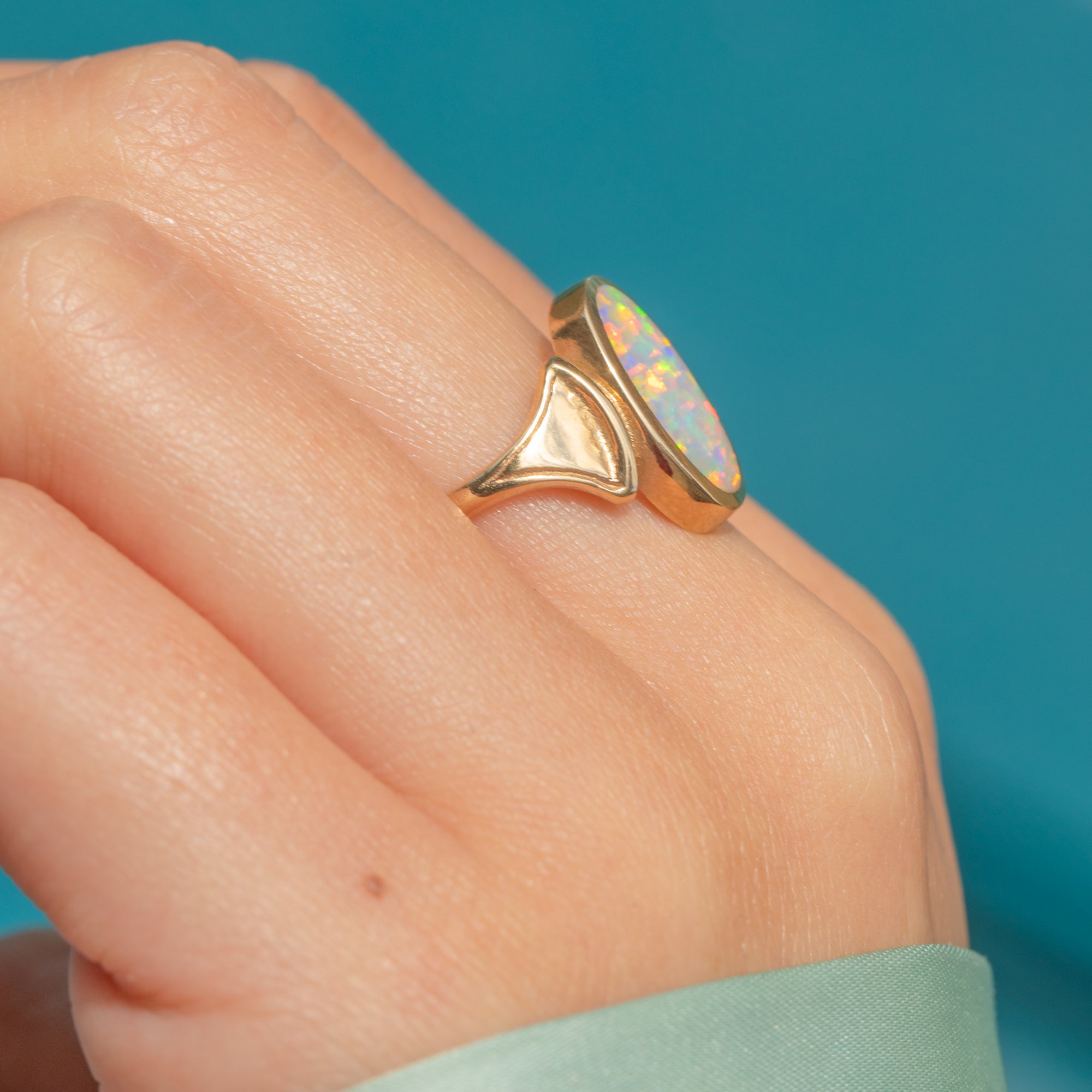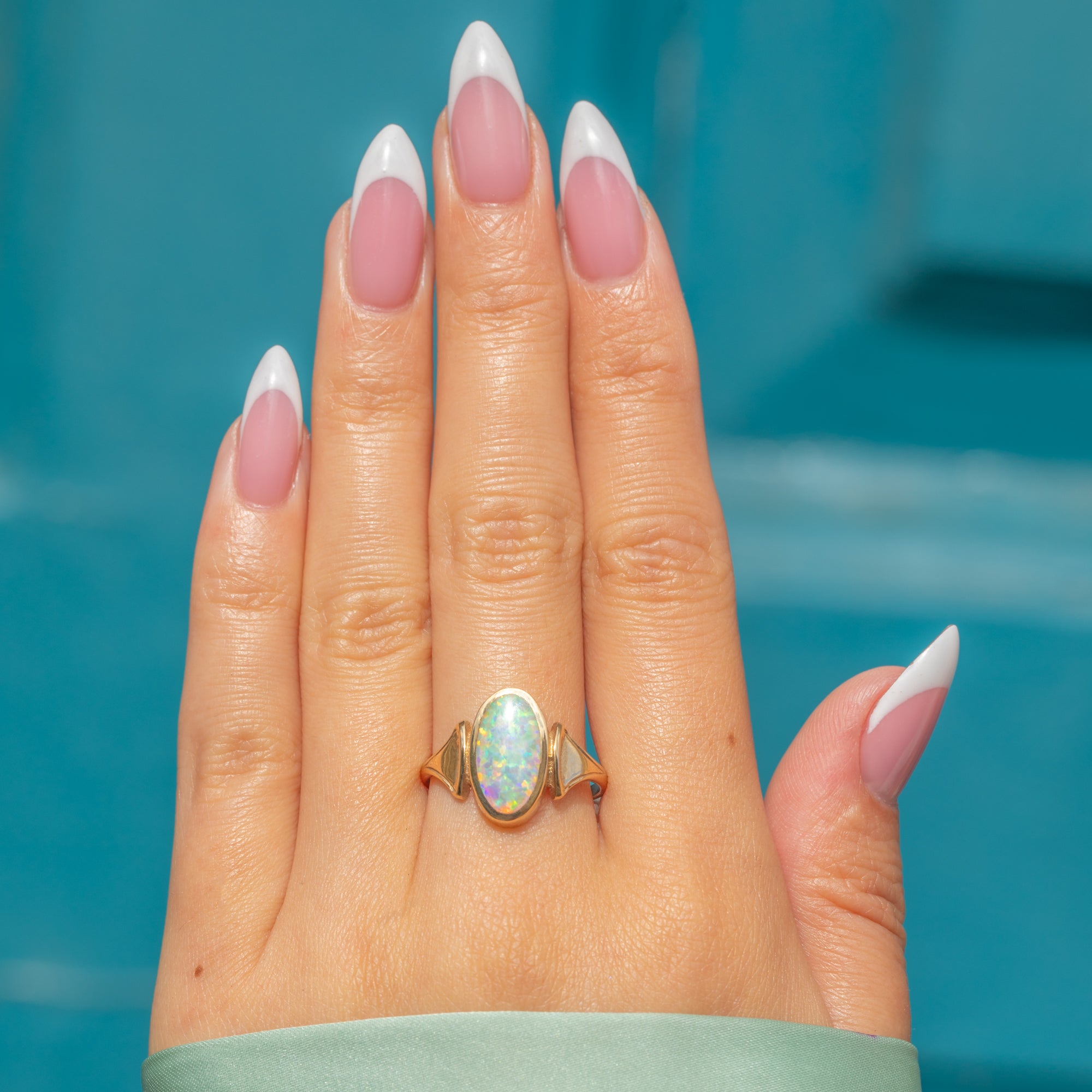 In its centre sits a dazzling confetti Opal glittered with a confetti display of striking blue, green and orange. The Opal is set in a glossy bezel, with its flat profile making this vintage ring the perfect everyday statement piece!