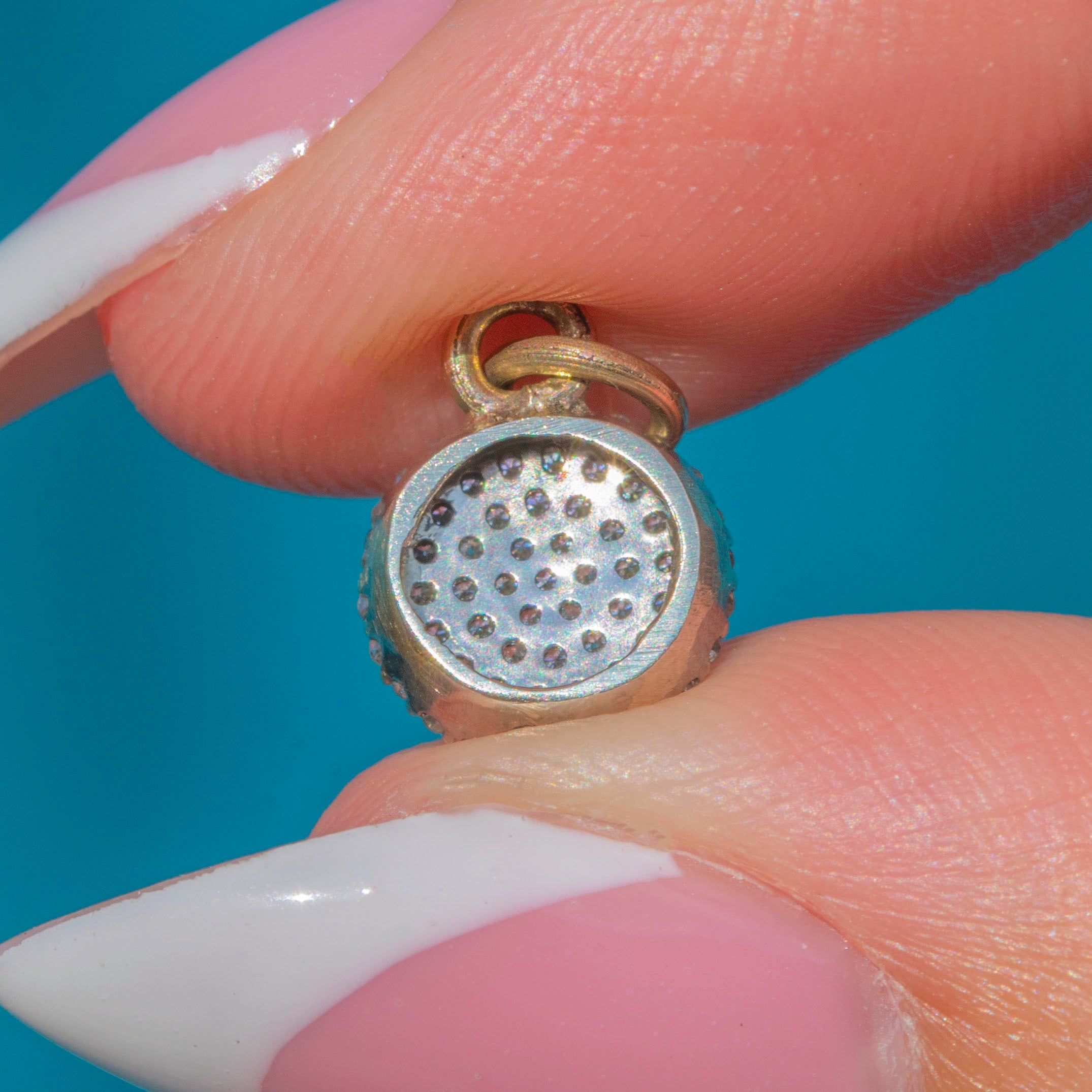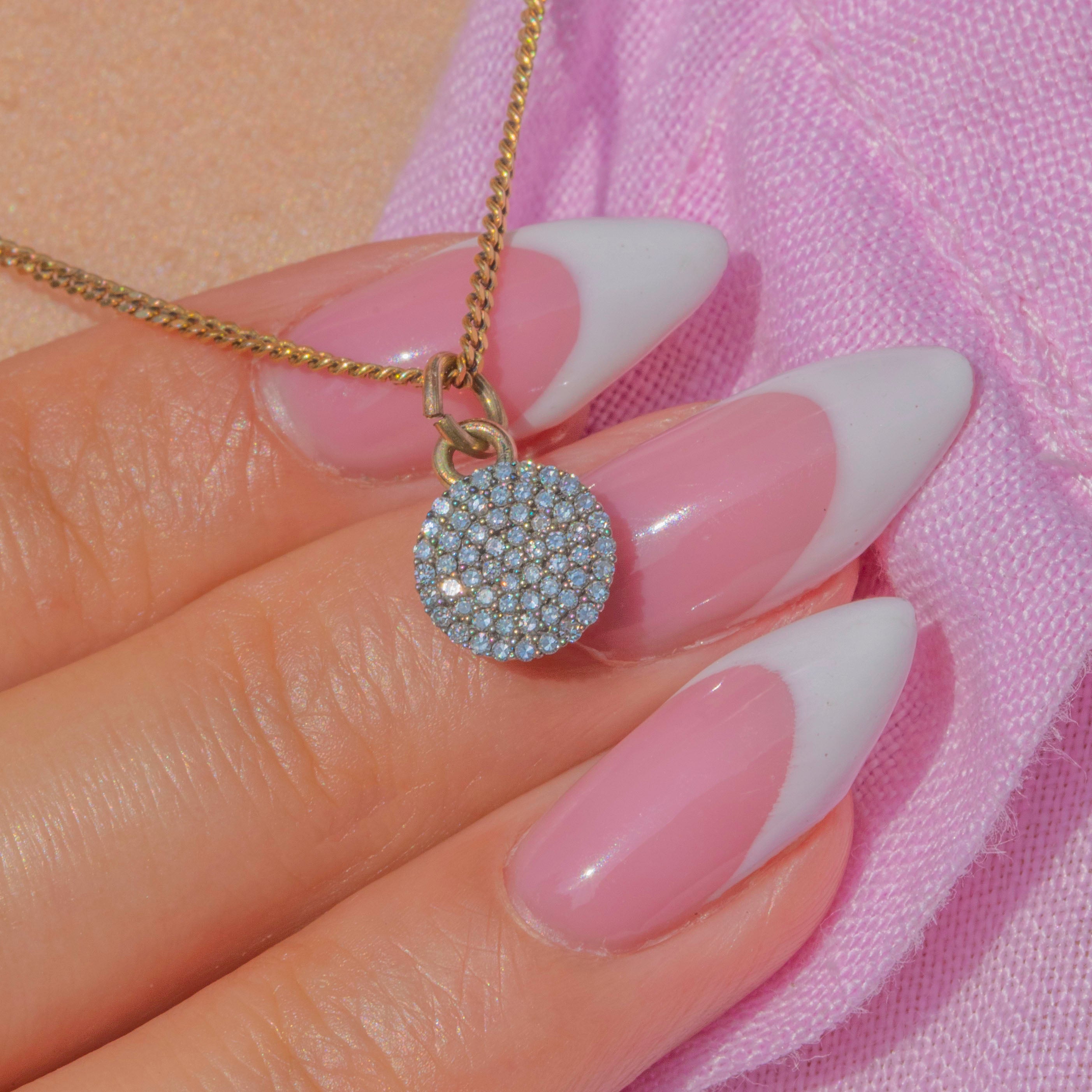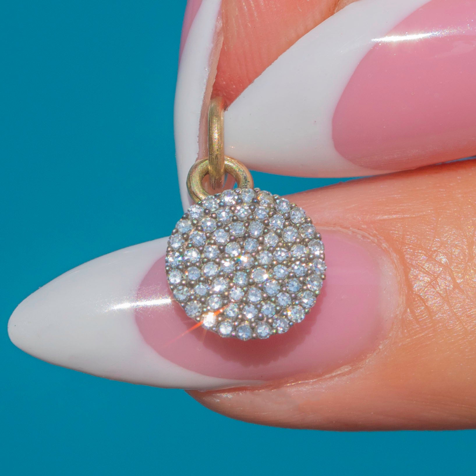 Crafted from 9ct Gold, this circular charm is adorned with an array of petite Diamonds, set in glossy 9ct White Gold providing a wonderful twinkle from all angles. Complete with a dainty jump ring, this delicate cluster charm is the perfect piece to add to your neck stack or curated bracelet.