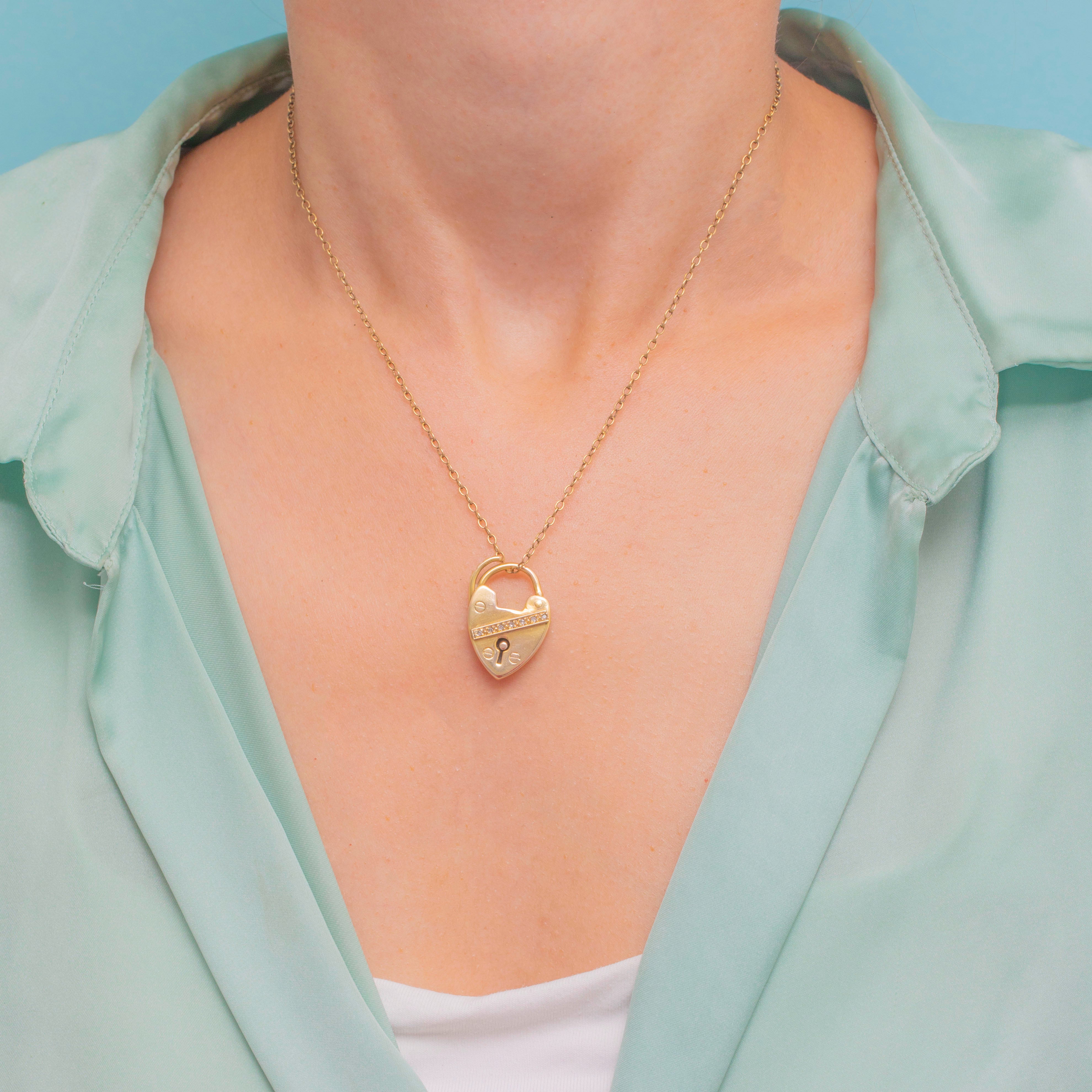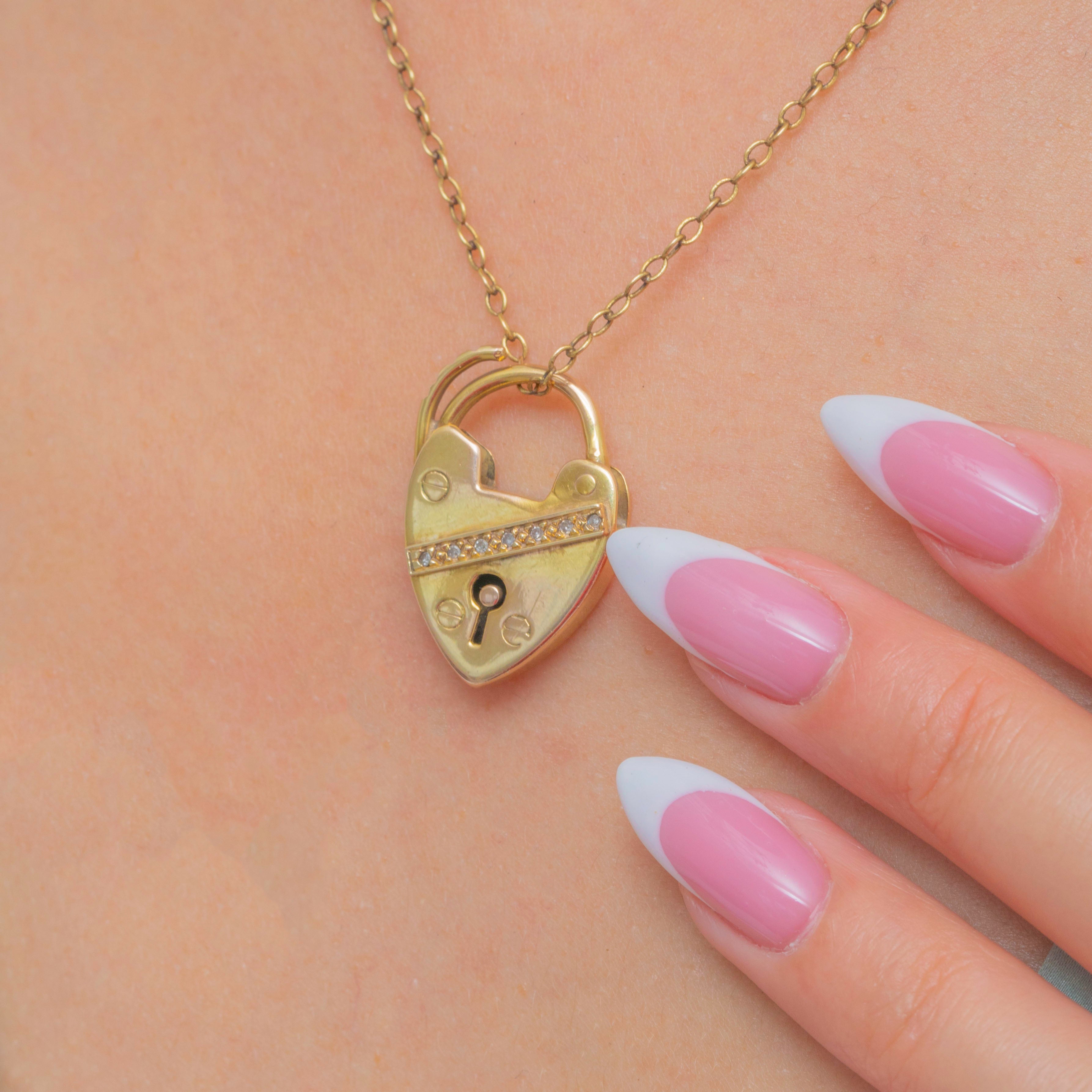 VERY GOOD-EXCELLENT: The Gold is bright and buttery, having been exceptionally formed and with only minor surface scratches. Each Diamond is bright and set securely. With the lever in good working order, this vintage padlock pendant can be worn with confidence.