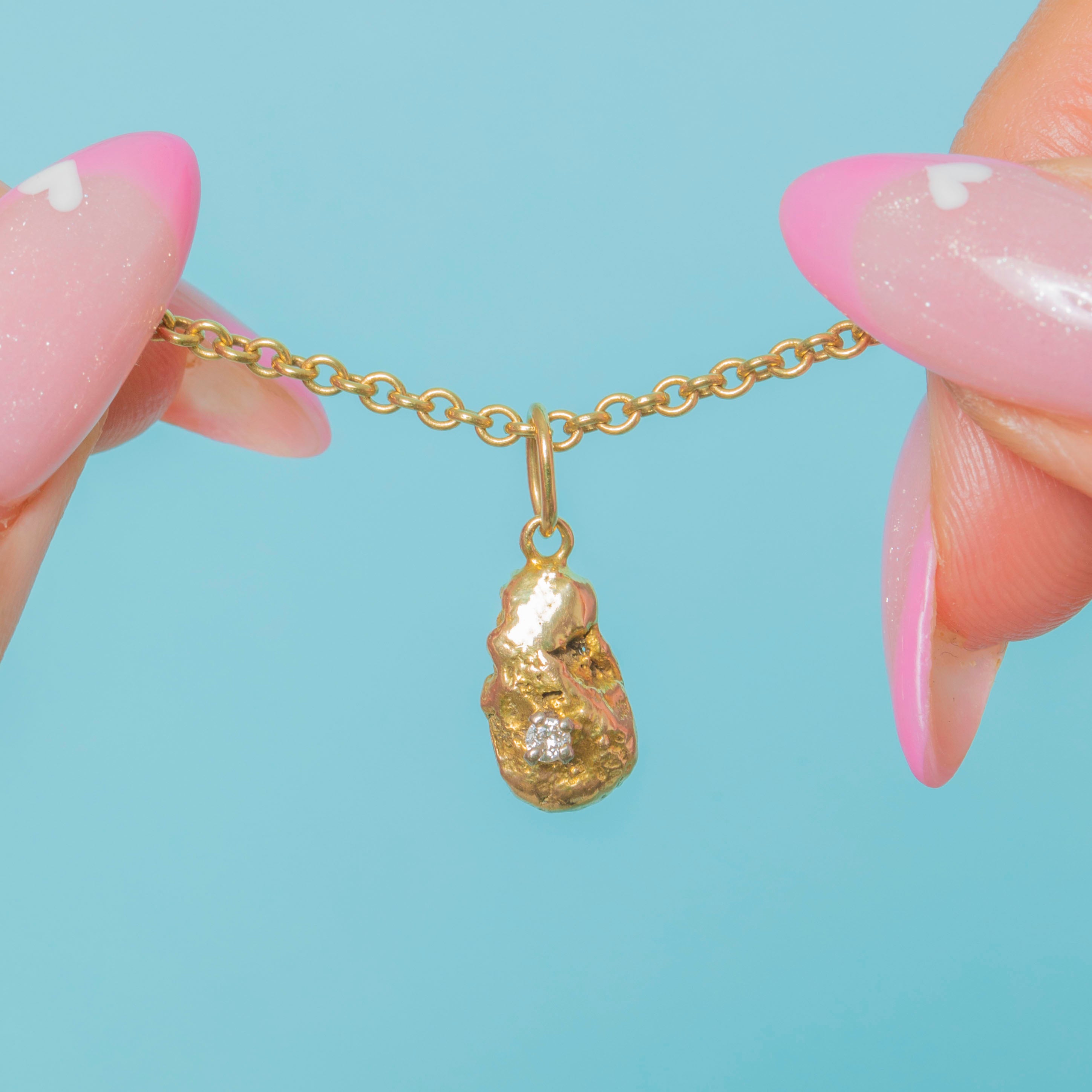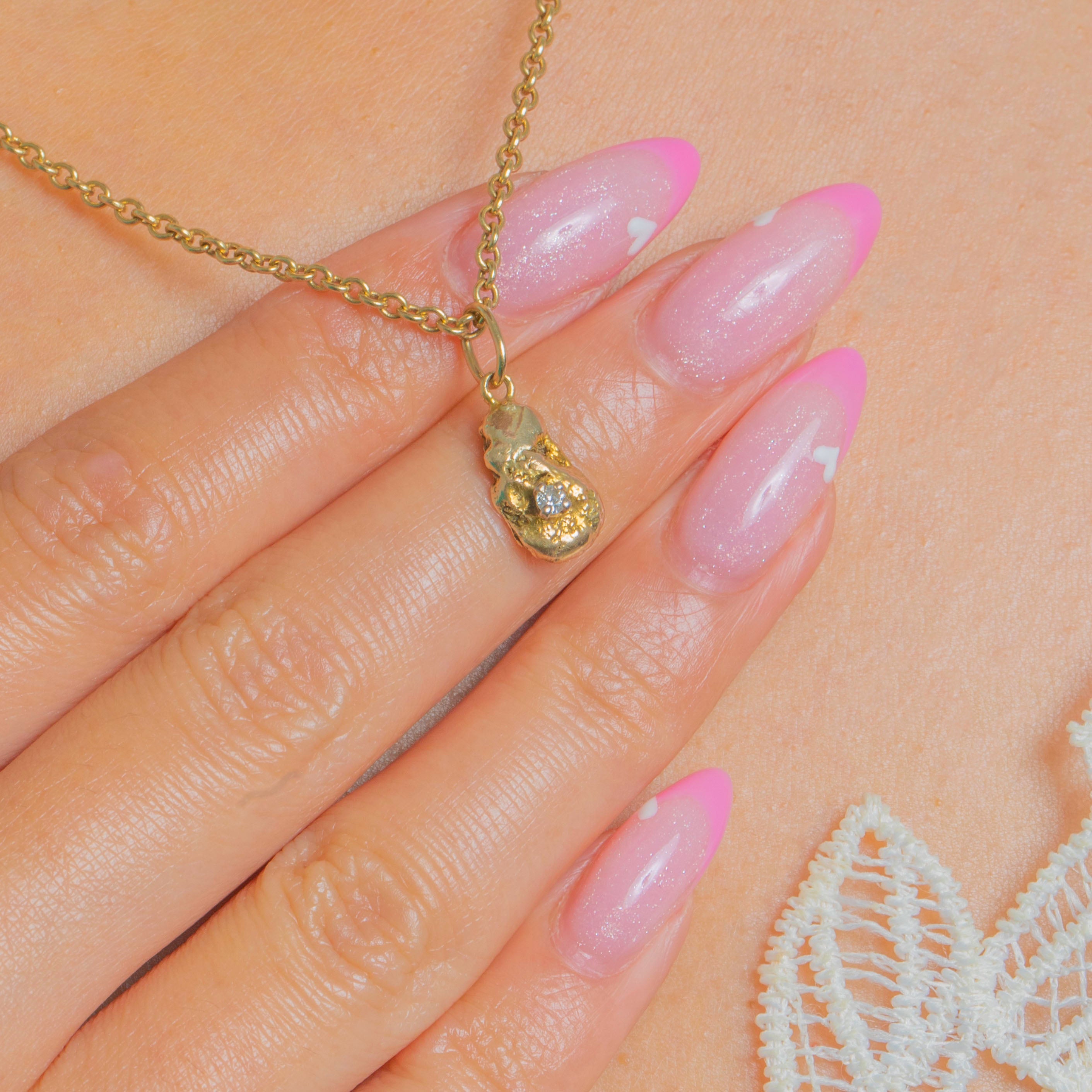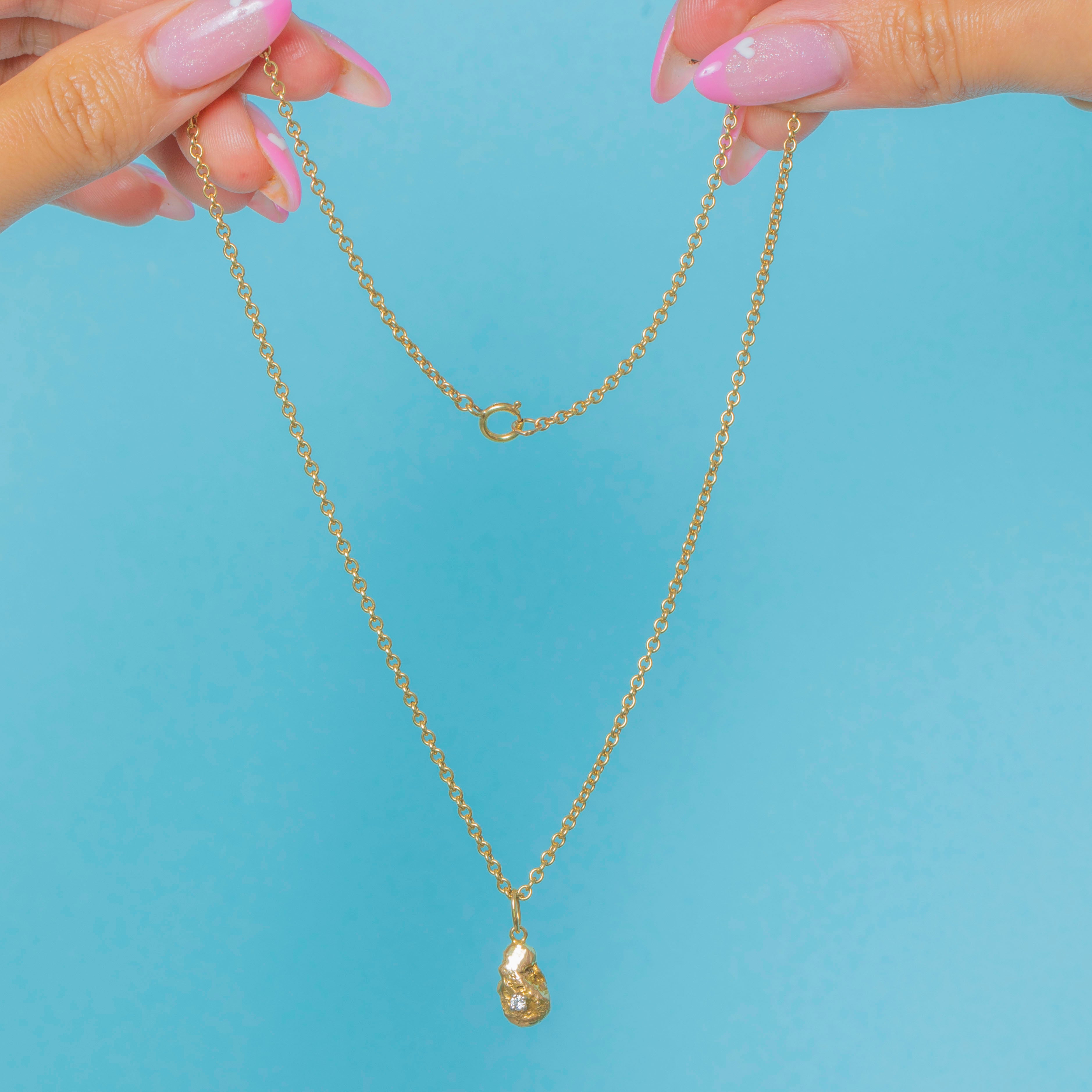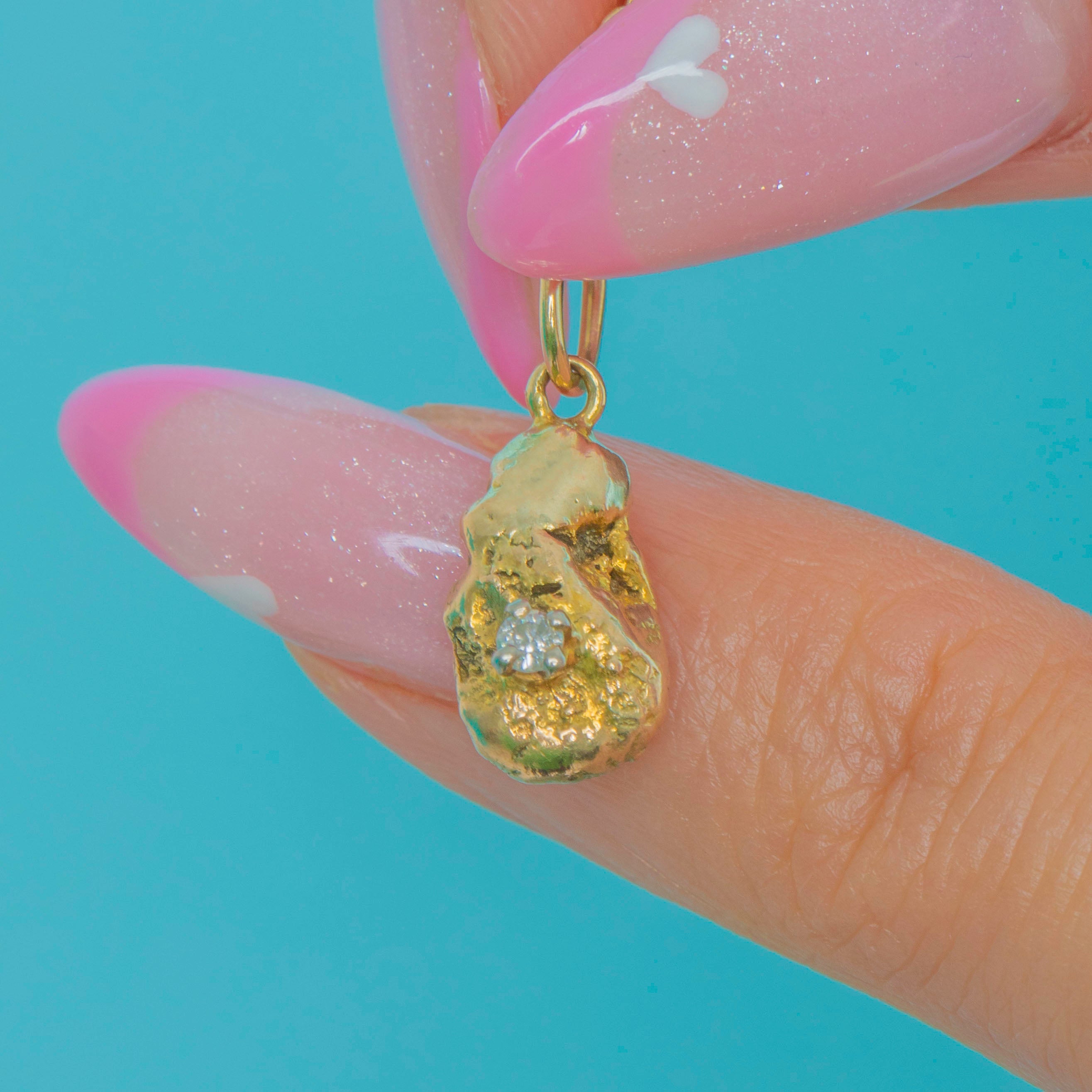 A striking 1980s 9ct Gold nugget pendant with a sparkling Diamond accent, suspended from a fine 15" chain. The textured Gold surface catches the light beautifully, enhanced by the brilliant-cut Diamond set at the centre.