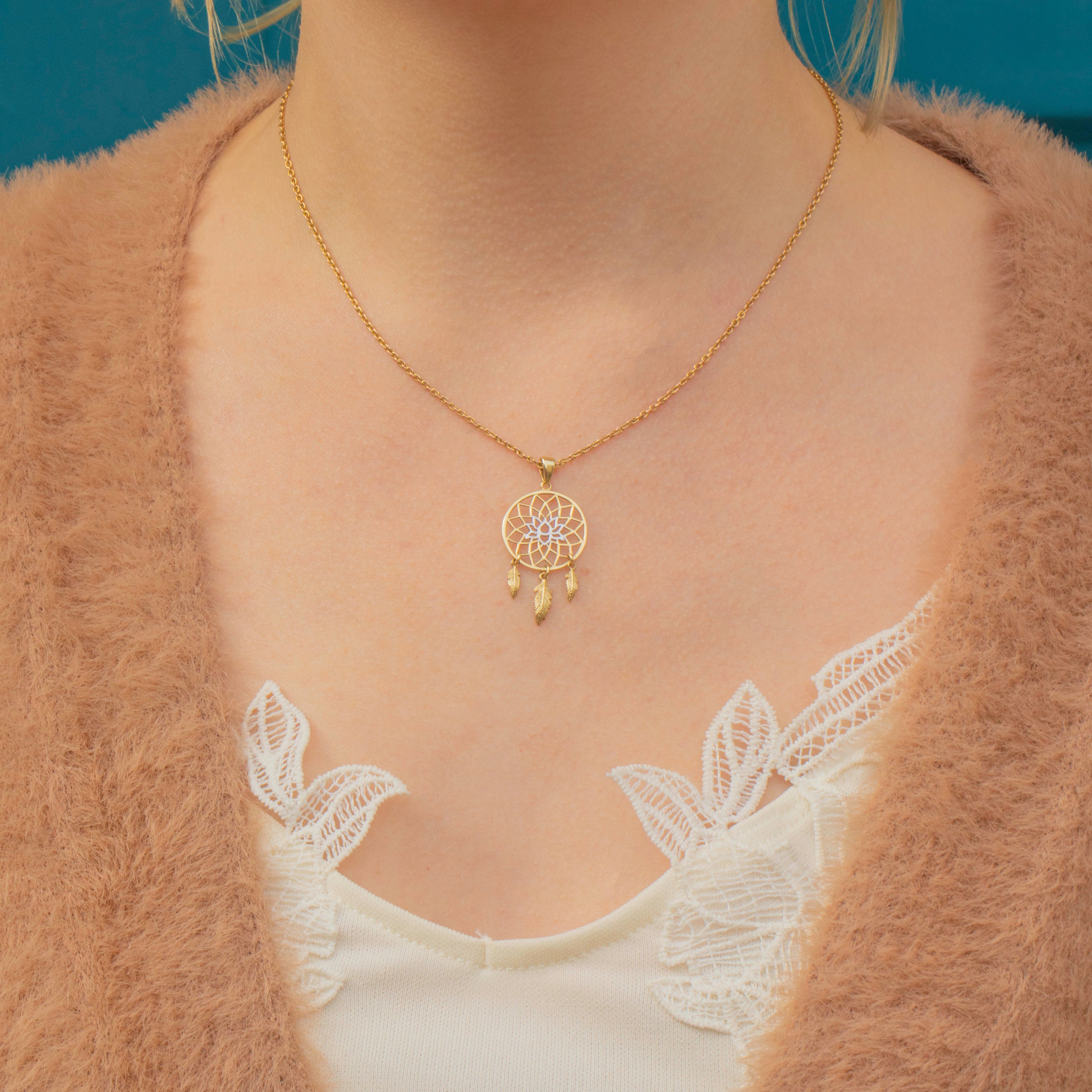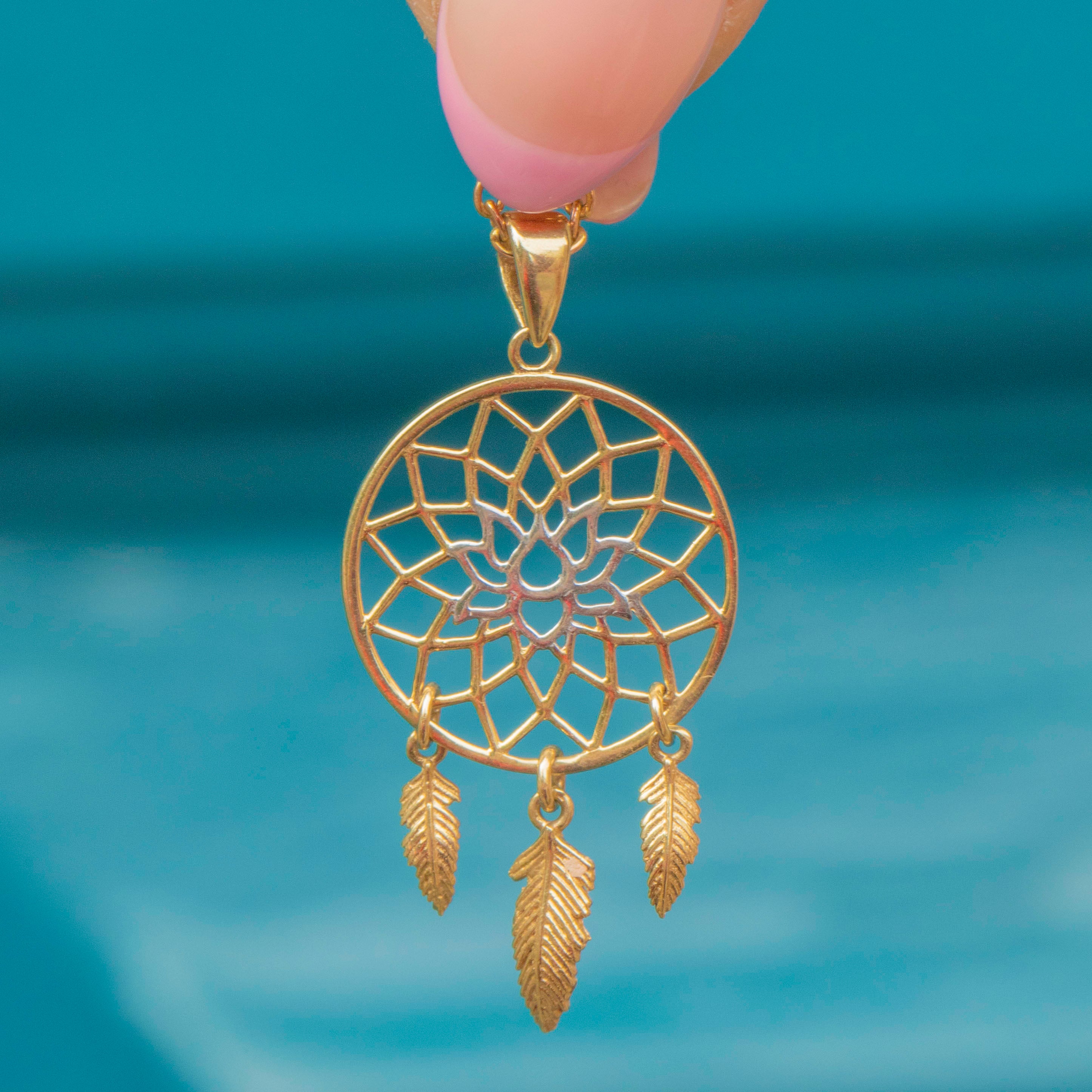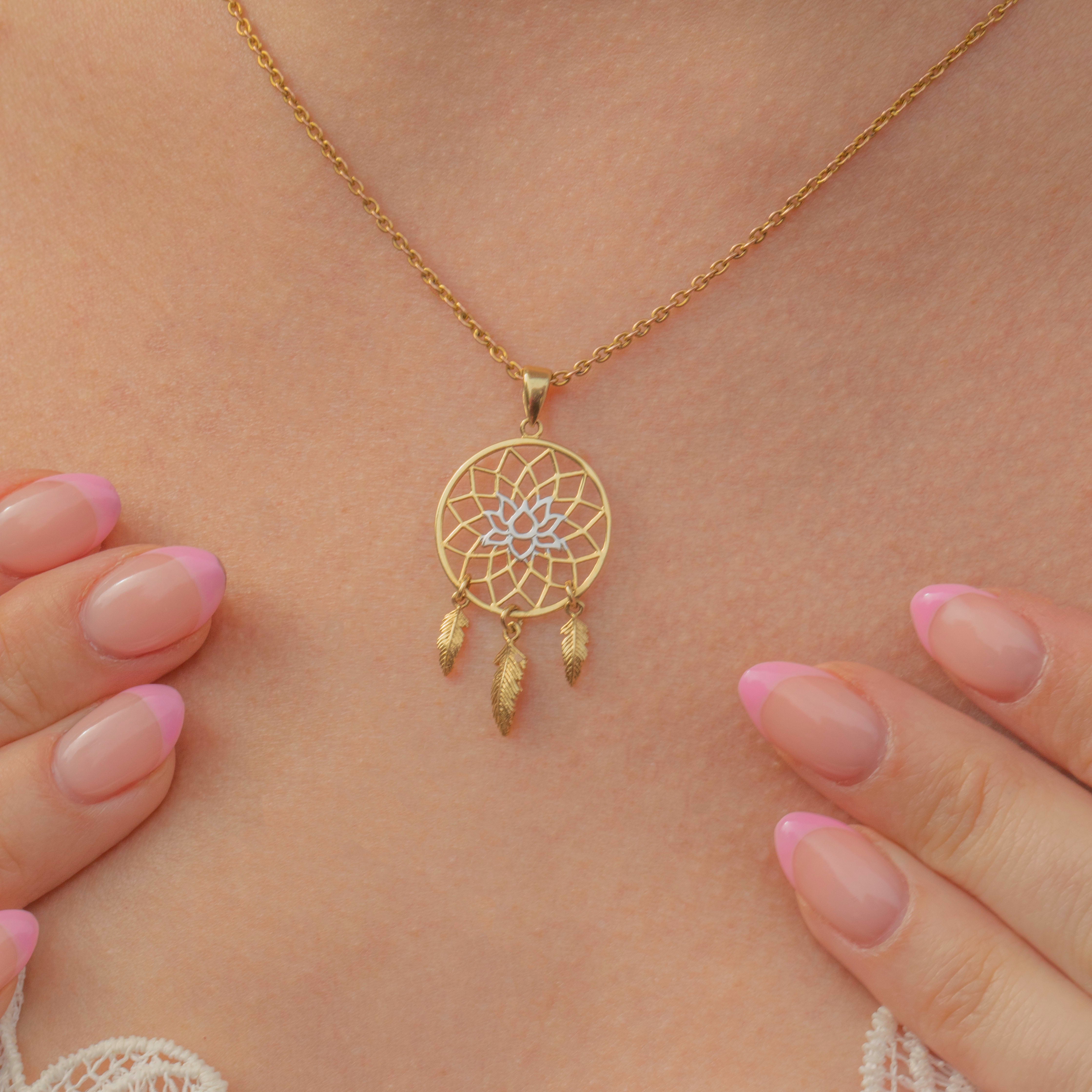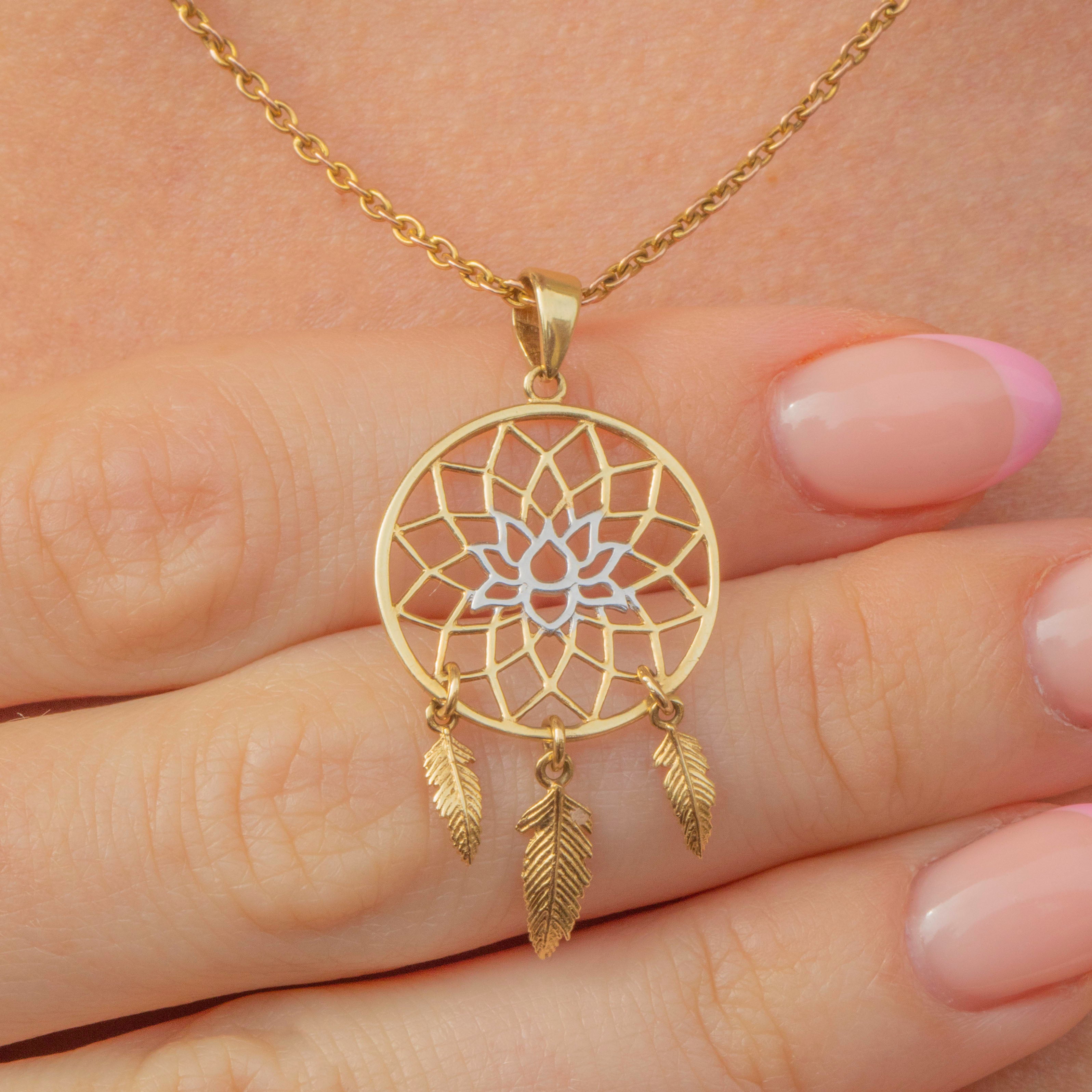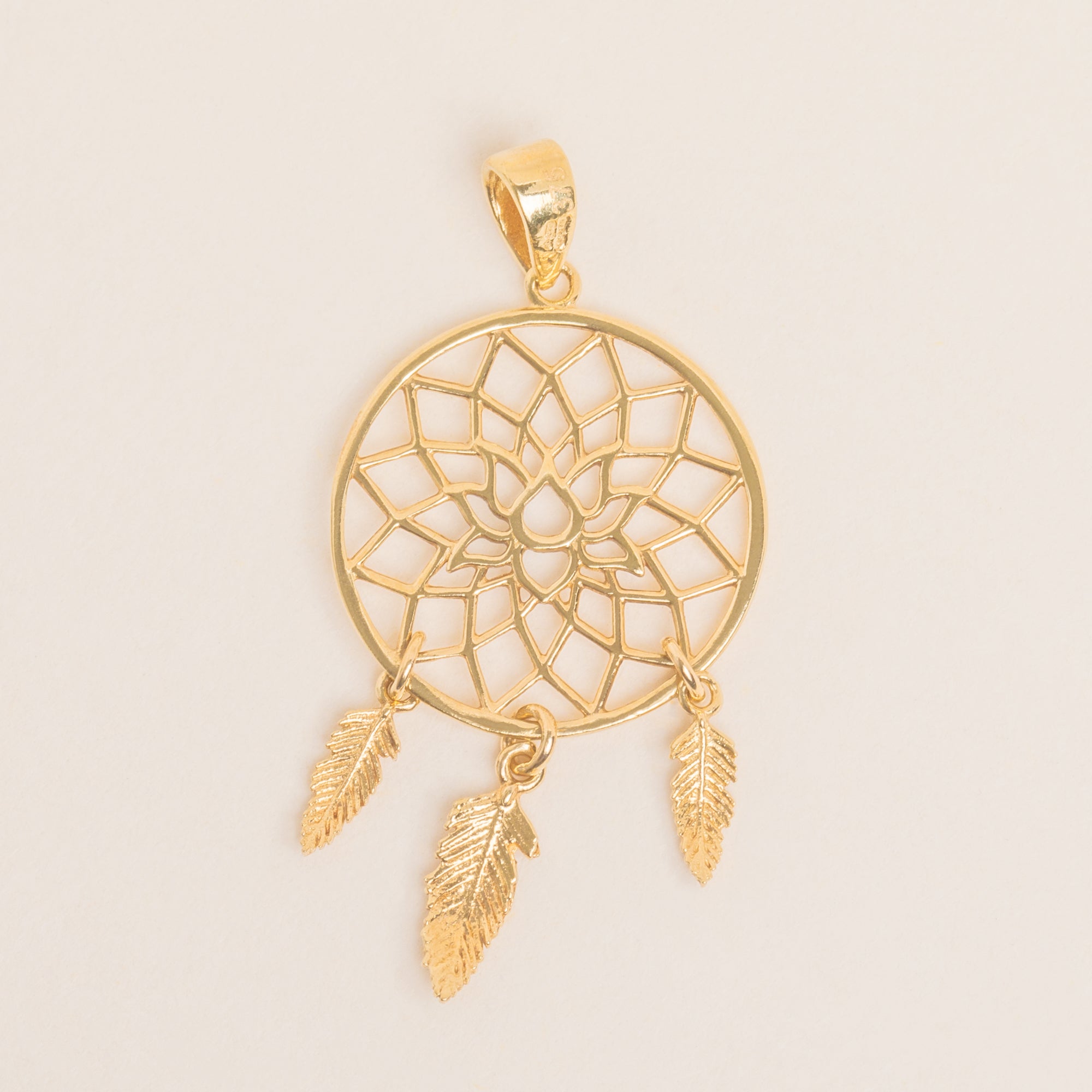 Live out your 70s bohemian fantasy with this 9ct Gold dreamcatcher pendant! Crafted from honey-hued 9ct Gold, she boasts three delicate feather charms dangling from her main circular charm: she is infused with soulful spirit.