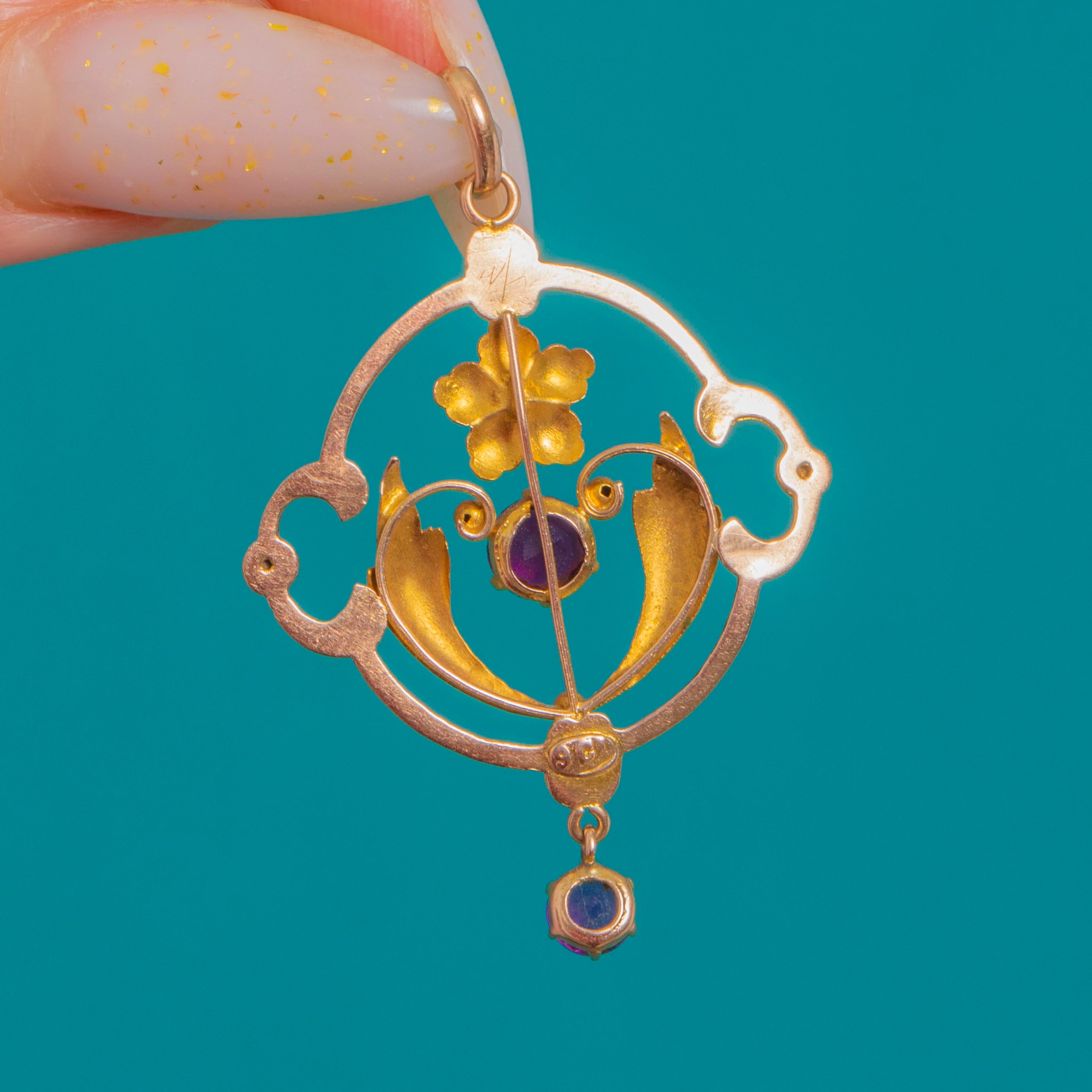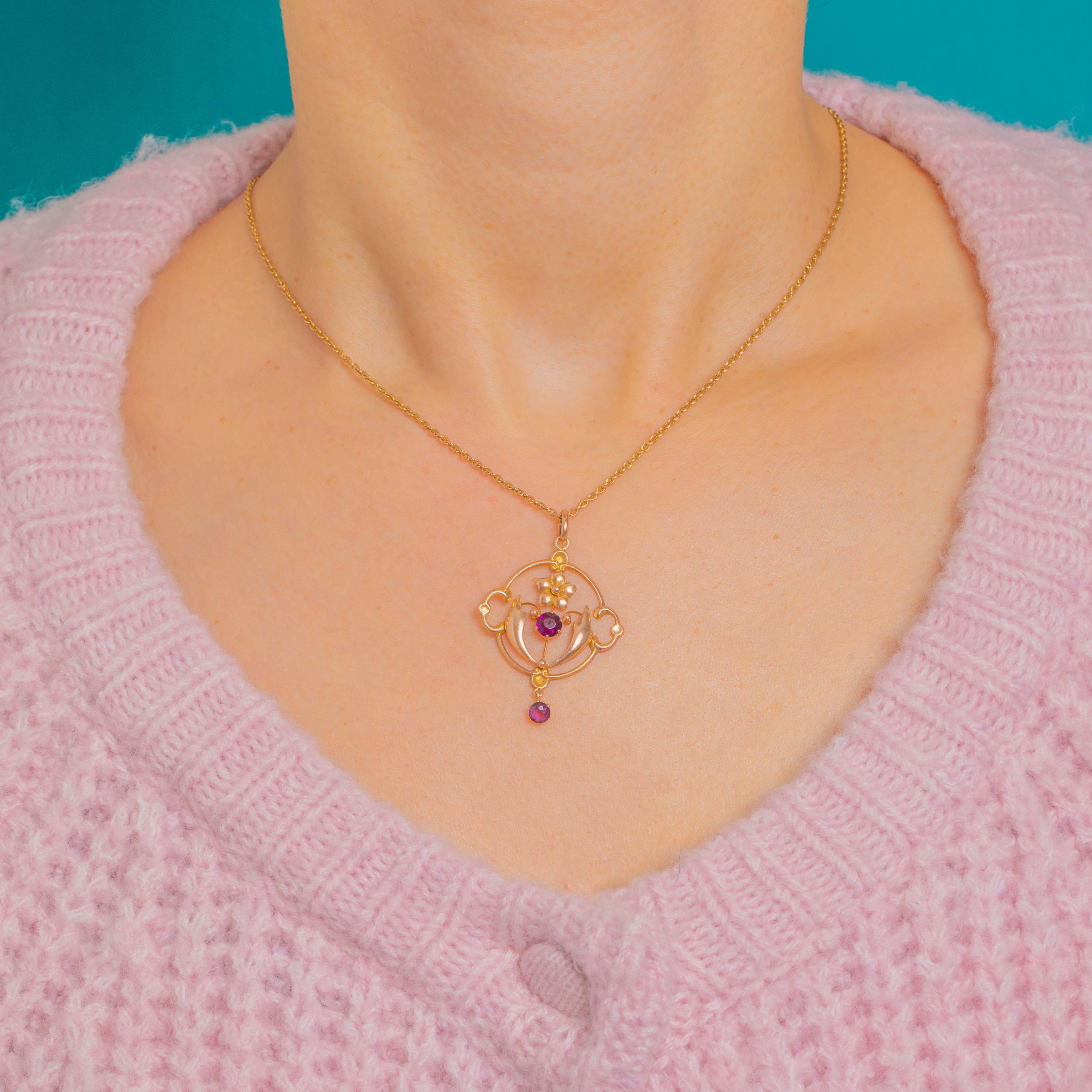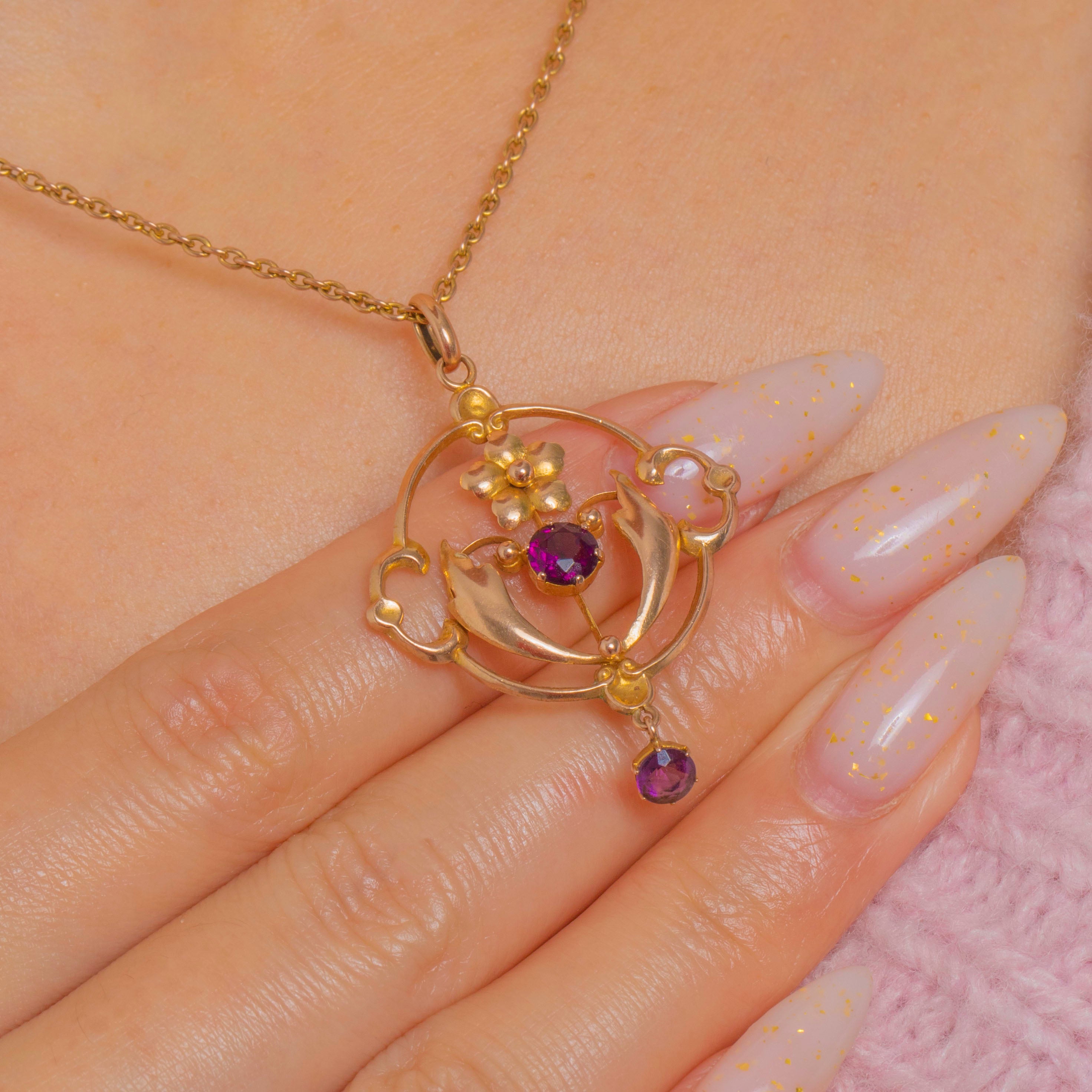 Delicately crafted in warm 9ct Gold, this Edwardian openwork pendant is a love letter to lace-like design and floral beauty. A cluster of Natural Amethysts bring a soft, romantic glow, their vivid hues framed by graceful scrolls and airy negative space for an elegant, featherlight feel.
