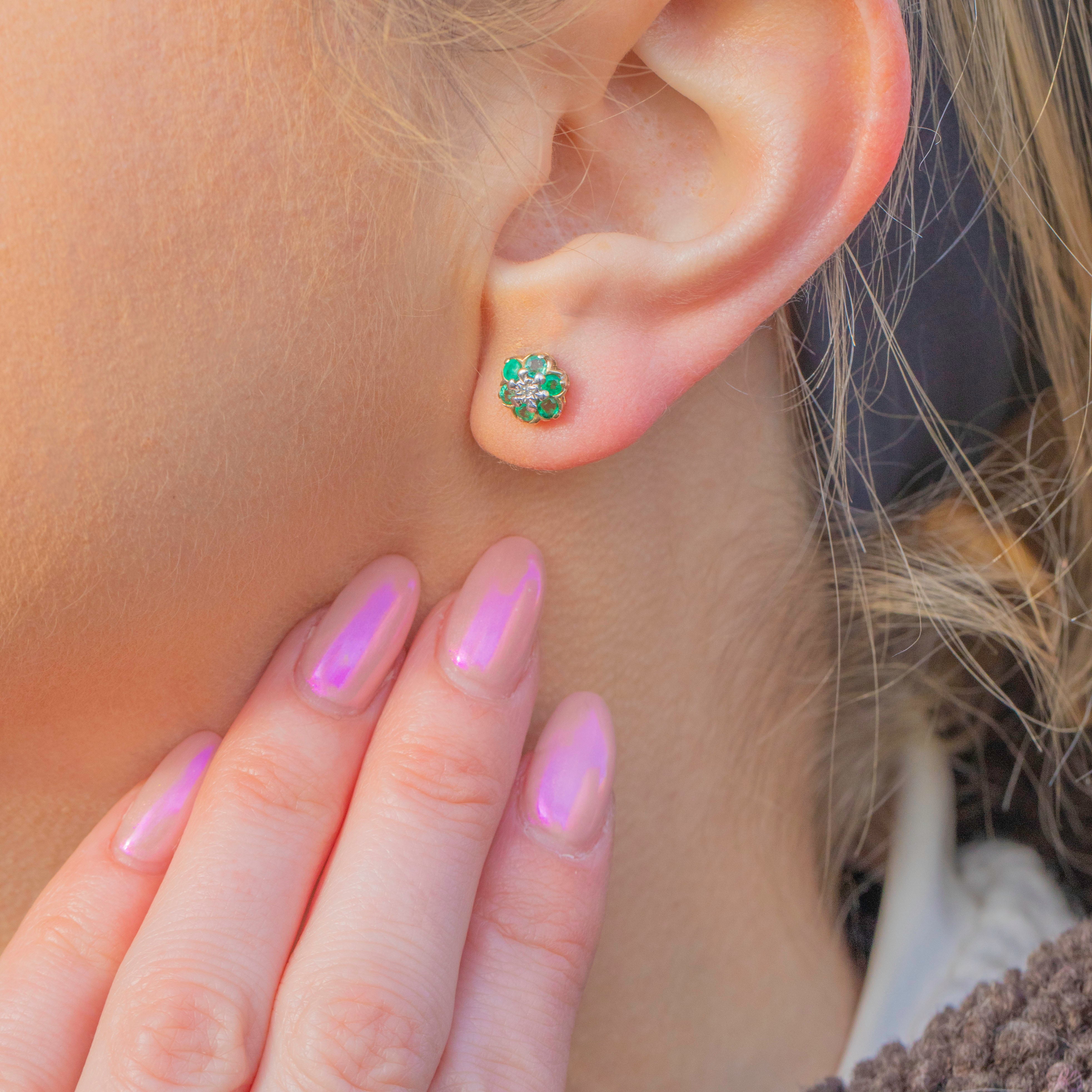 These charming vintage stud earrings feature a cluster of vibrant green Emeralds, arranged as a halo of petals around a twinkling central Diamond, creating a gorgeous floral motif.
