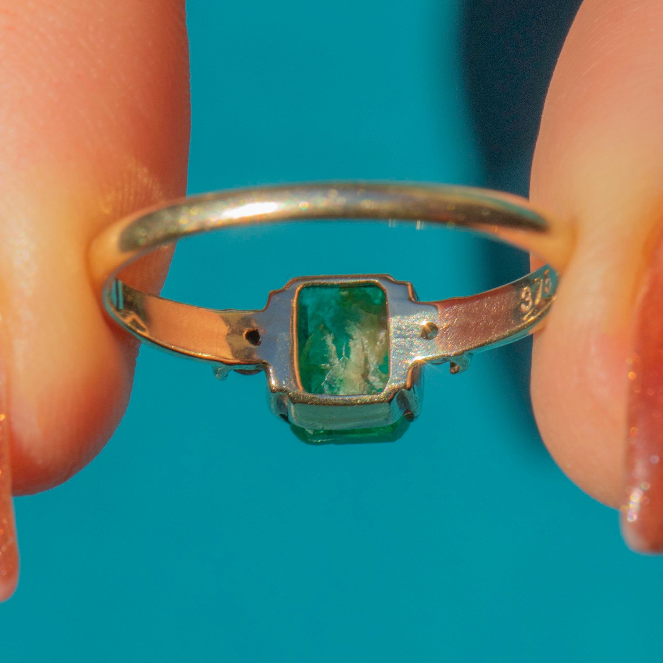 VERY GOOD: This 9ct Gold Emerald and Diamond ring is in very good condition. Each of her gemstones are radiant and set securely within their settings. There are some fleabites to the Emerald, though this is difficult to spot without a loupe. There is also a slight thinning towards the back of the band, however she remains secure. In very good condition, she is a must-have.