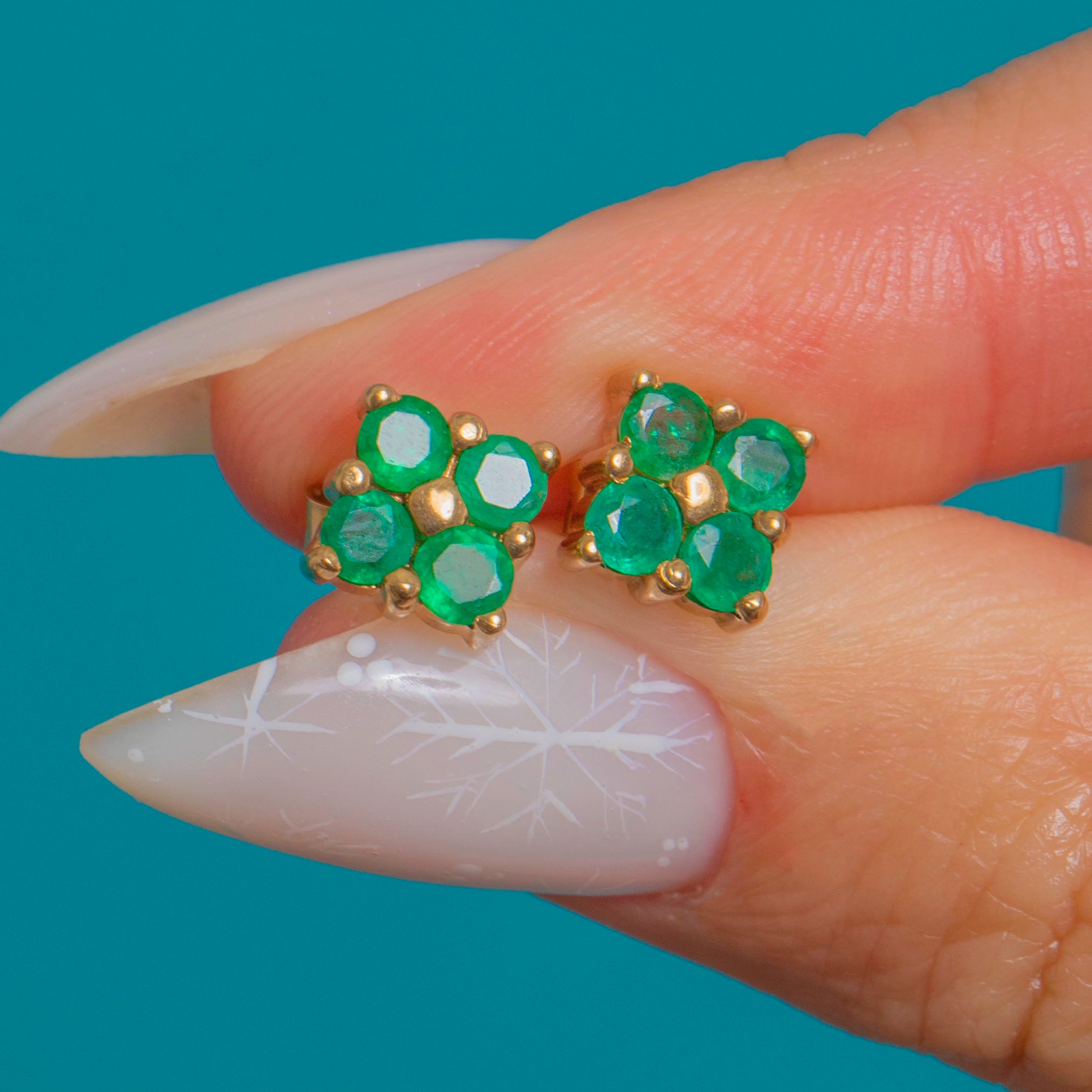 Perfectly petite and beautifully bright, these Vintage 9ct Gold Emerald flower studs are a timeless everyday luxury. Each earring forms a four‑leaf clover/quatrefoil with vivid green Emeralds circling a domed Gold bead, the open backs inviting light through for a lively glow.