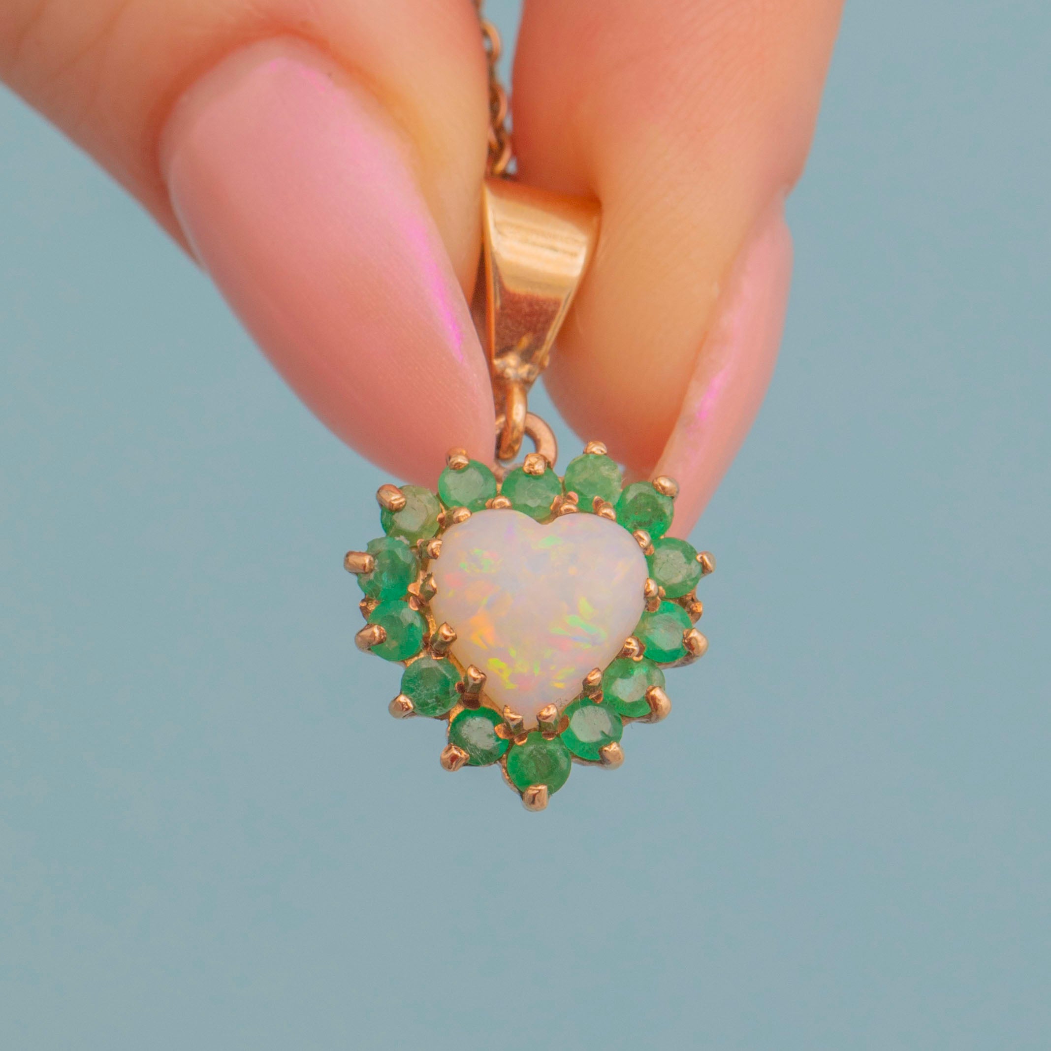 EXCELLENT This 9ct Gold Emerald Opal Heart Cluster charm is in excellent condition, with both the Opal and Emeralds retaining their vibrant, natural beauty. The 9ct Gold setting shows minimal surface wear, maintaining a polished and radiant finish. Her craftsmanship is impeccable, and the charm loop is secure and ready for wear.
