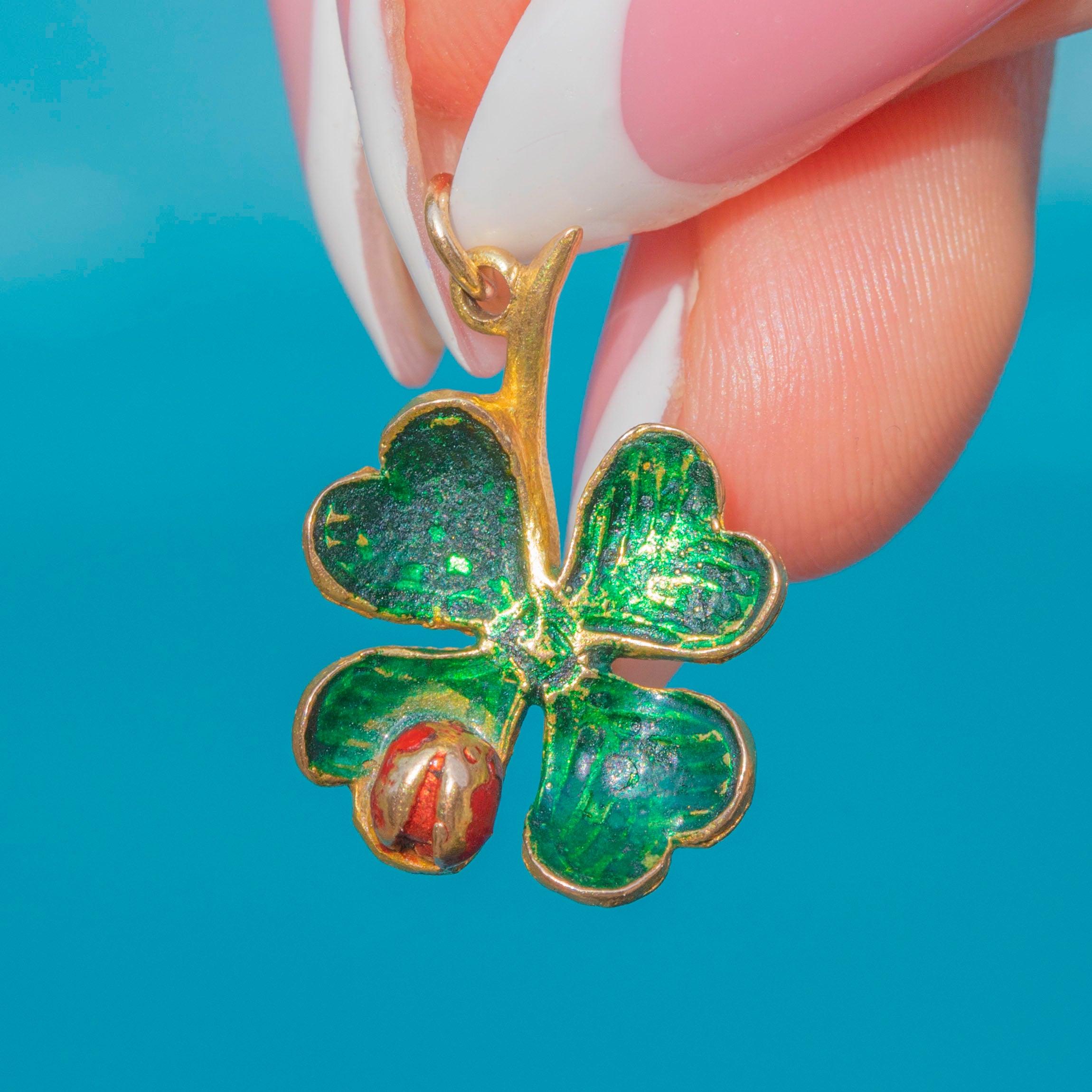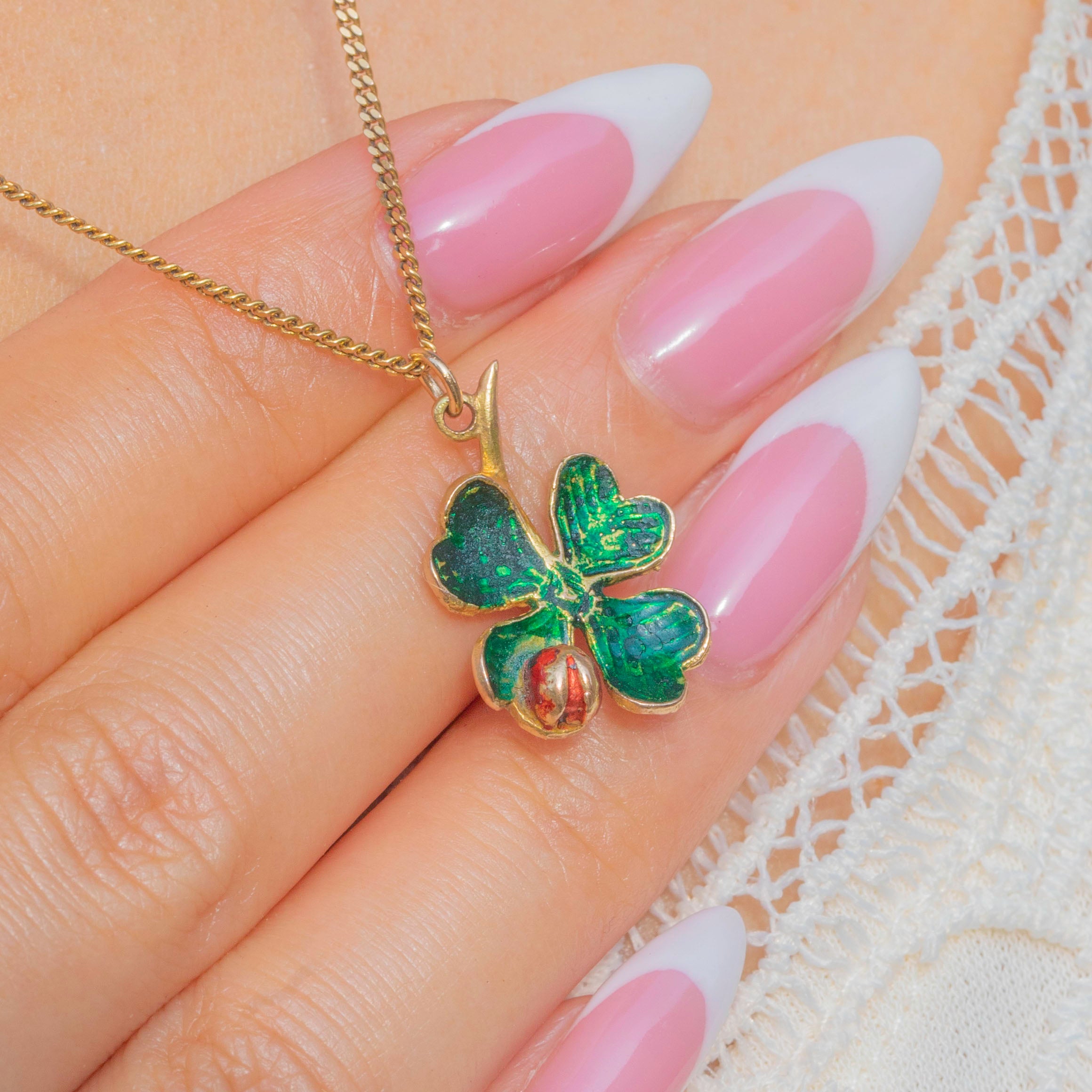 This charming Mid-Century Vintage pendant features a four-leaf Clover adorned with vibrant green enamel and a small Ladybird detail, set in 9ct Gold.