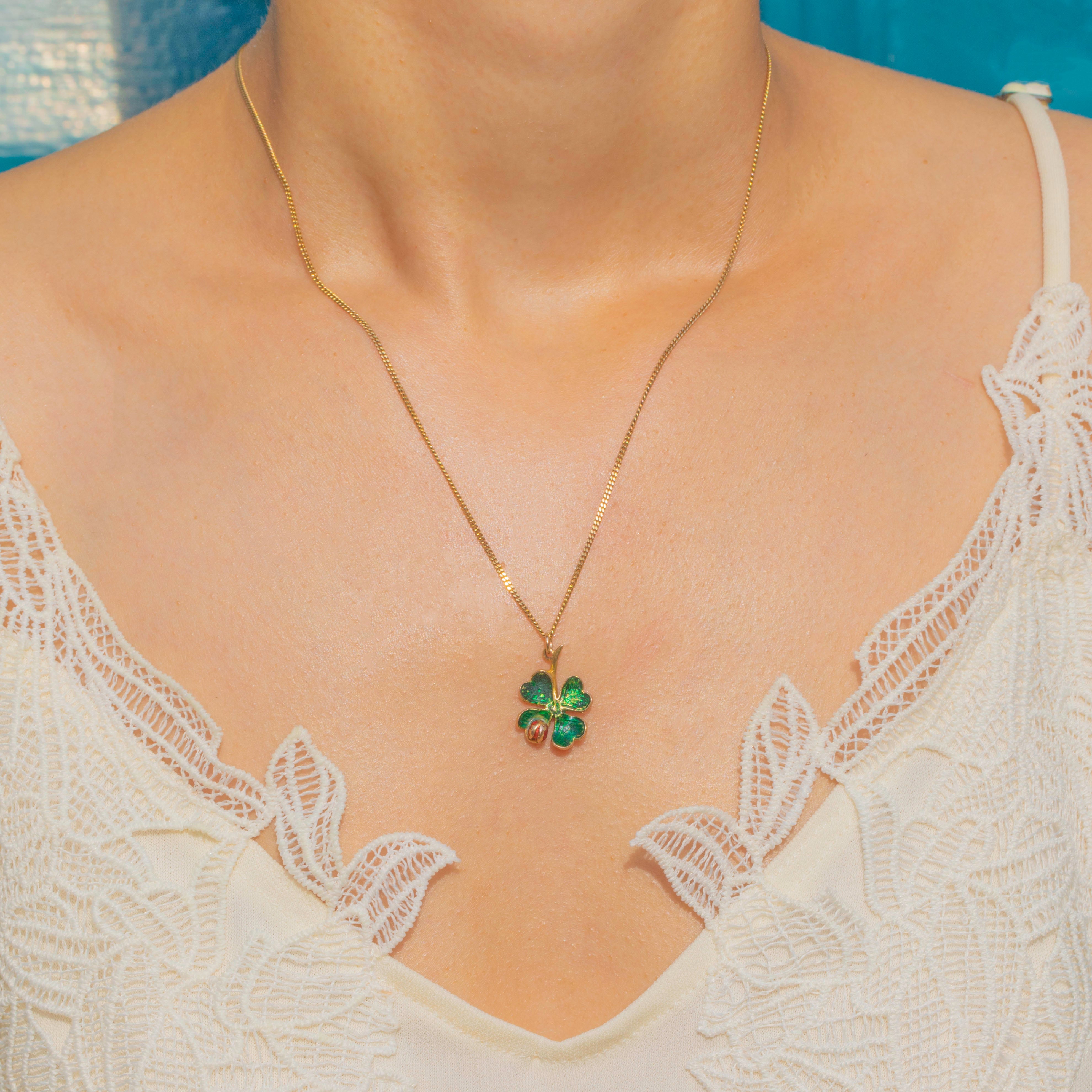 VERY GOOD: The enamel shows minor fading, particularly on the Clover leaves, but the pendant remains bright and well cared for. The Gold setting is intact and polished.