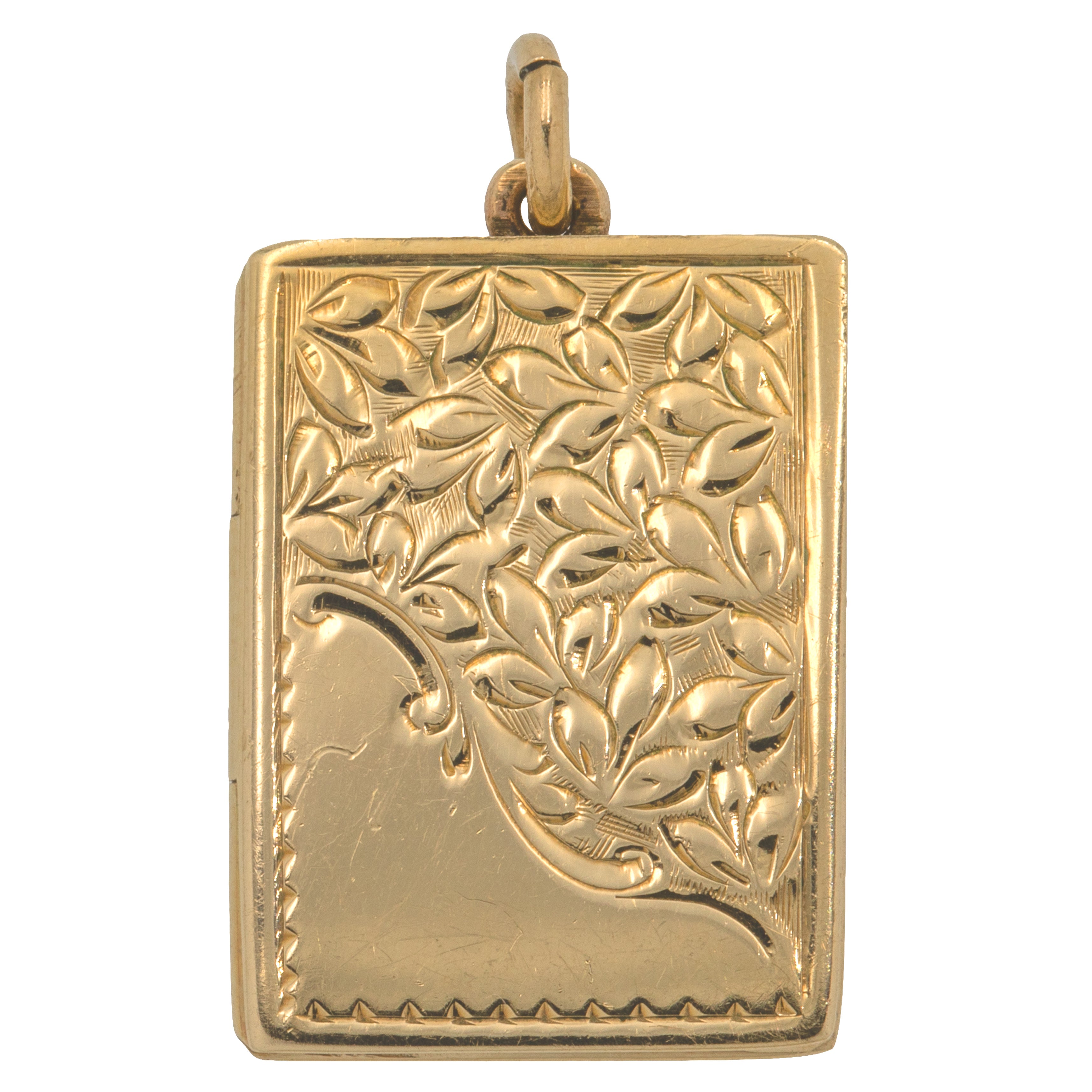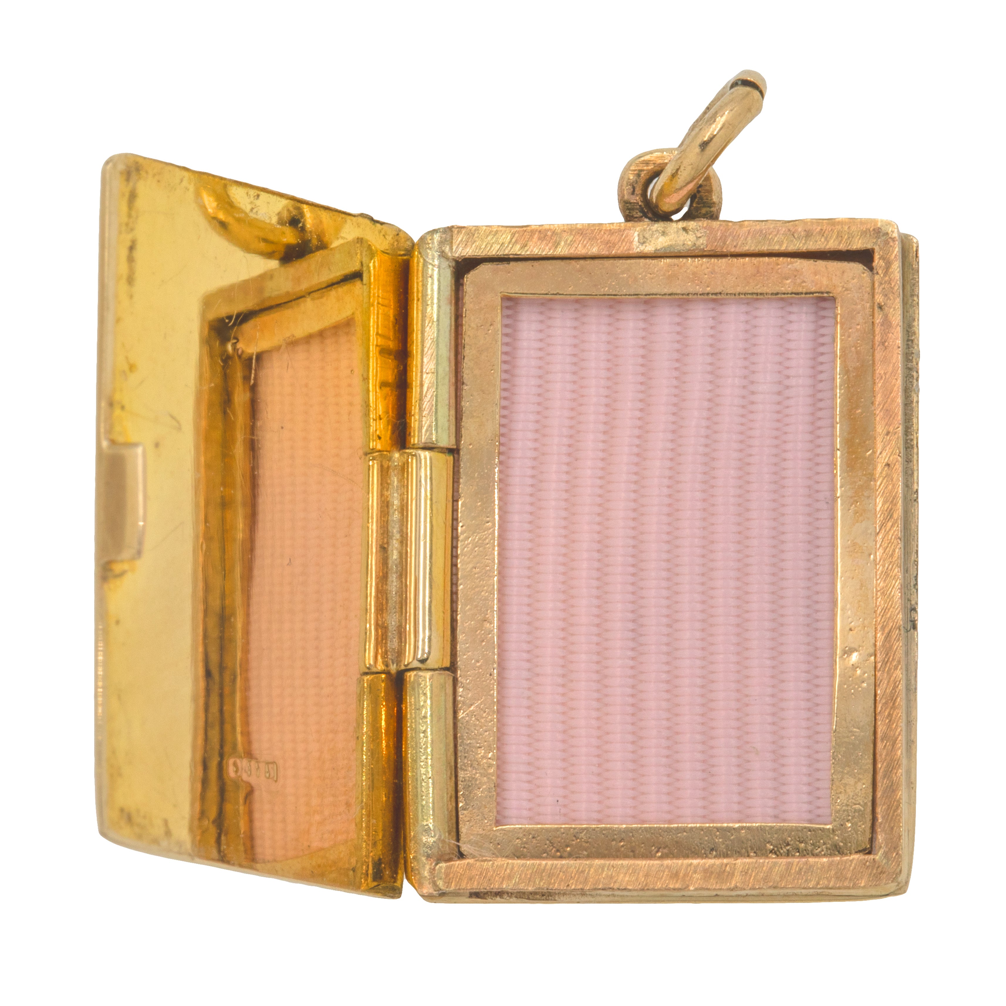 VERY GOOD-EXCELLENT. This 9ct Gold engraved book locket is in wonderful condition throughout. The Gold is buttery and the engraved details and the full set of hallmarks have all remained crisp. There is some general age-related wear throughout, but there are no dings or dents on the locket and its form has retained its shape well. The hinge is in perfect working order and the locket closes with a "click". With a frame inside, you can easily personalise this pretty vintage locket by placing a photograph inside!
