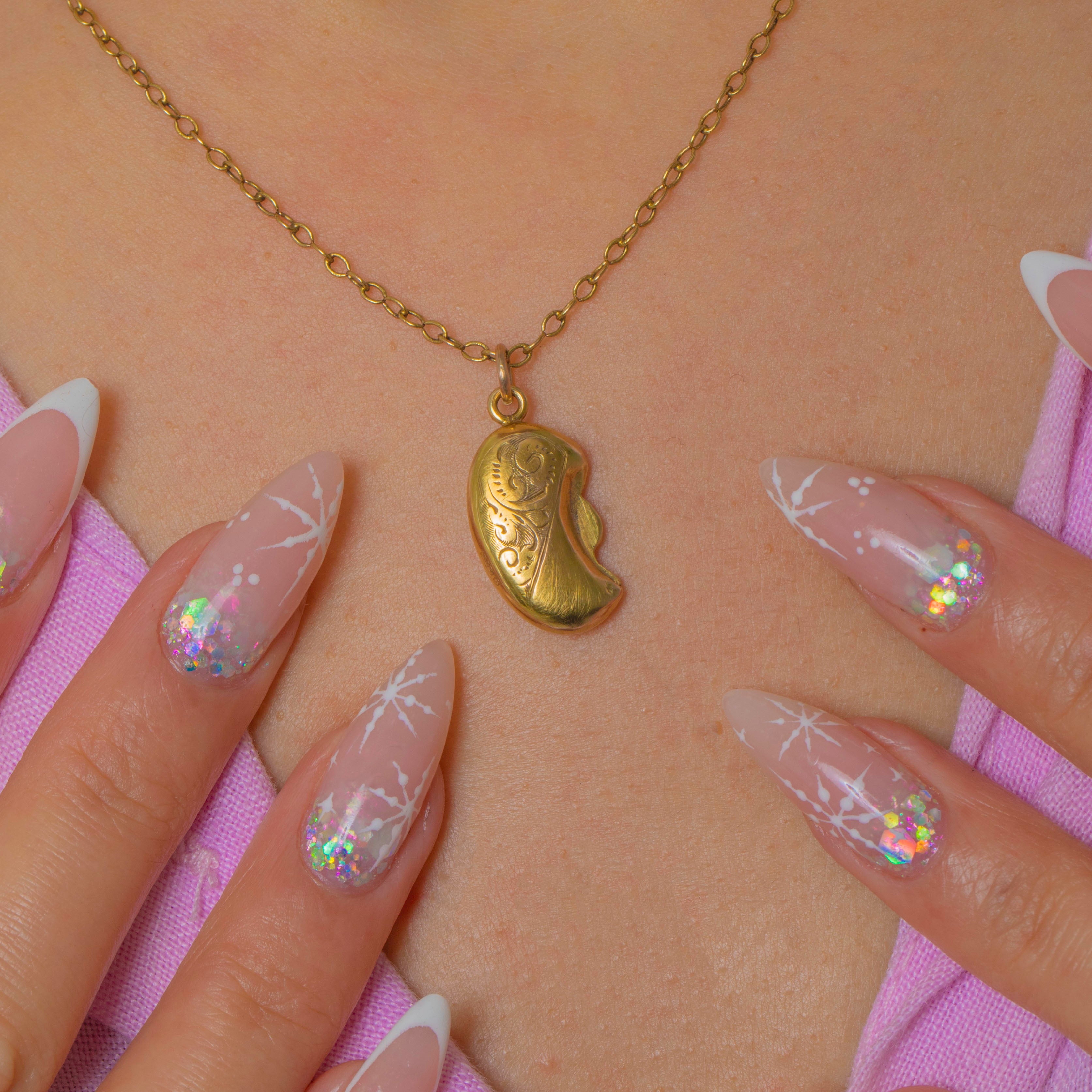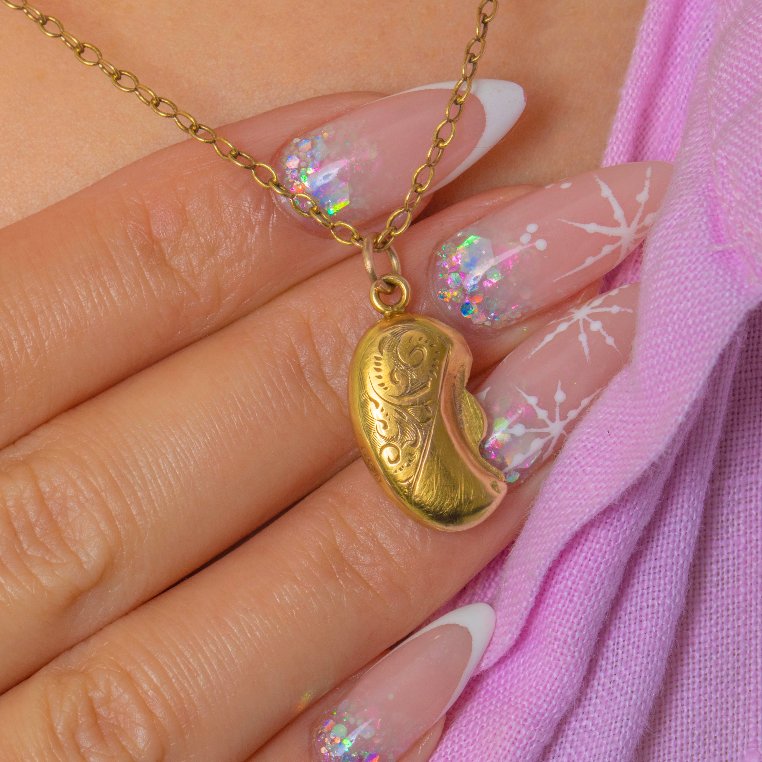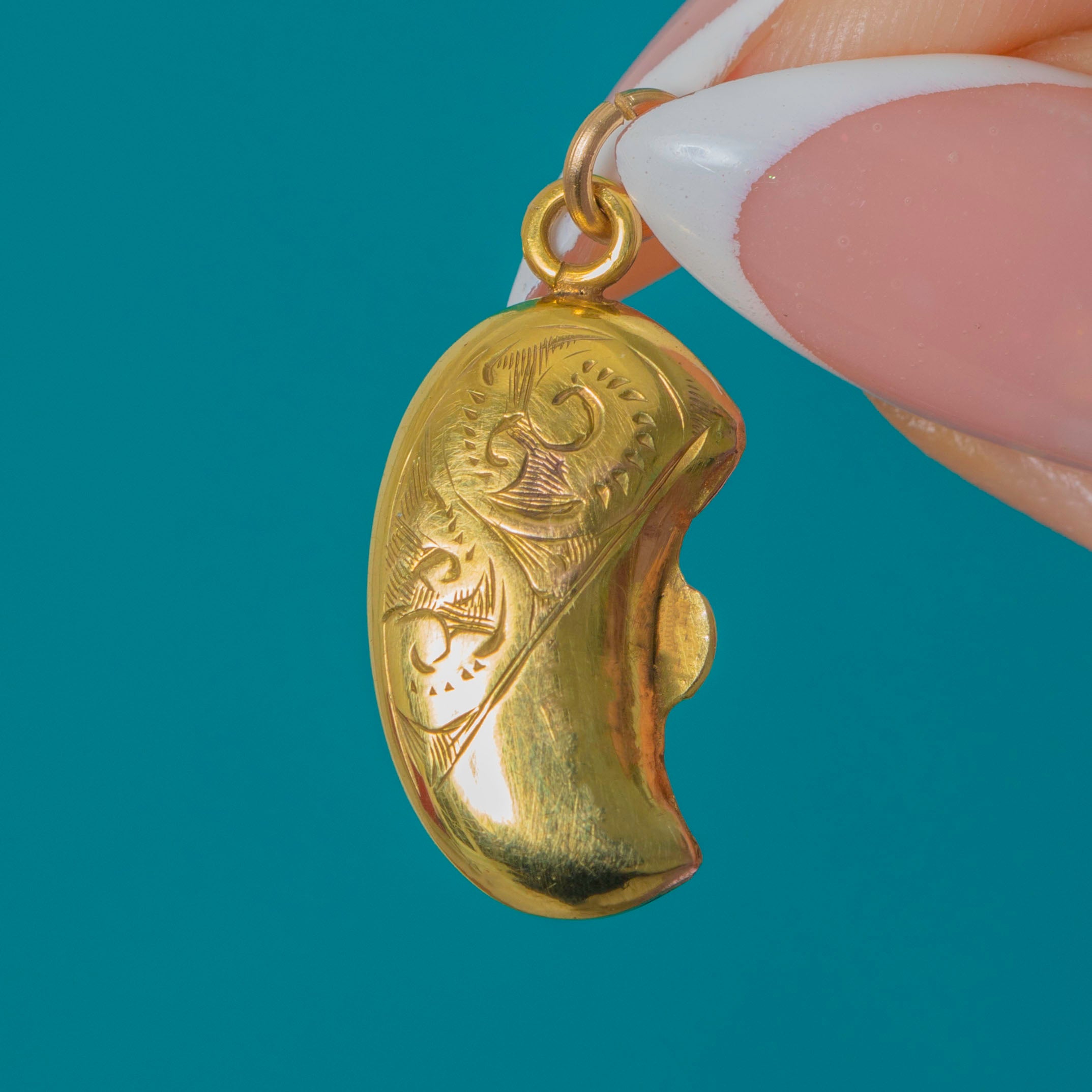 This delightful Victorian lucky bean charm is a sweet symbol of prosperity and good fortune. Its organic bean-shaped silhouette, paired with beautifully hand-engraved detailing, gives it that unmistakable 19th-century charm.