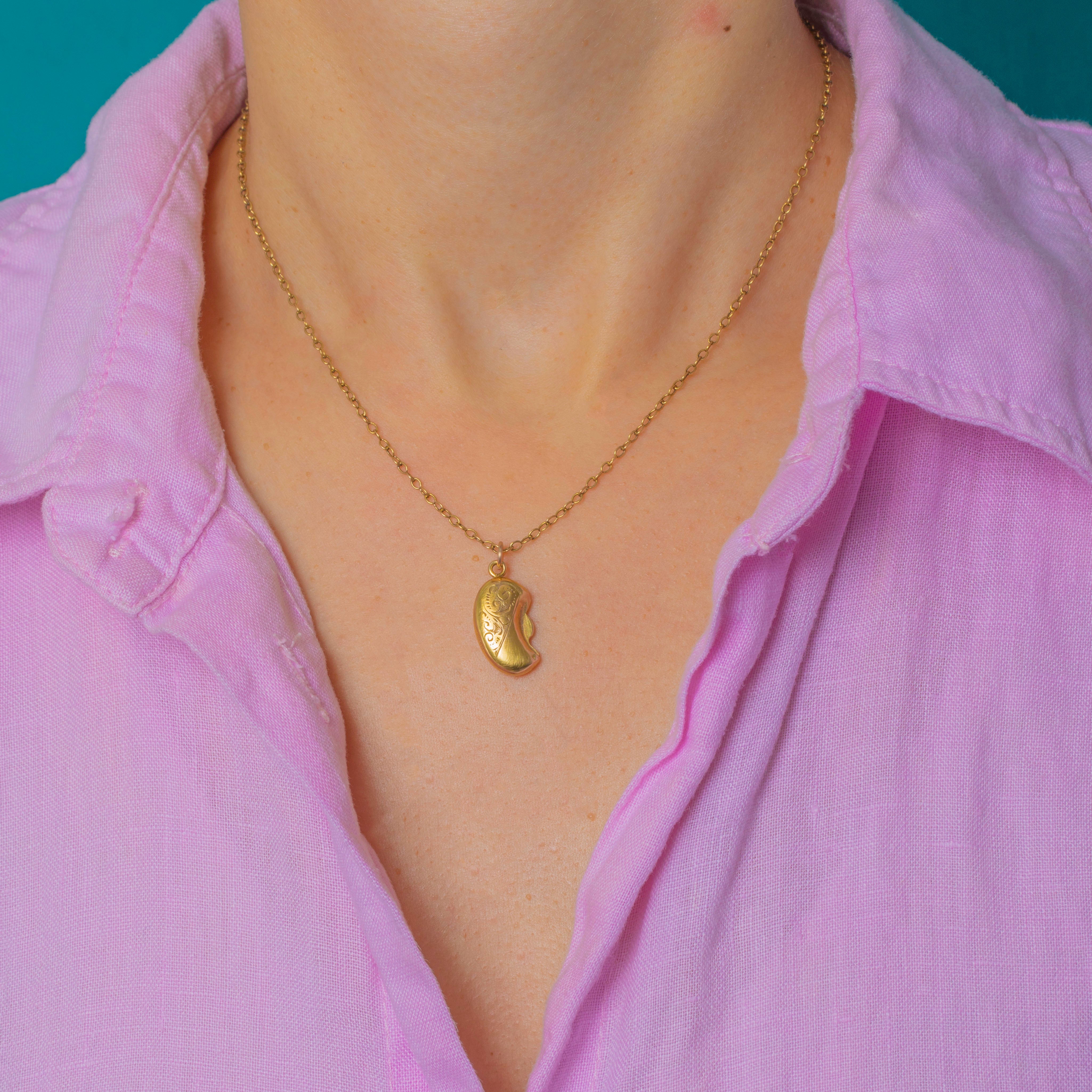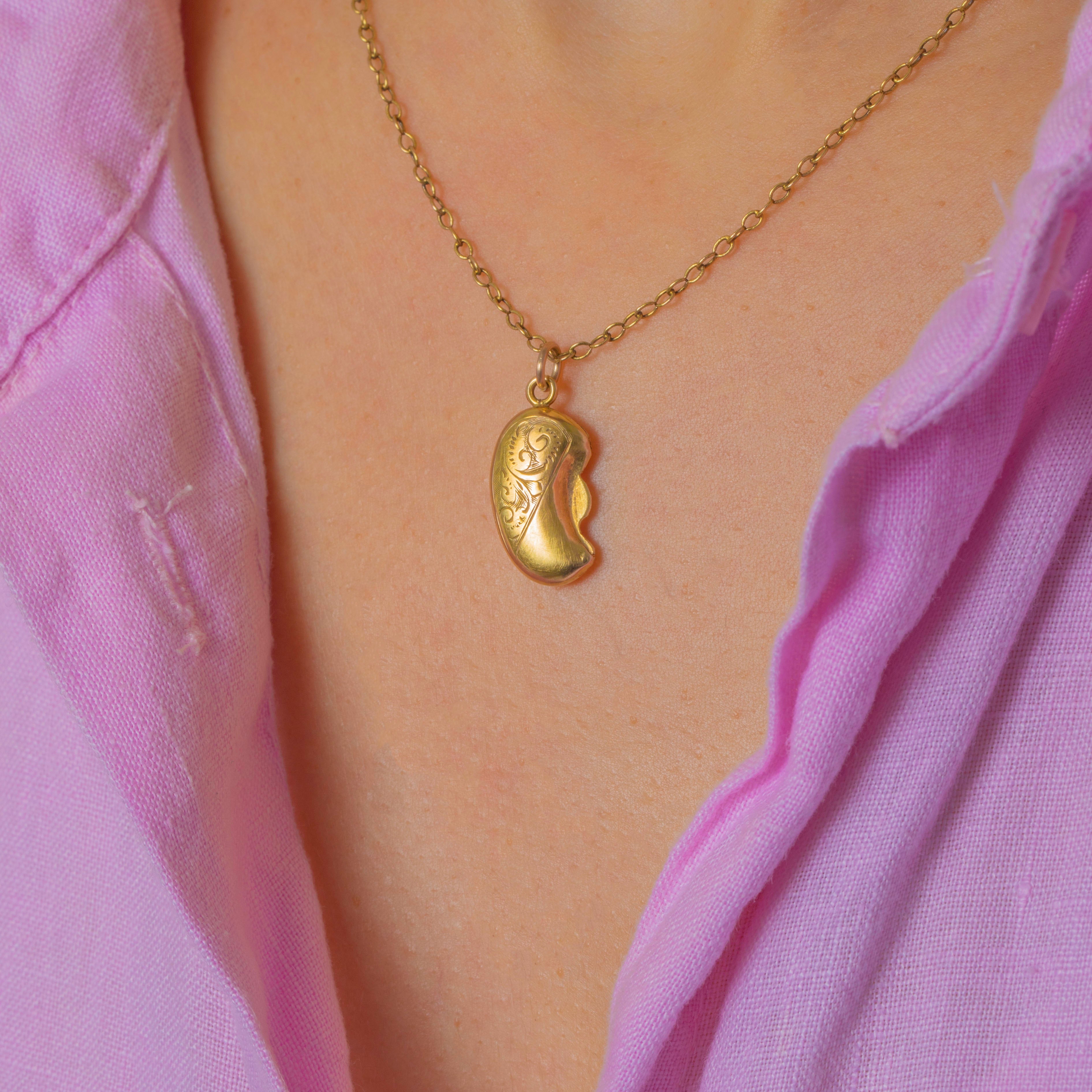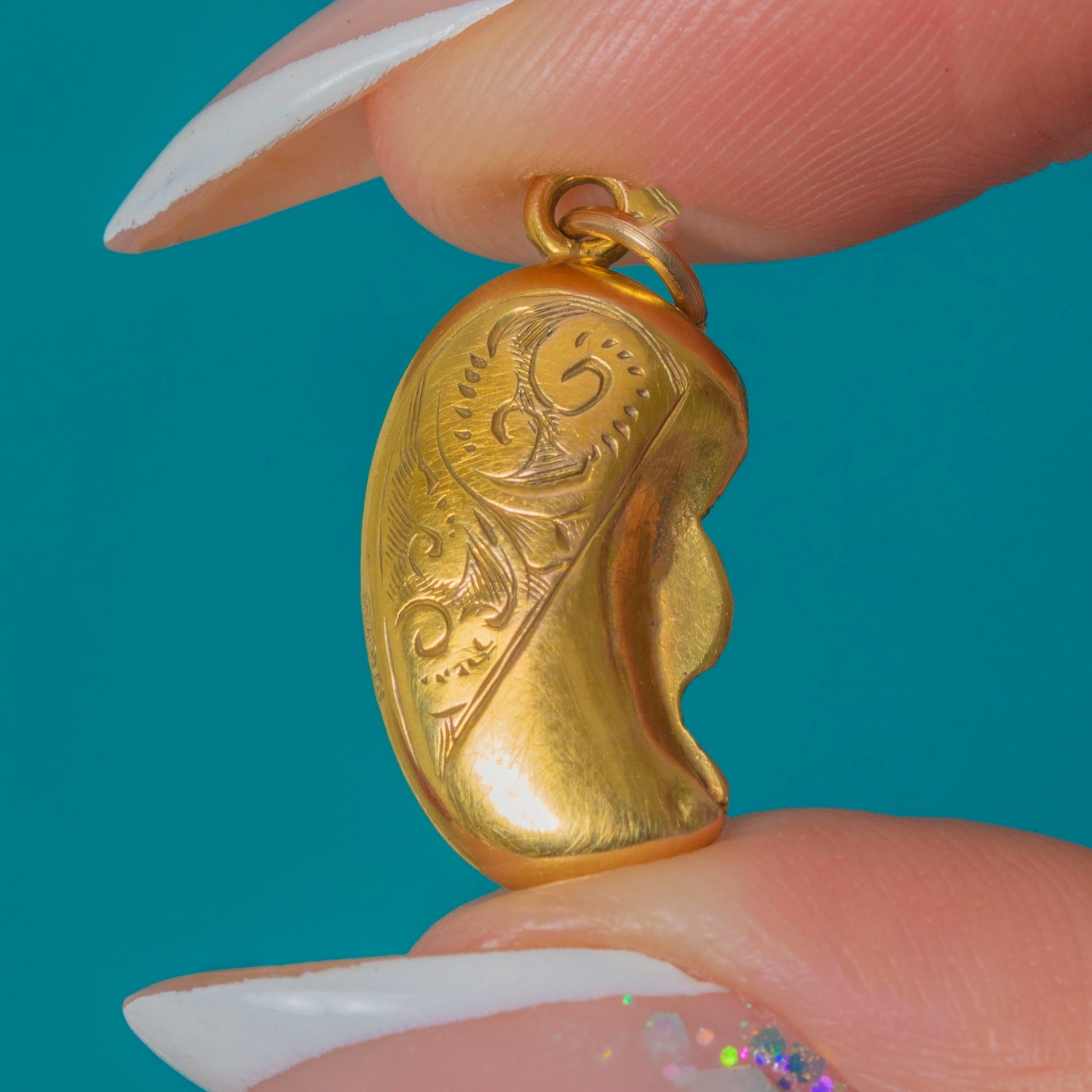 This charming Victorian lucky bean charm is a sweet symbol of prosperity and new beginnings. Crafted in warm 9ct Gold, its curved bean silhouette feels wonderfully tactile, while the finely engraved foliate motifs bring that unmistakable 19th-century character.