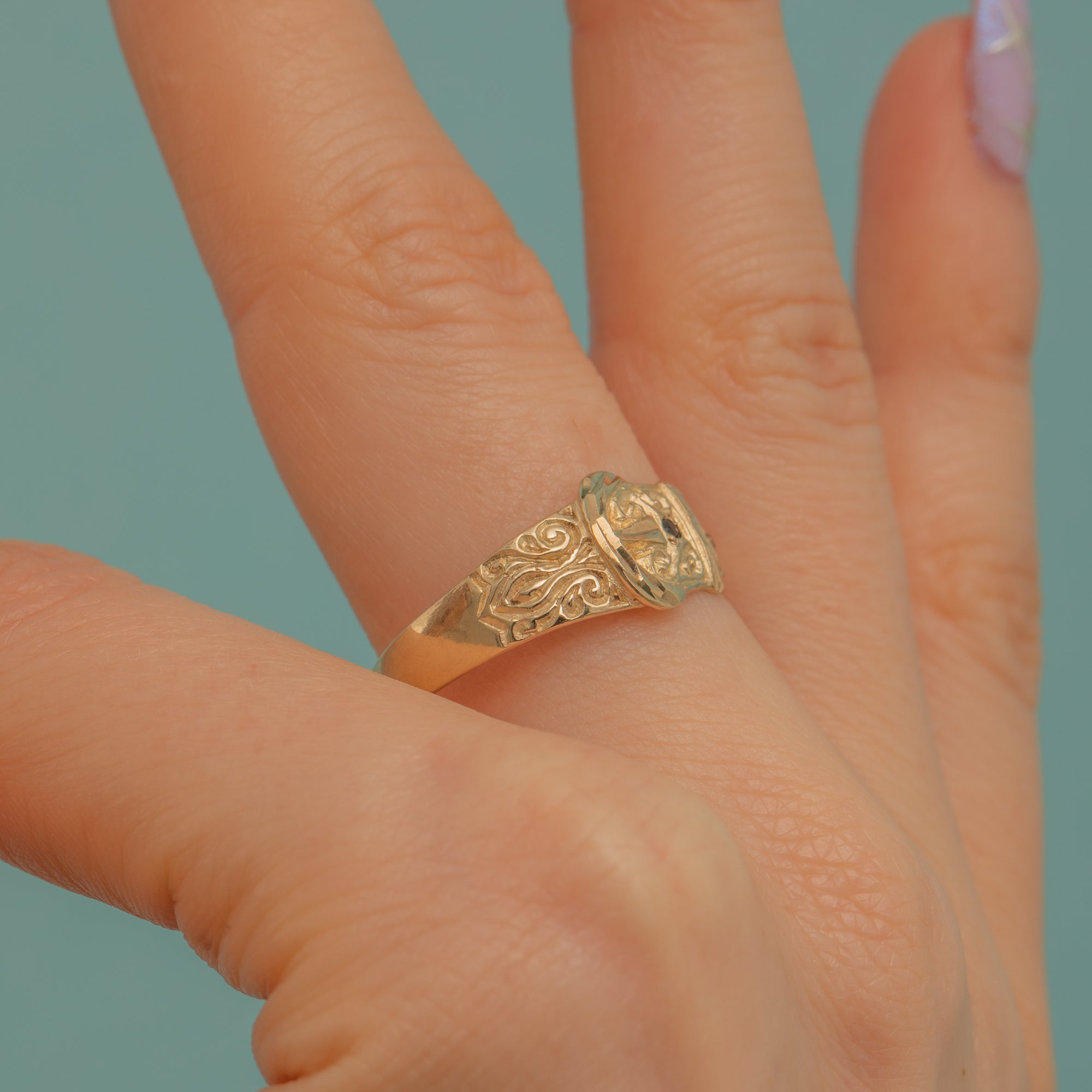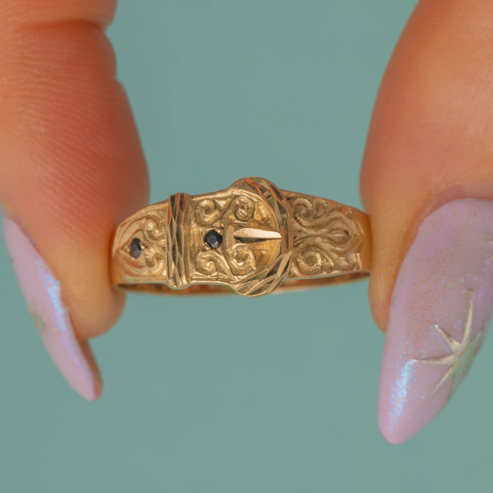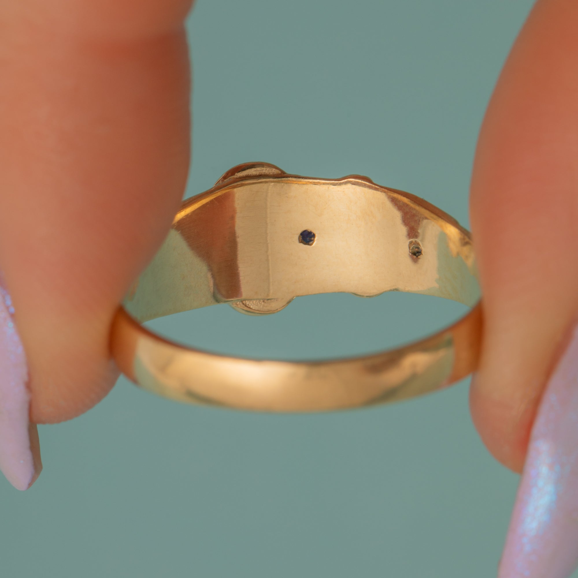 The tapered band is flattering on the finger and the low profile makes this vintage Sapphire ring perfect for everyday wear. With its sweet sentiment and gorgeous design, this vintage buckle ring would make the perfect token of love to gift your favourite person!