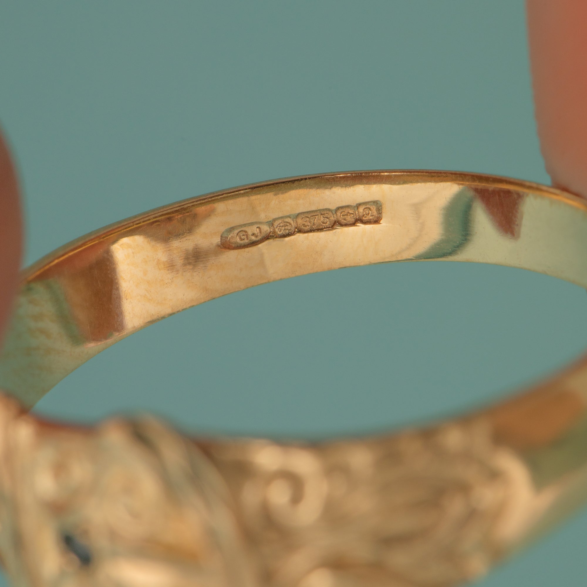 EXCELLENT. This 9ct Gold Engraved Sapphire buckle ring is in excellent condition. The Gold is buttery and the band is smooth, feeling comfortable on the finger when worn. The Sapphires are secure in their flush settings and the engraved details are crisp with a defined buckle motif in the centre. This vintage Gold band will soon become a staple in your collection!