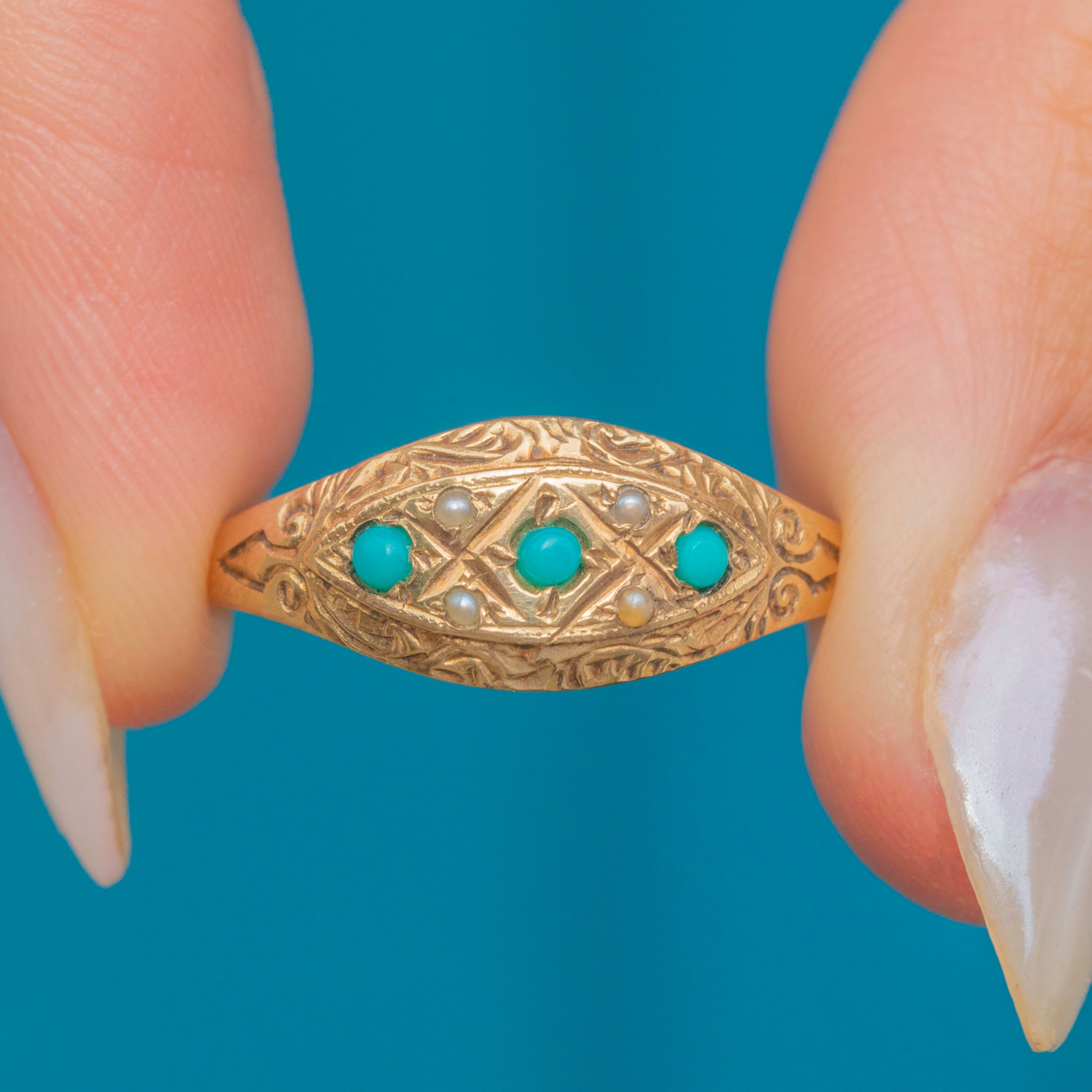 This eye-catching vintage gypsy ring is crafted from glossy 9ct Gold and inlaid with vibrant sky blue Turquoise cabochons and dainty Seed Pearls.