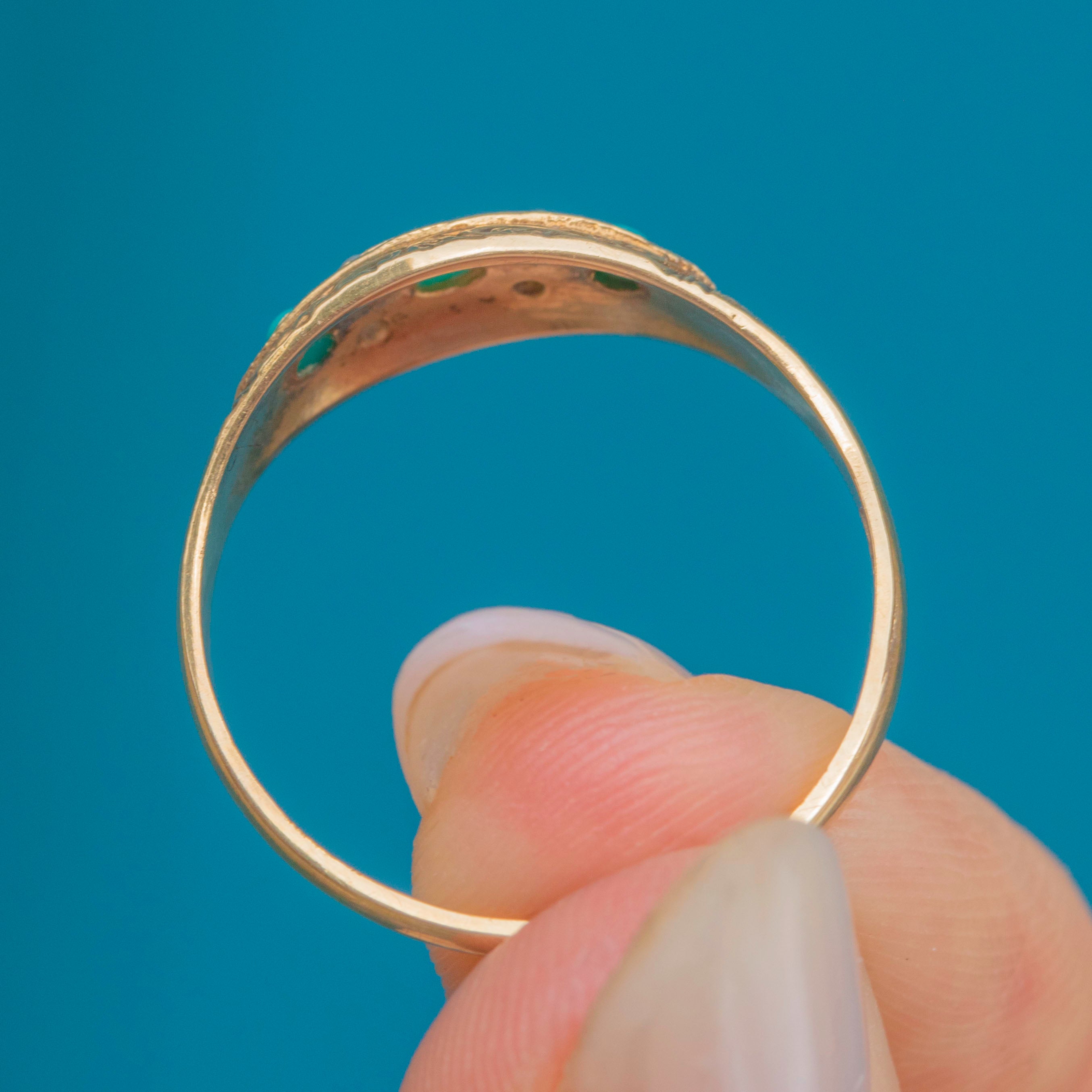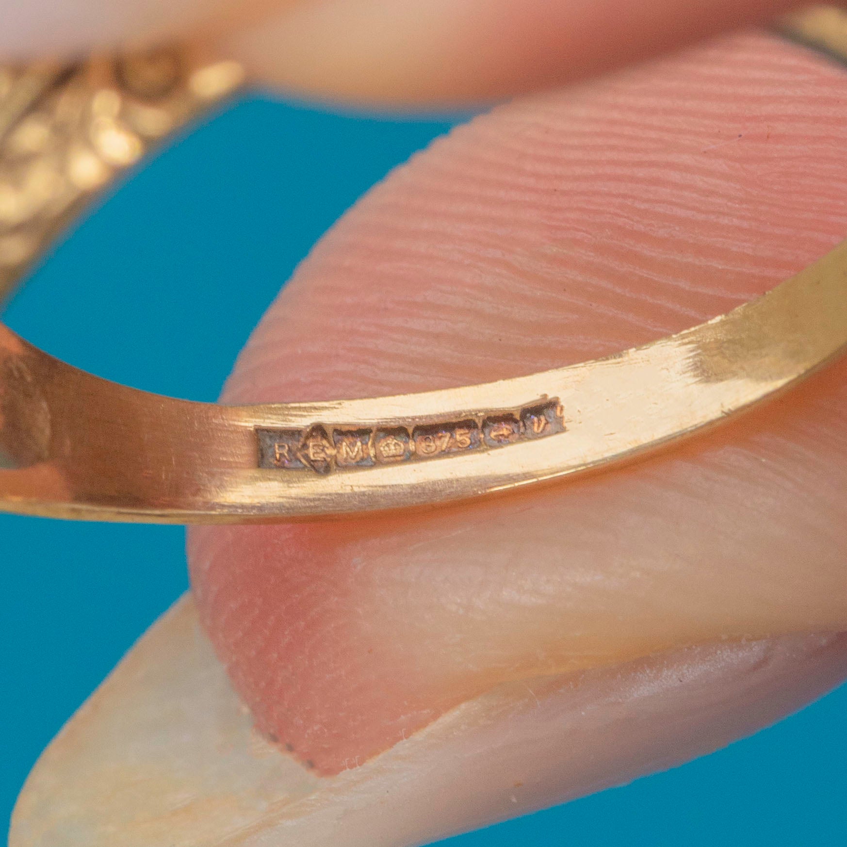 EXCELLENT: The Gold has an even buttery hue throughout and the engraved details are crisp. The gemstones are all present and securely set, free from surface wear. The band has held its form well and has a full set of English hallmarks dating to 1995 inside!