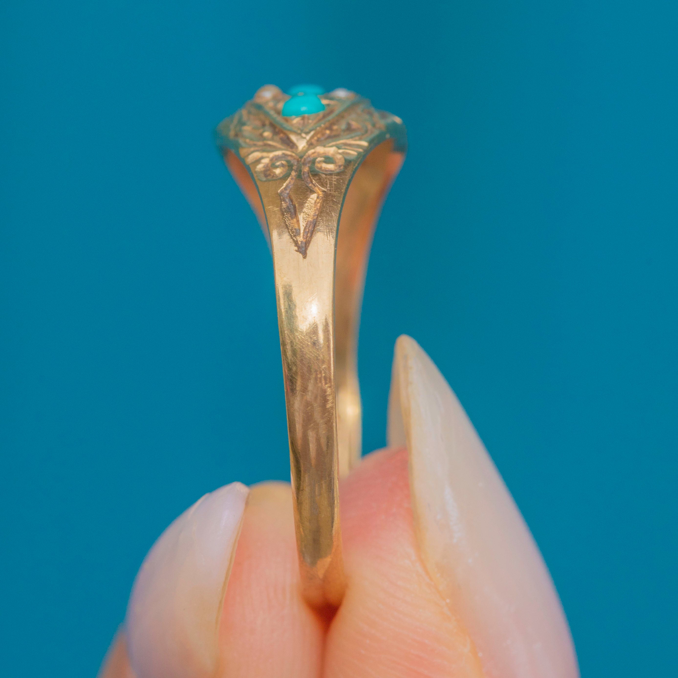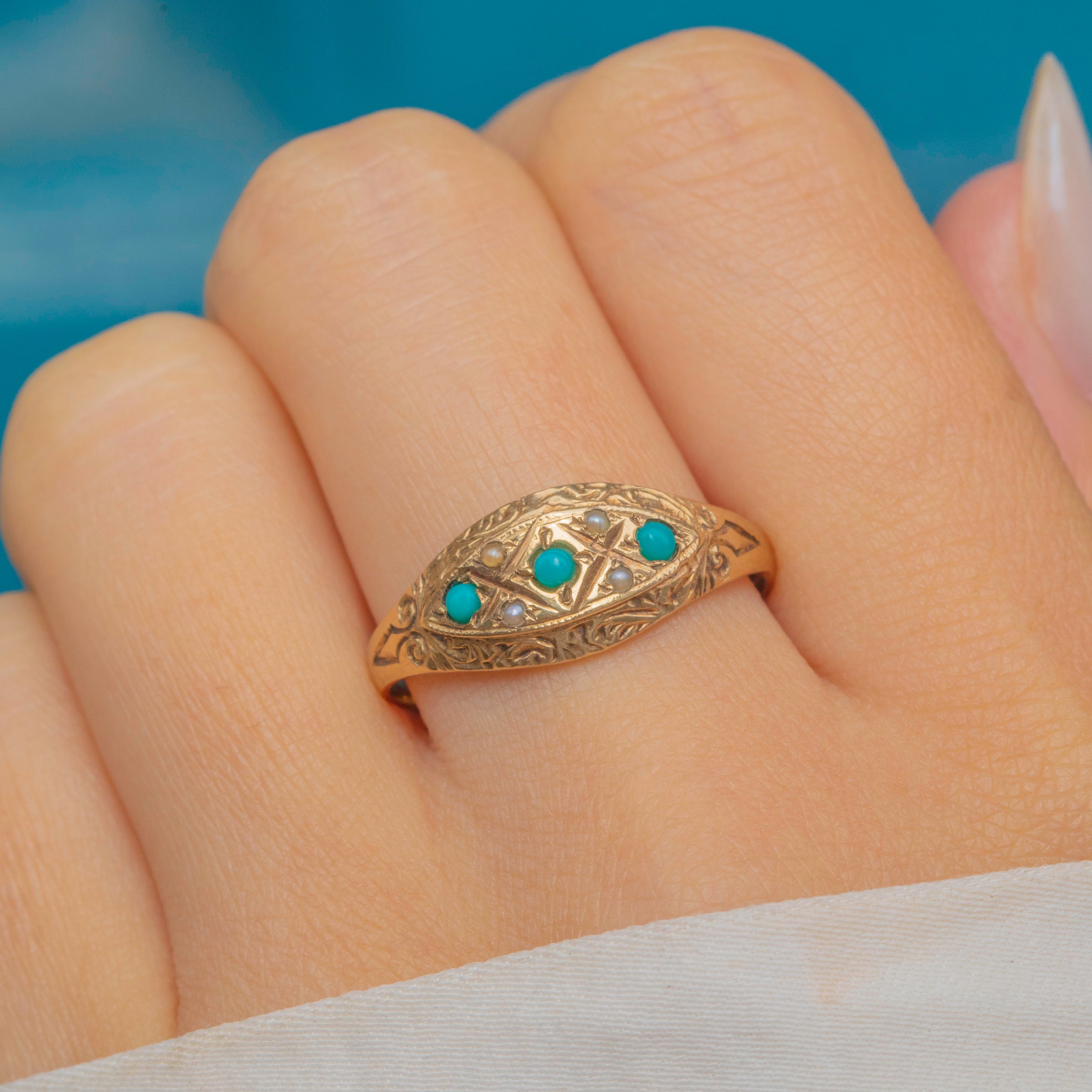 9ct Gold Engraved Turquoise Pearl Gypsy Ring