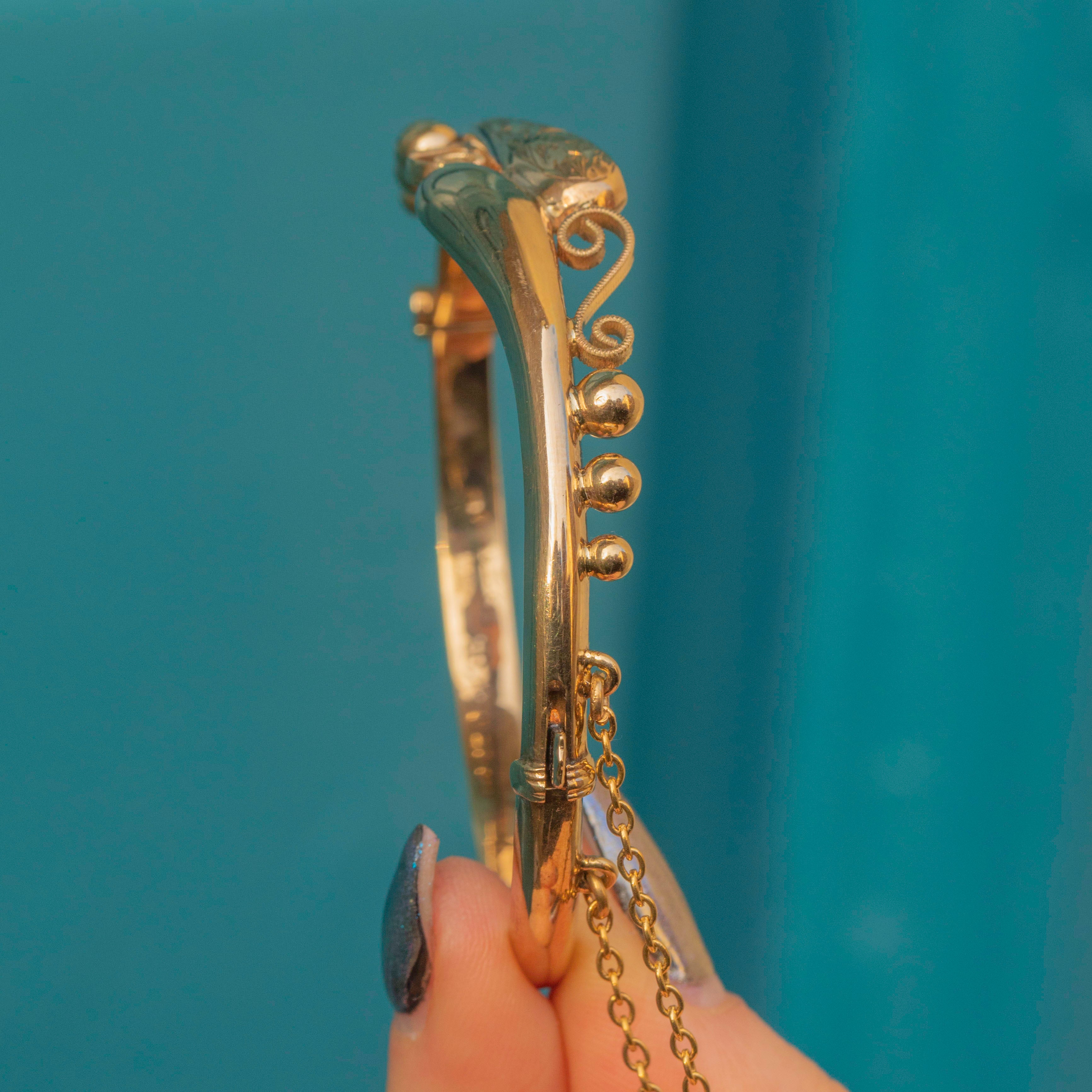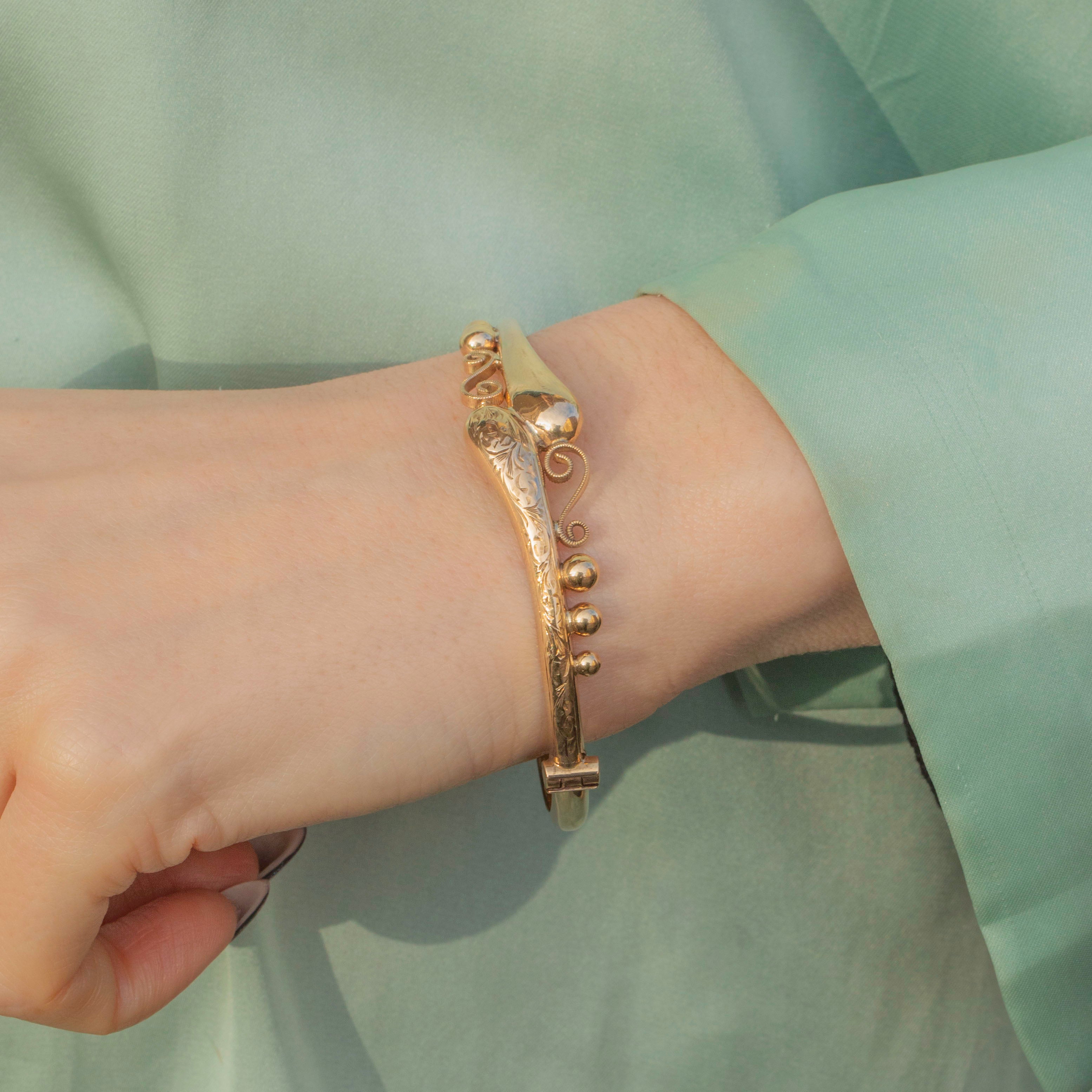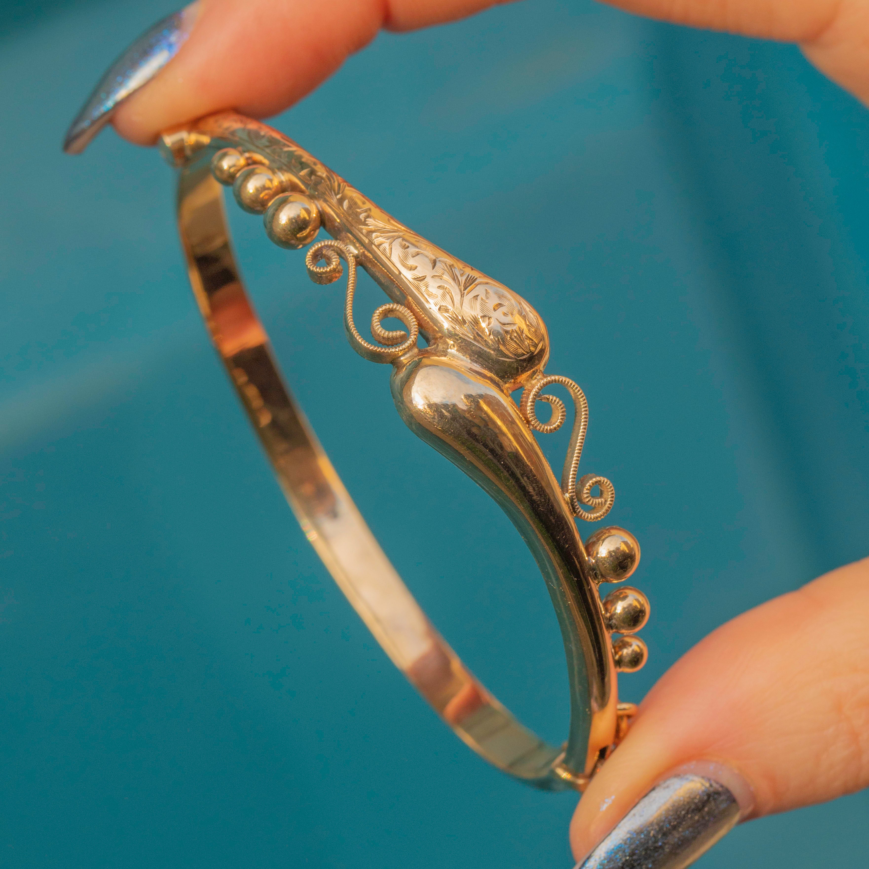 VERY GOOD. This lovely 9ct Gold engraved twist bangle shows only very minimal signs of wear. The Gold is buttery throughout and the engraved detail have all remained crisp. It has a secure clasp and a safety chain for peace of mind!