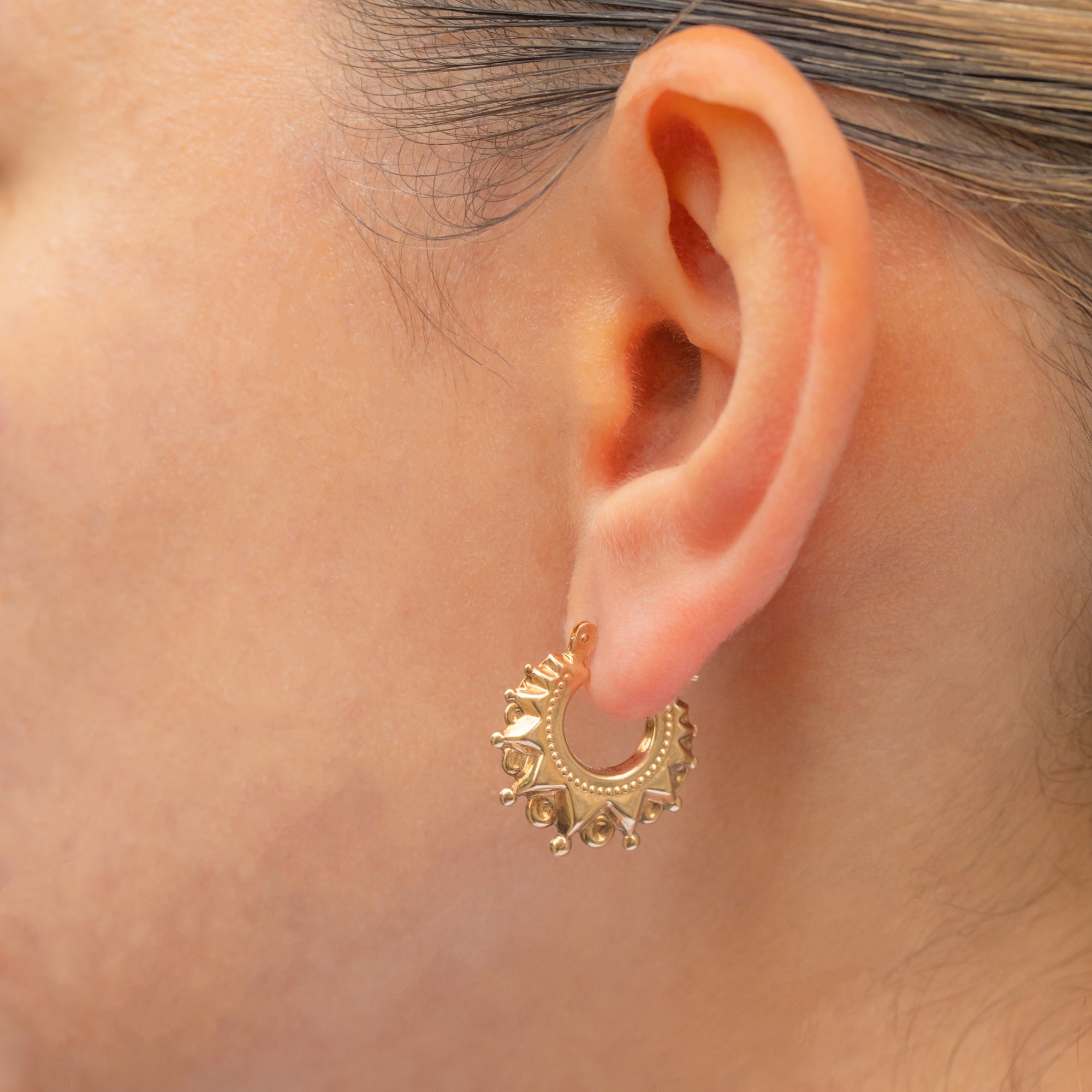These Vintage 9ct Gold Creole hoop earrings are styled in the Etruscan revival manner, with richly textured detail and an elegant curved form. Their bold yet wearable design makes them a versatile pair that carries both antique inspiration and timeless appeal.