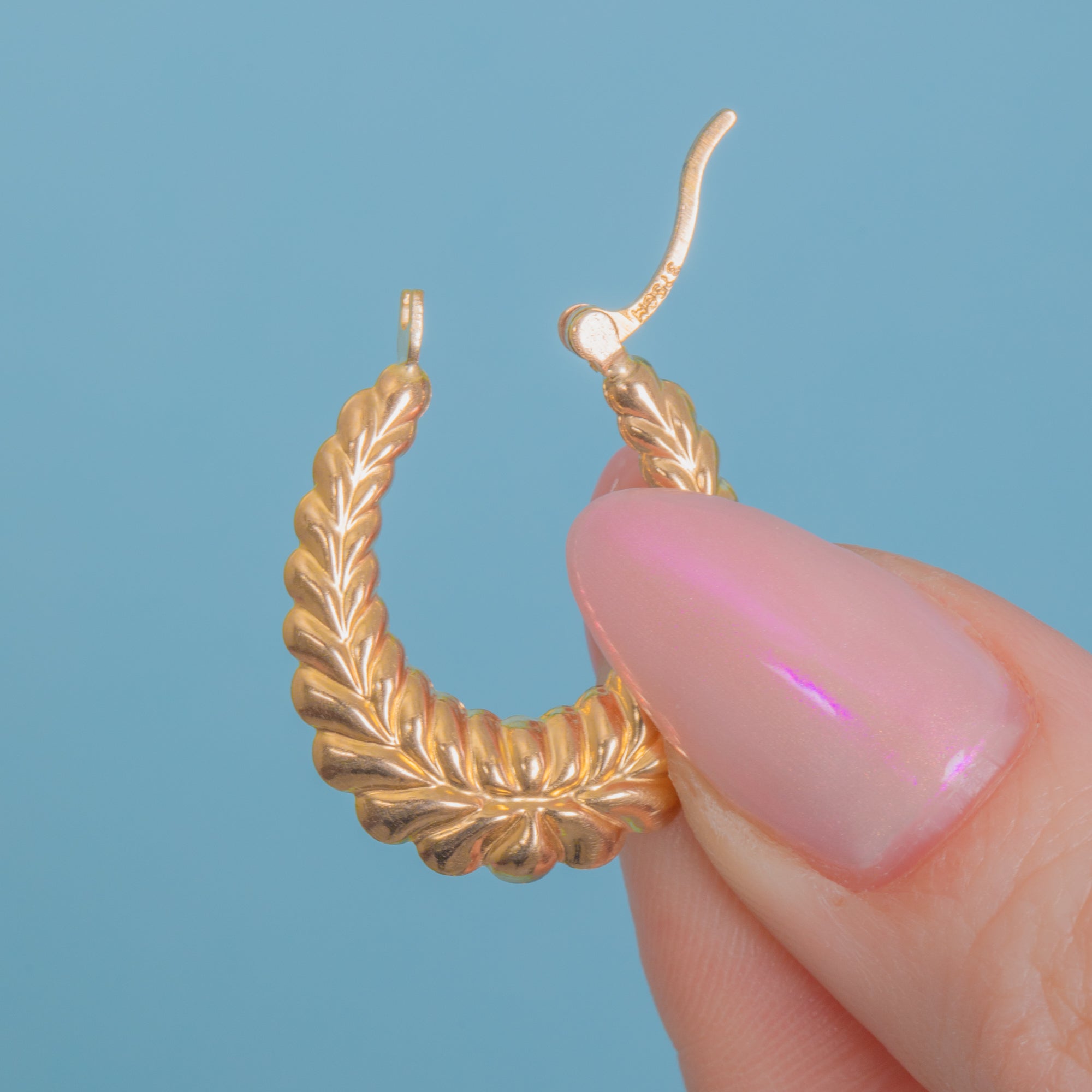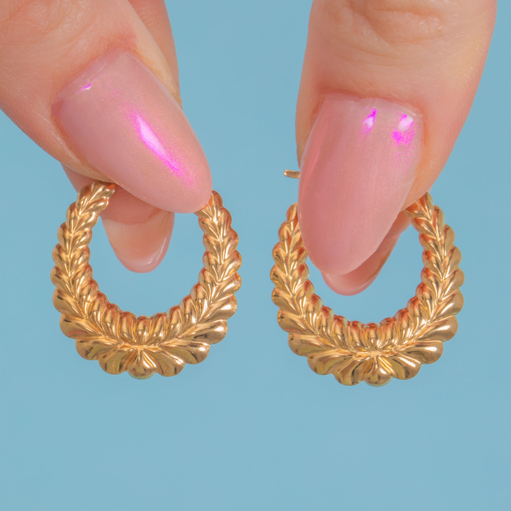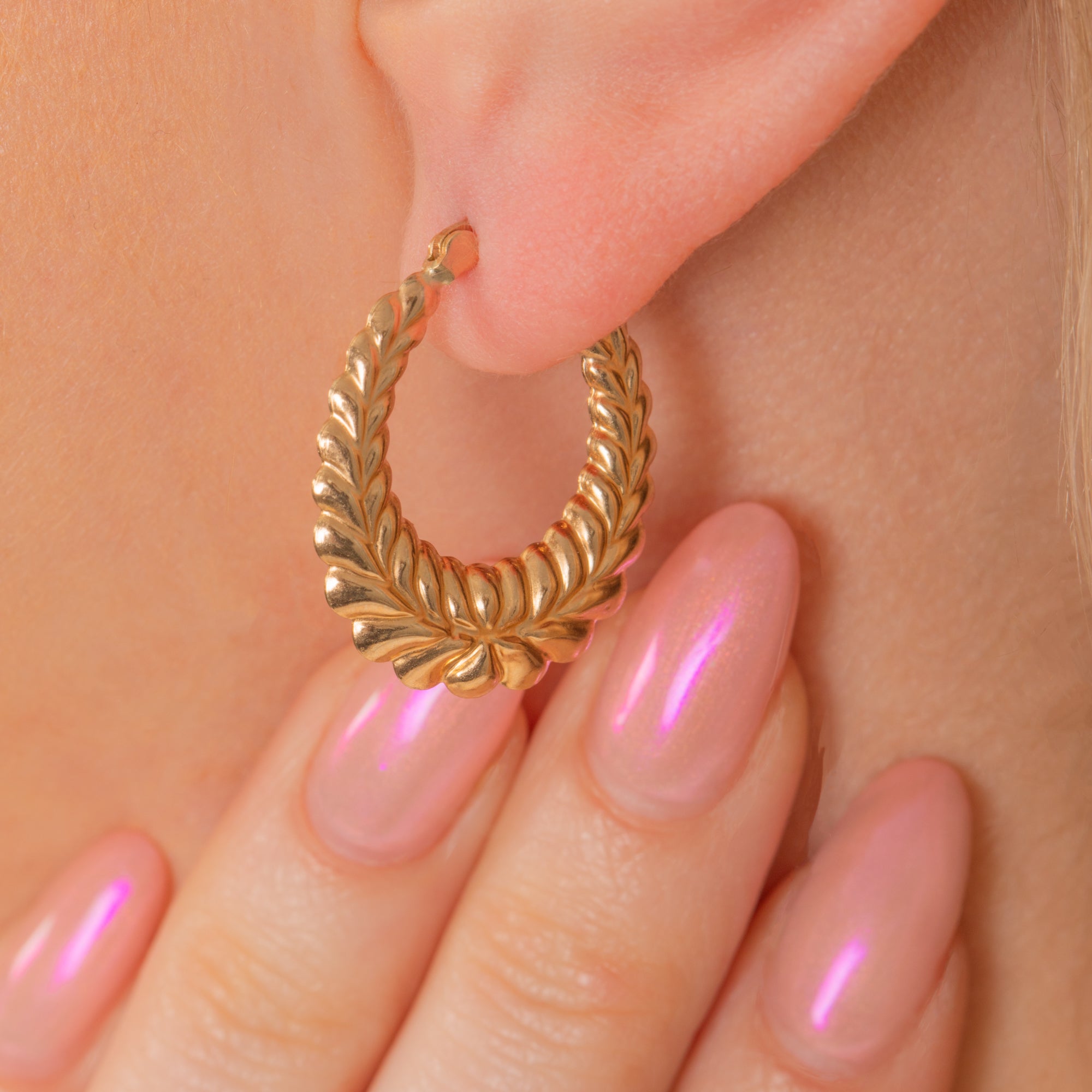 EXCELLENT. These 9ct Gold fancy hoop earrings are in excellent condition. The details are crisp and the hoops are free from dings or scuffs. The circular shape has remained completely intact and the hooks close securely so you can wear them with the utmost confidence!