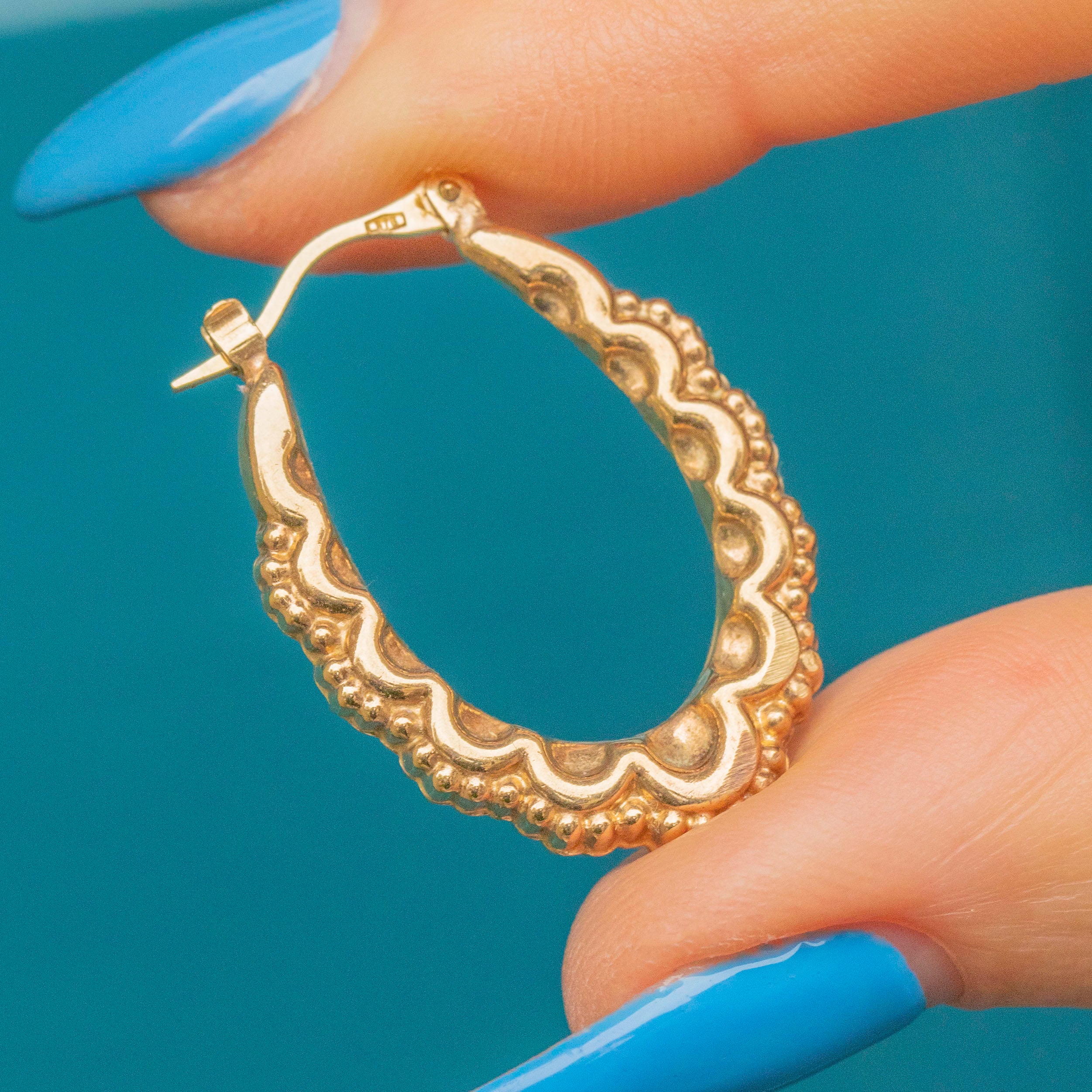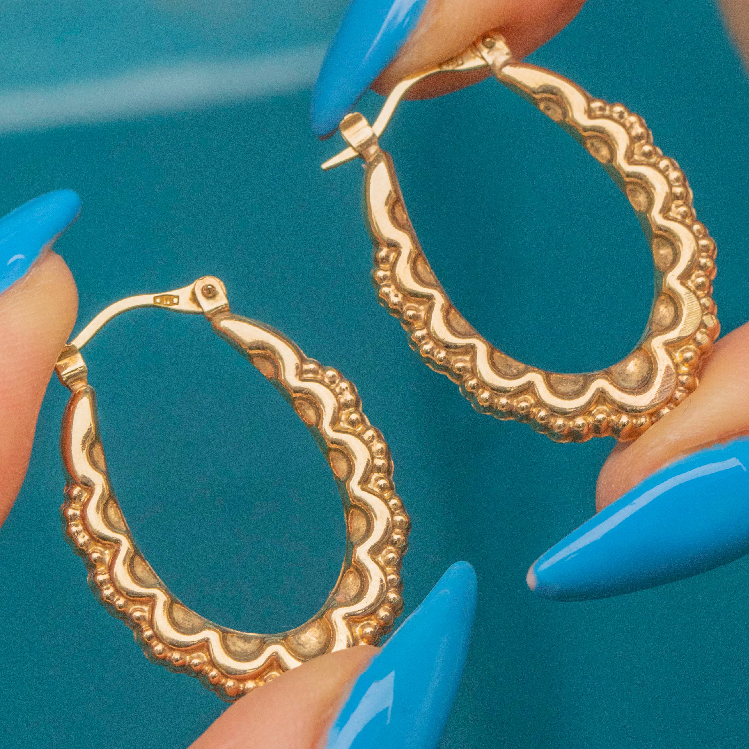 These 9ct Gold fancy oval hoop earrings are the perfect 'grab & go' pair. They have beautiful details that can be adored from every angle, and lever hooks so you can slot them into and out of the ear with ease!