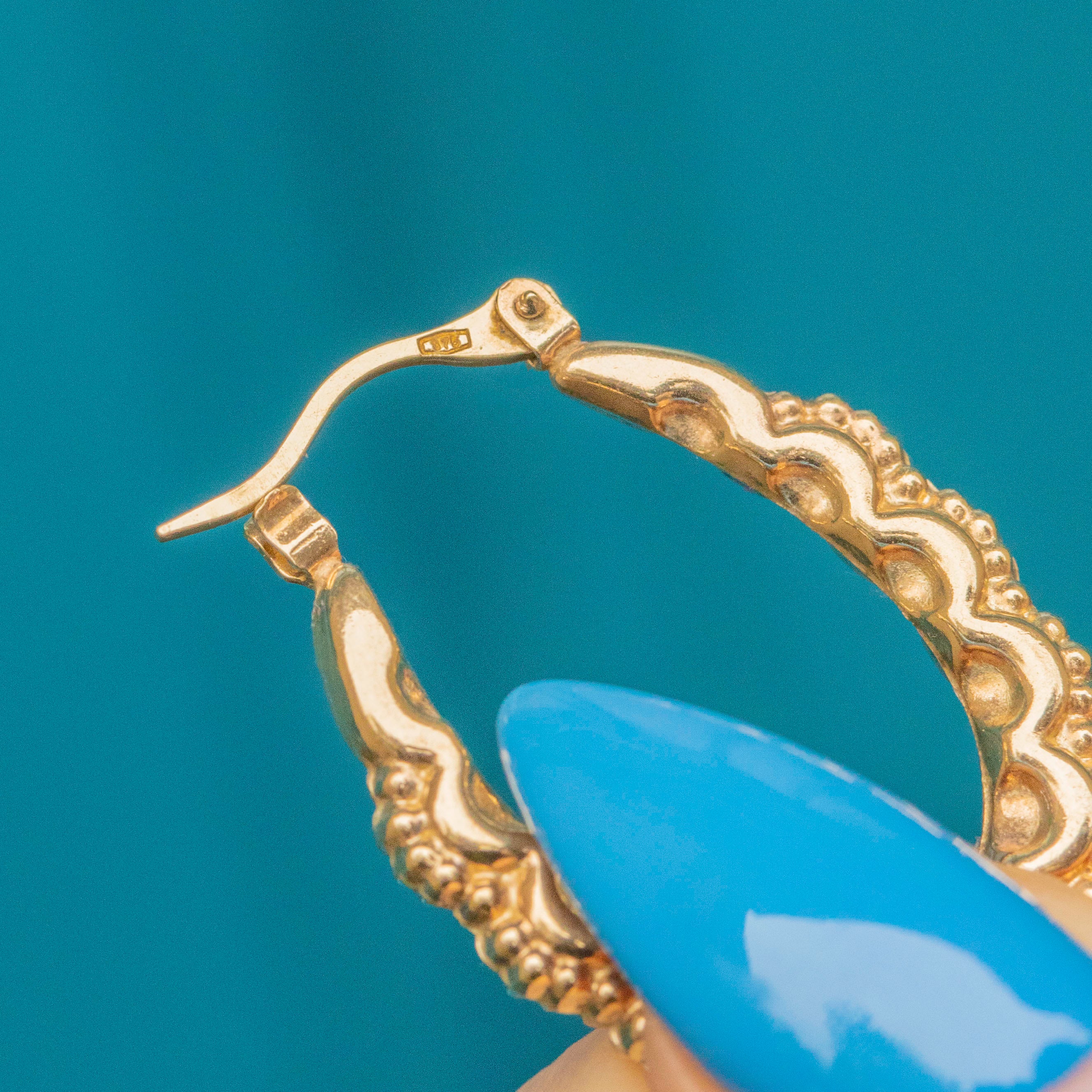 EXCELLENT. These 9ct Gold fancy hoop earrings are in excellent condition. The earrings have very little wear to note, and can be worn with confidence!