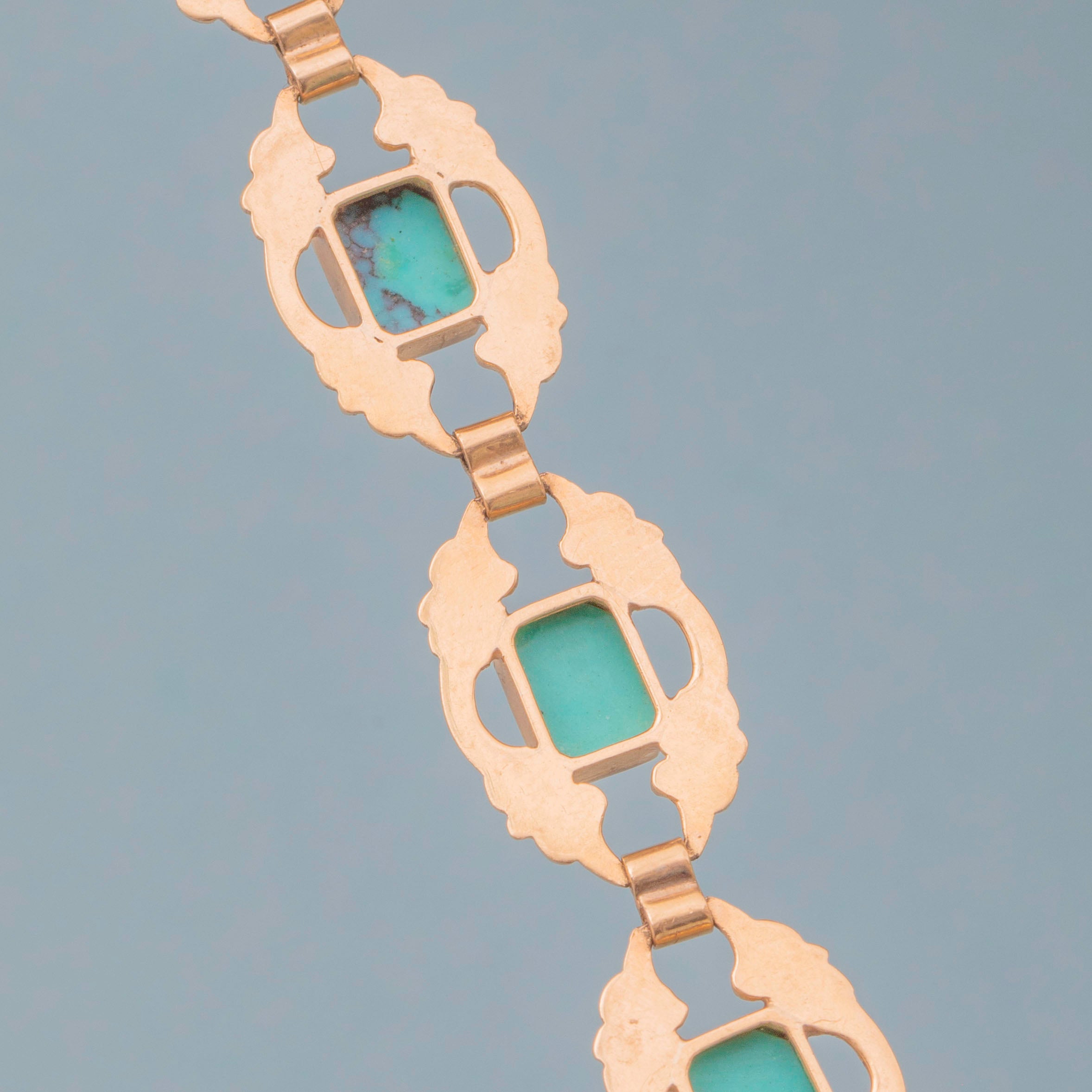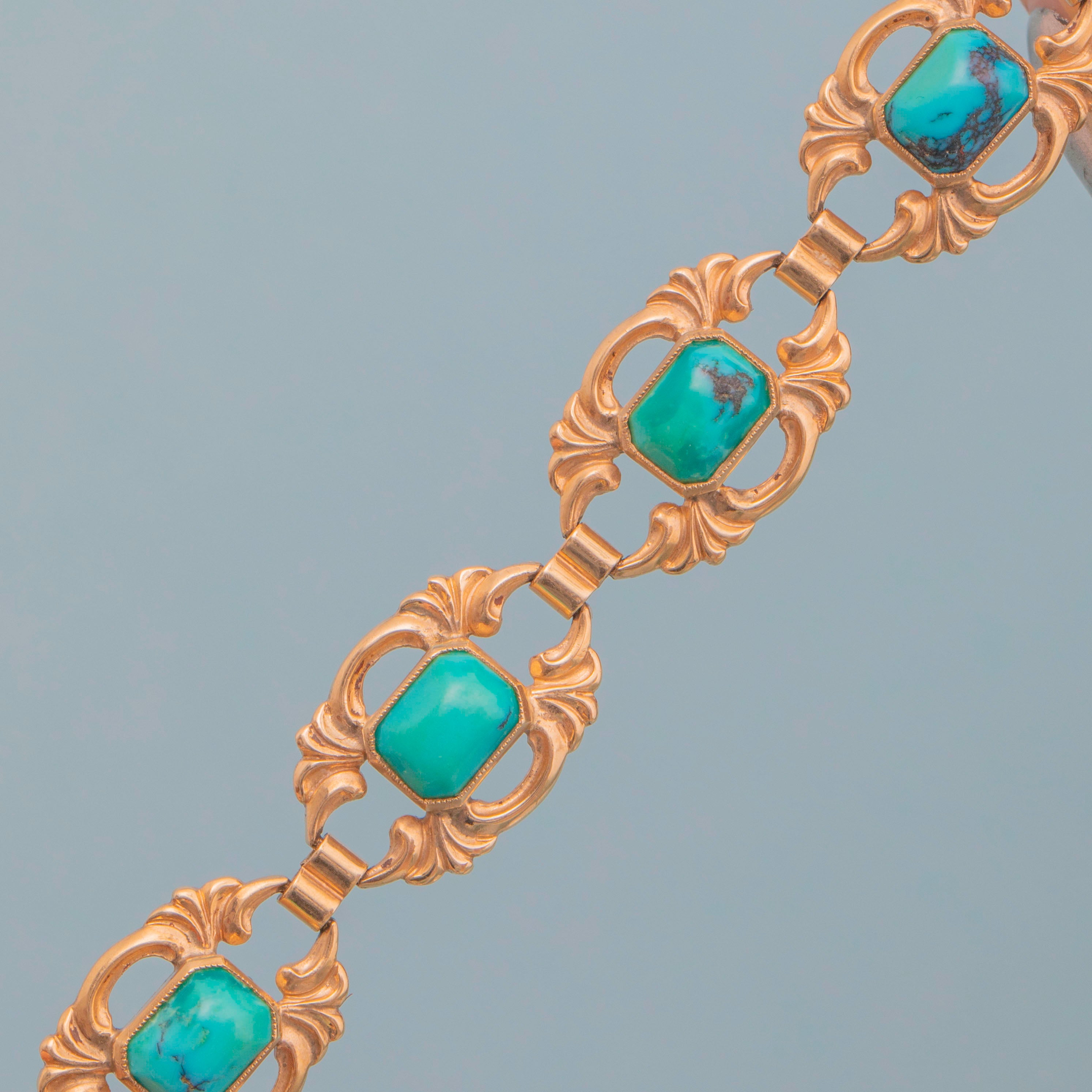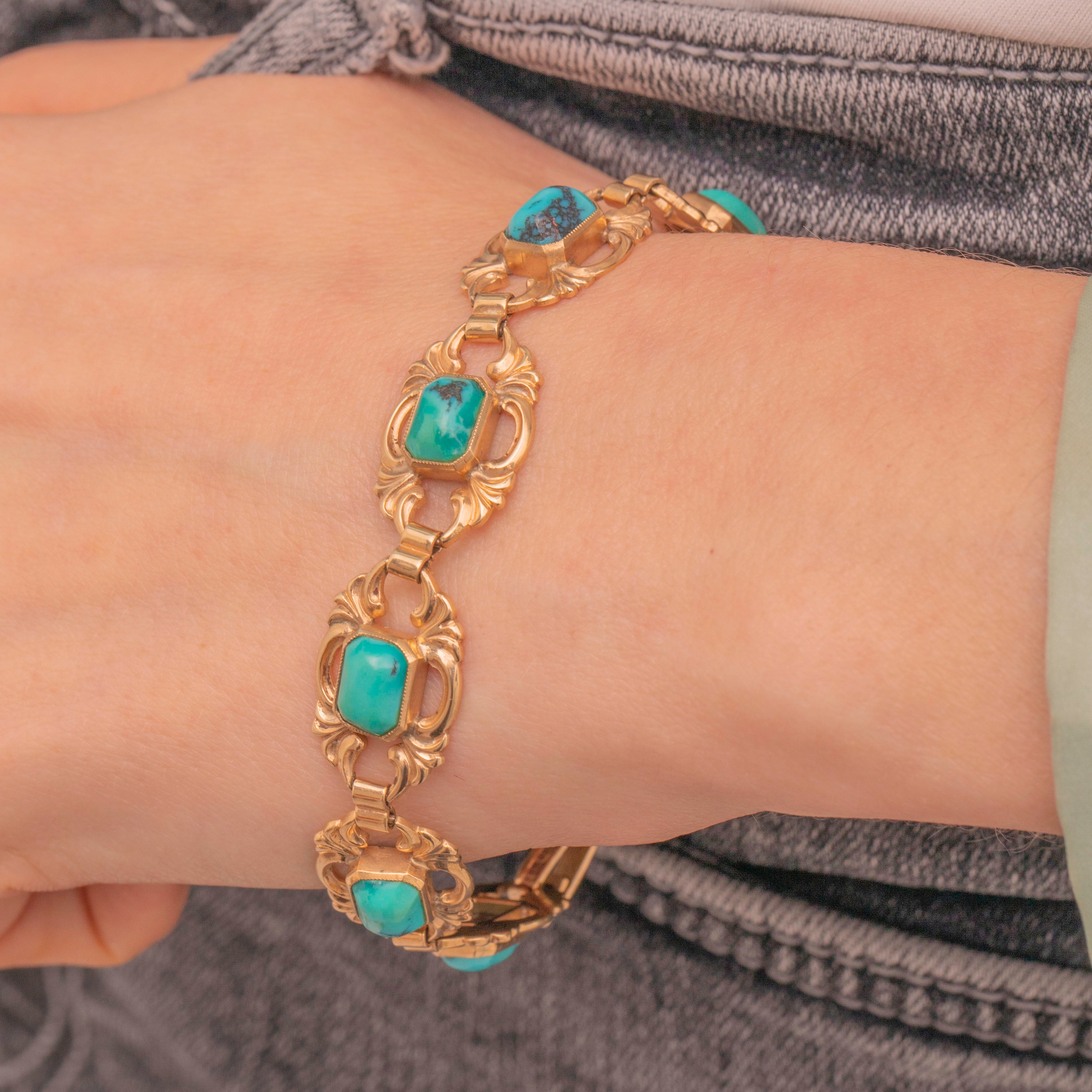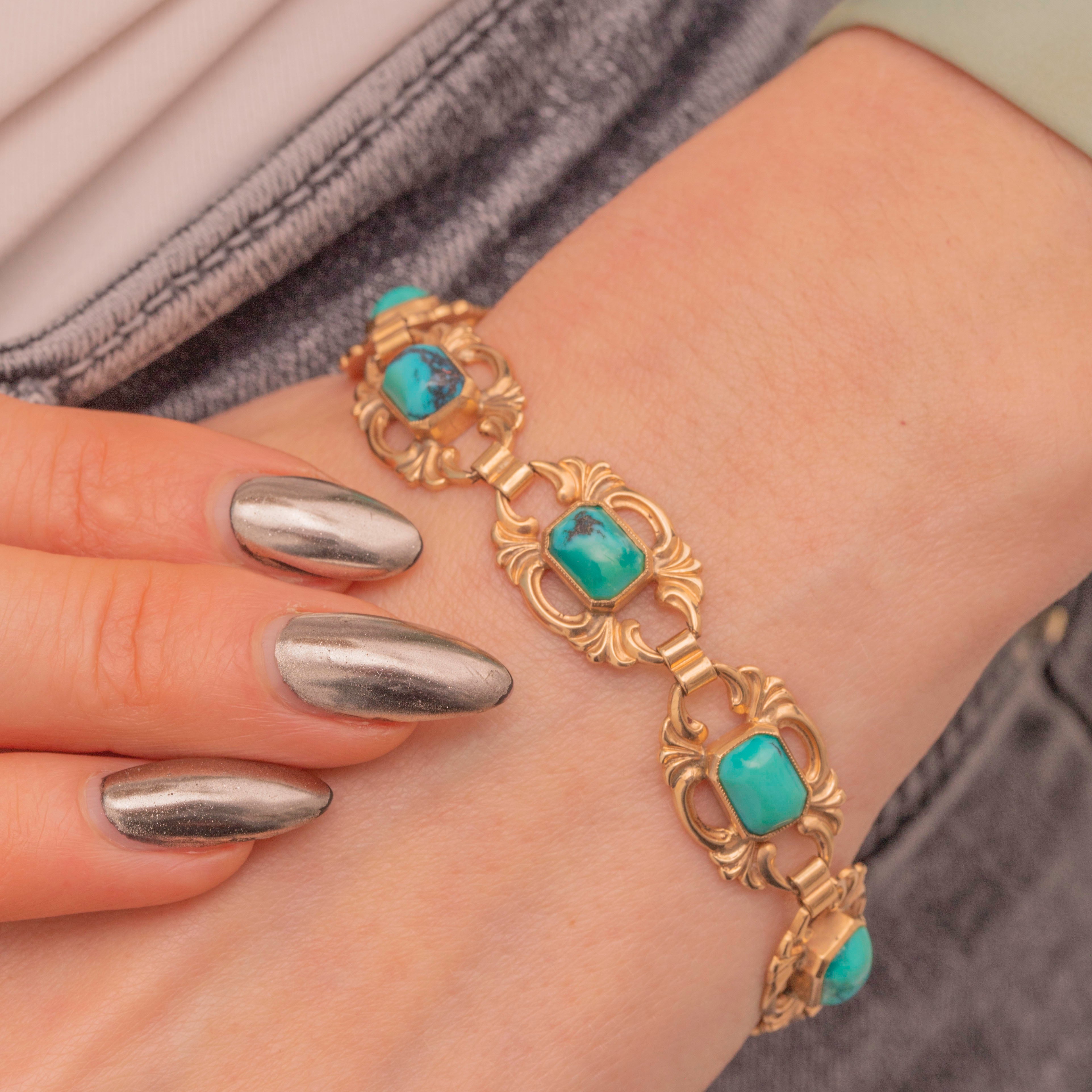 EXCELLENT. This 9ct Gold fancy Turquoise bracelet is in excellent condition! The Turquoise cabochons are vibrant and showcase lovely natural matrixes, all securely set within their bezels. The Gold is buttery throughout and the detailed links have remained defined, with no fings or scuffs visible. Securing comfortably around the wrist, you can enjoy this fancy Gold bracelet with absolute confidence!