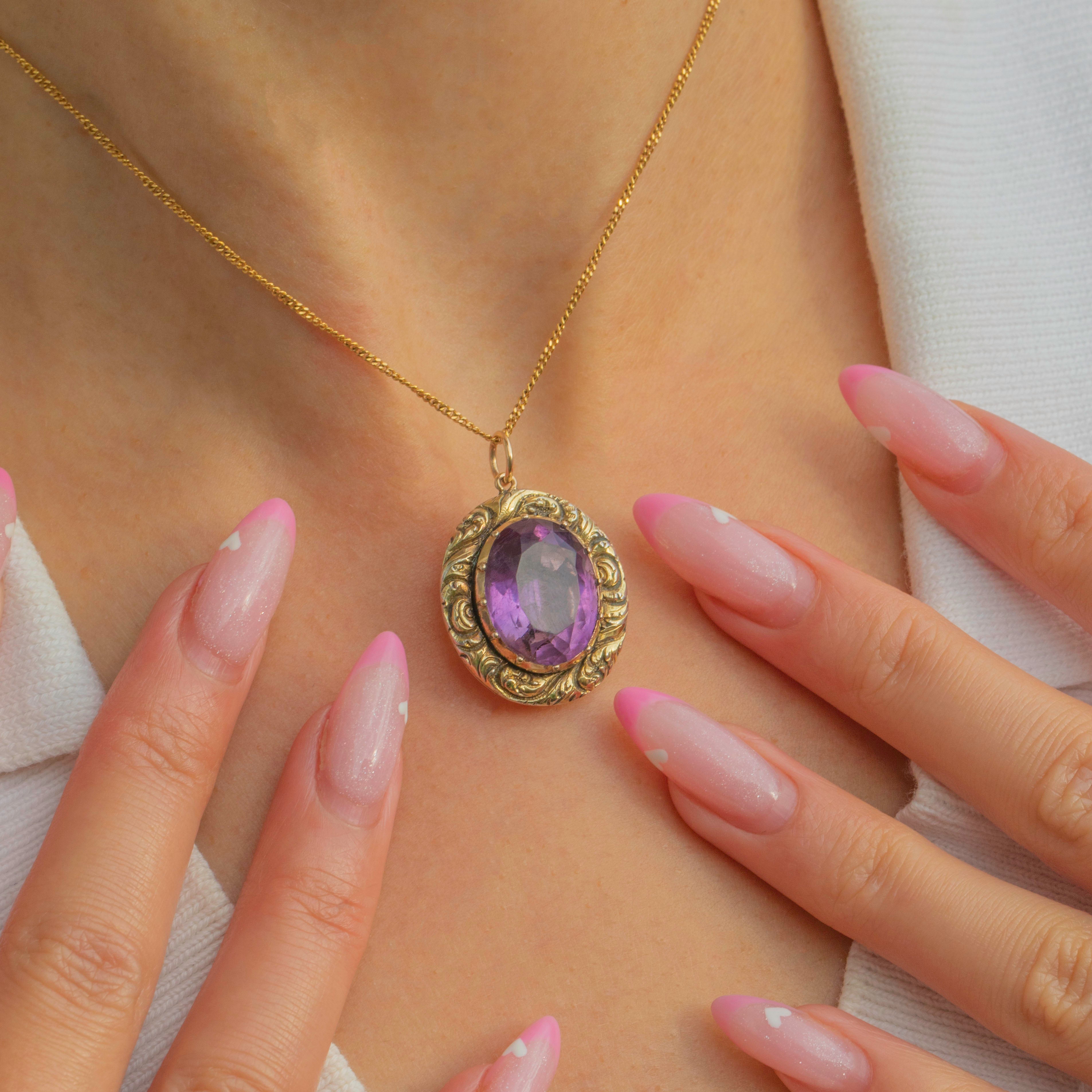 This beautiful Georgian Amethyst pendant showcases the rich colour and romantic craftsmanship of the late 18th to early 19th century. The deep purple Amethyst is faceted and mounted within an ornate chased Gold frame, its scrolling details adding texture and movement to the design. The gemstone glows warmly in its closed-back setting, a hallmark of Georgian jewellery, enhancing its inner fire and charm.