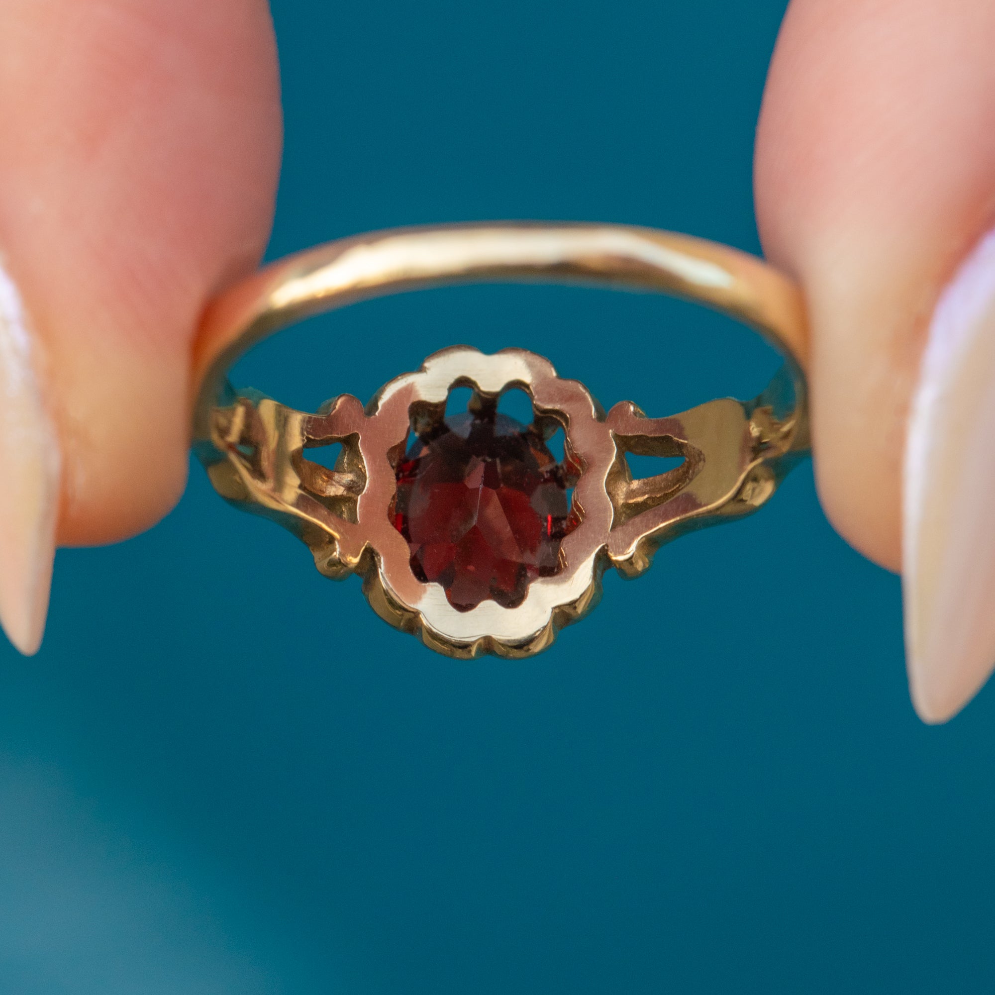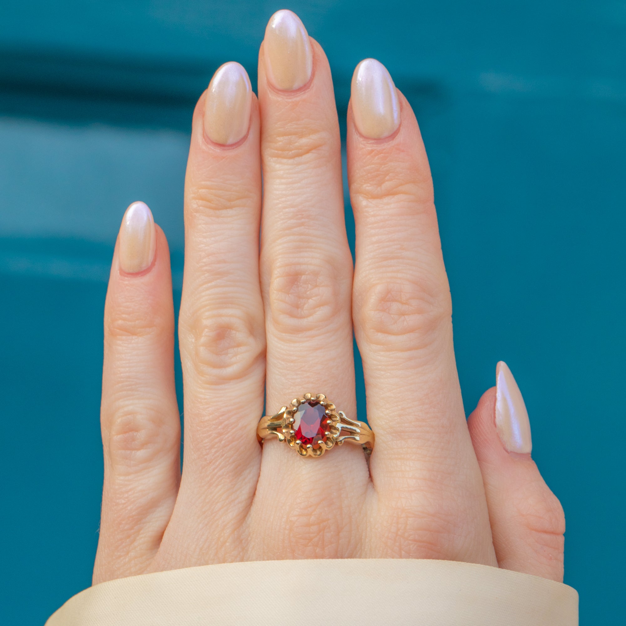 The glimmering 1.12ct Garnet has a crisp set of facets and is displayed within a pretty buttercup setting that allows the light to stream through from every angle. With a low profile, this vintage Garnet ring is perfect for adding luxury to your everyday attire!