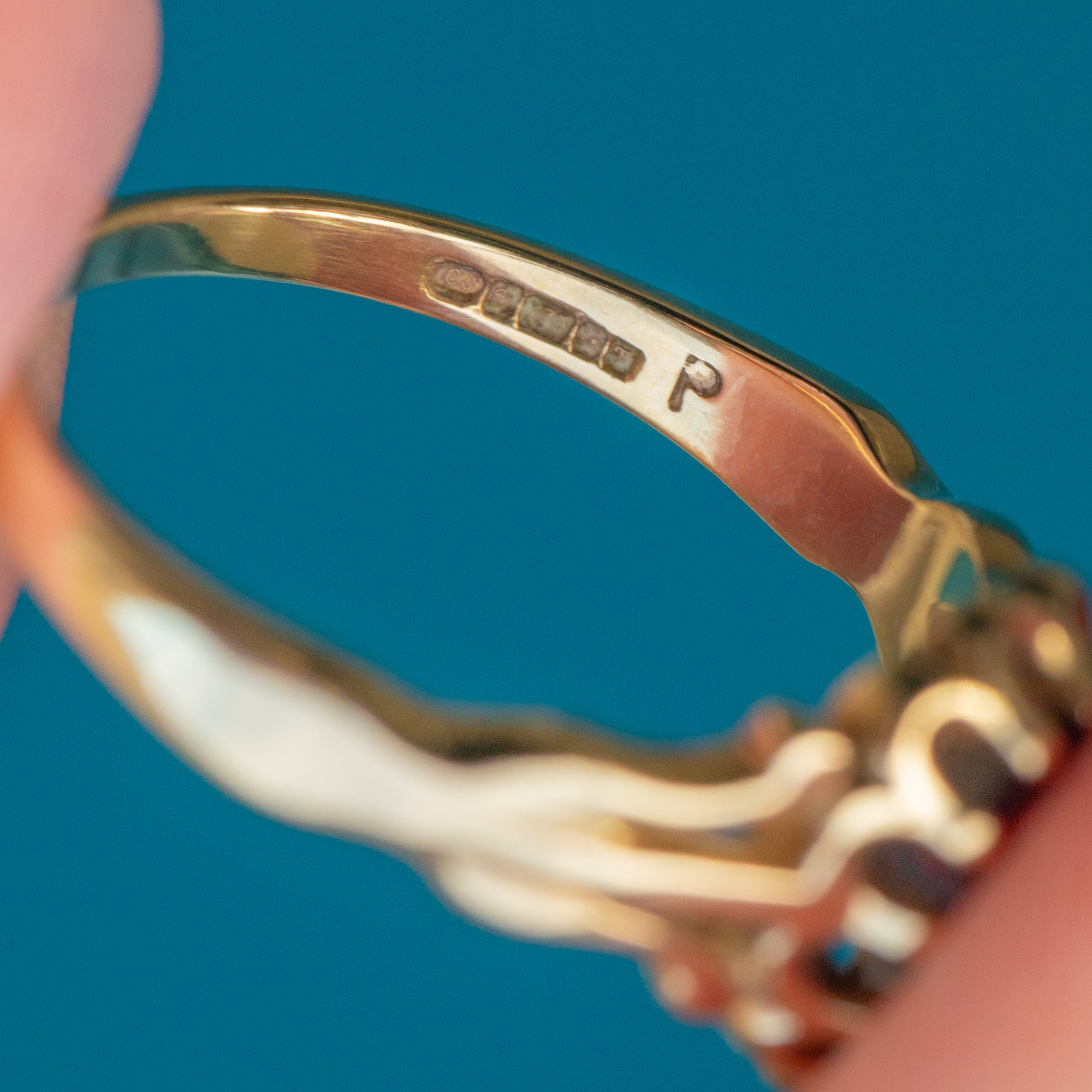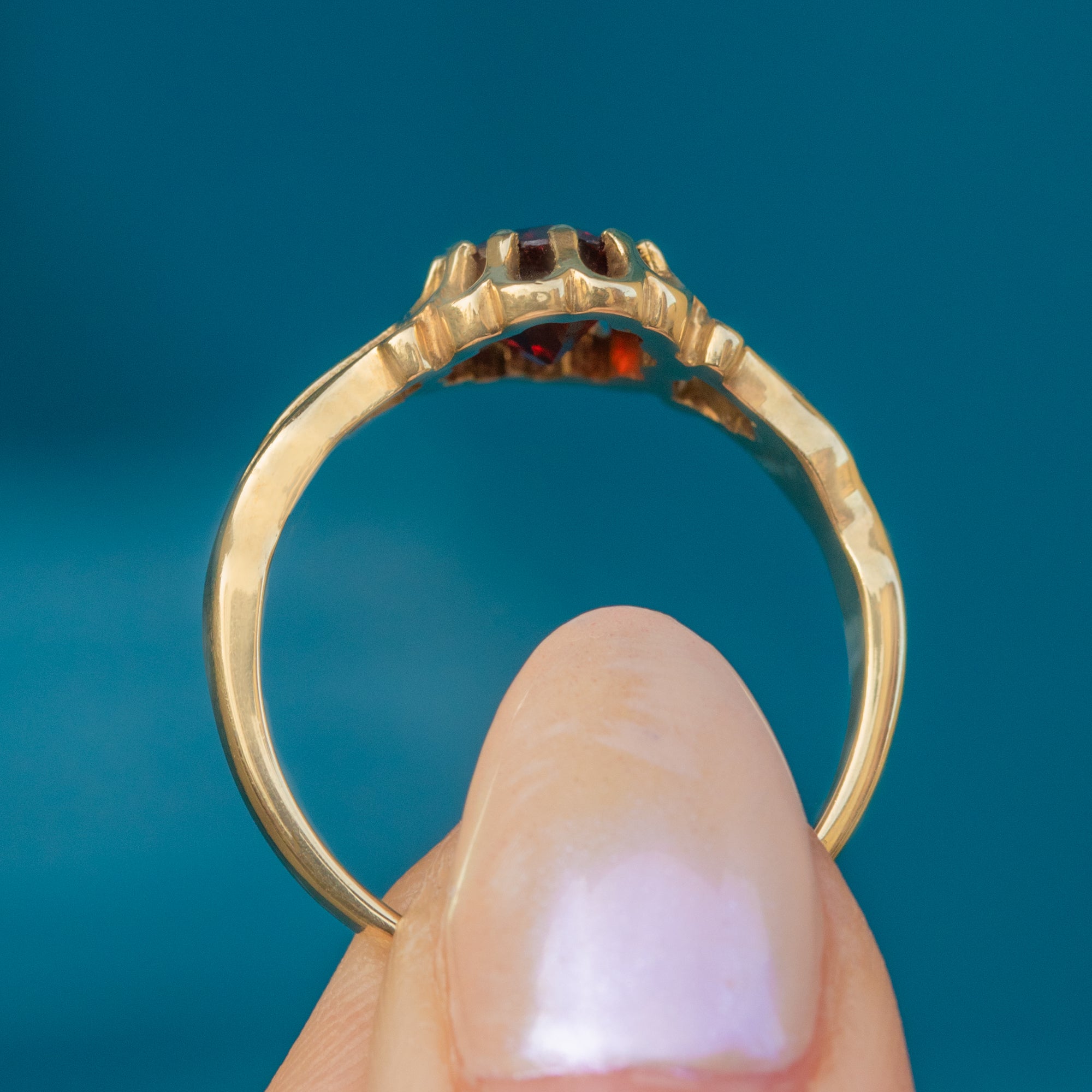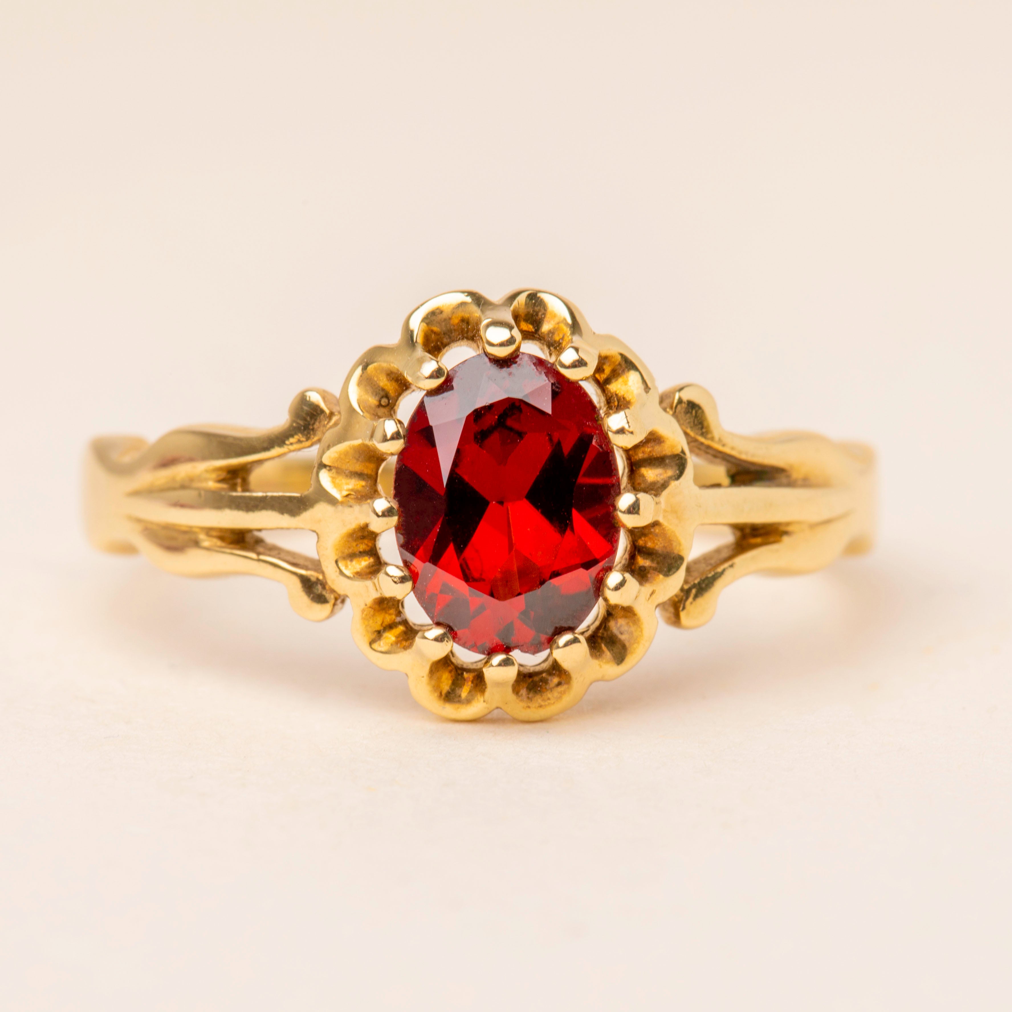 This 9ct Gold Garnet buttercup set solitaire ring will instantly seduce you with her deep crismon Garnet and ornately formed band! Crafted from buttery 9ct Gold, this vintage ring displays exquisite craftsmanship, and is Victorian in style, with the decorative band looking striking and robust.