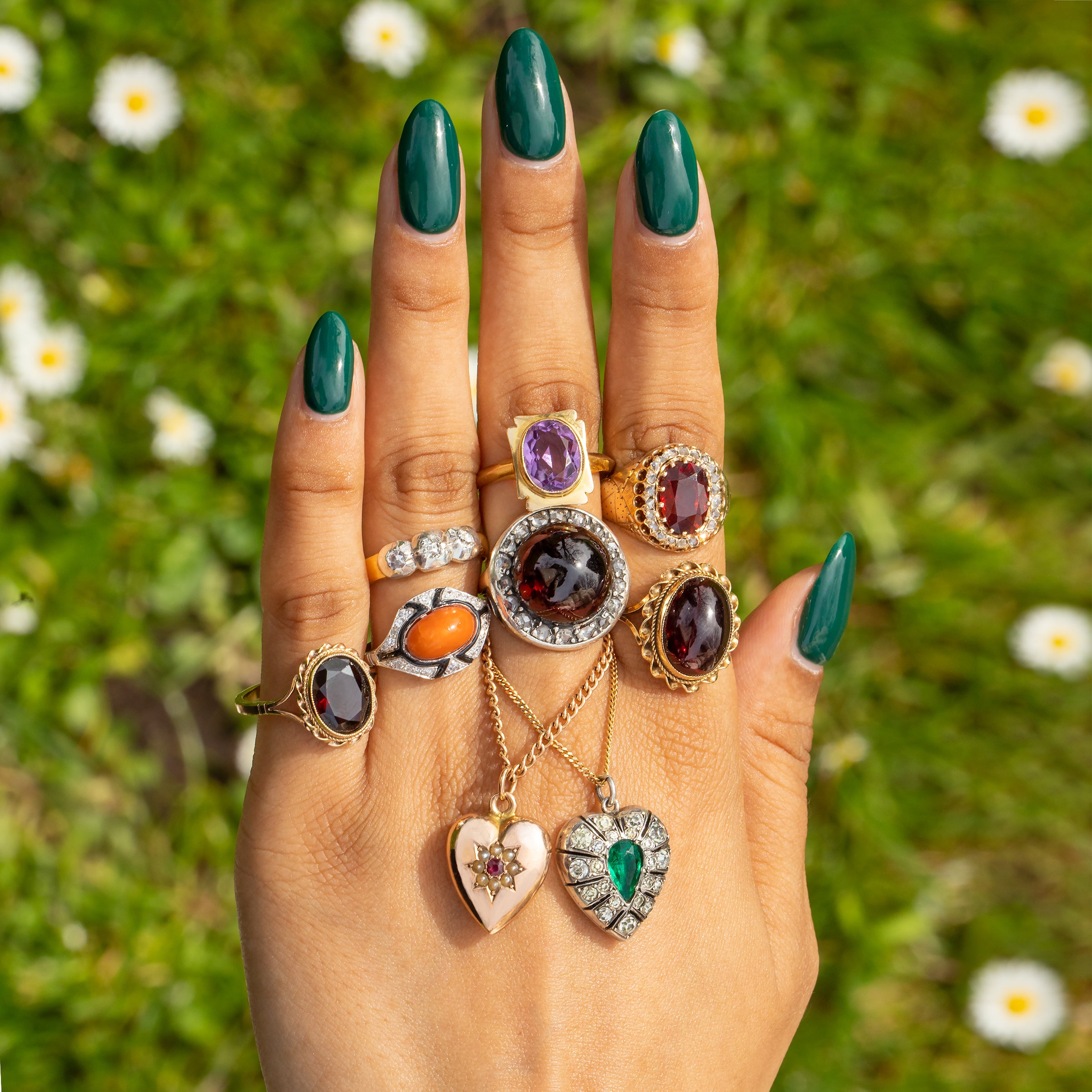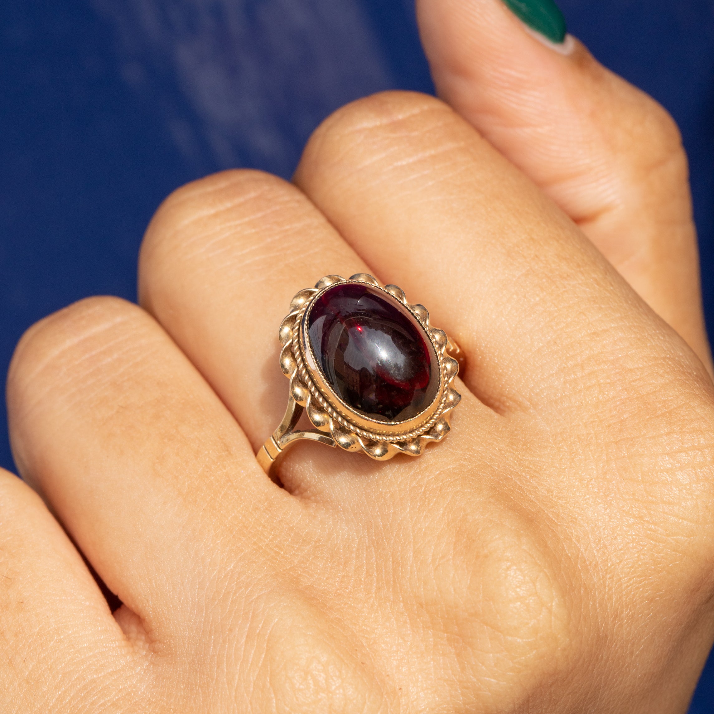 The smooth, sensual form is adorned with 9ct Gold rope borders giving this vintage Granet ring a sophisticated appeal. And when the light hits just right, it's a truly magical thing that seems to glow from within!
