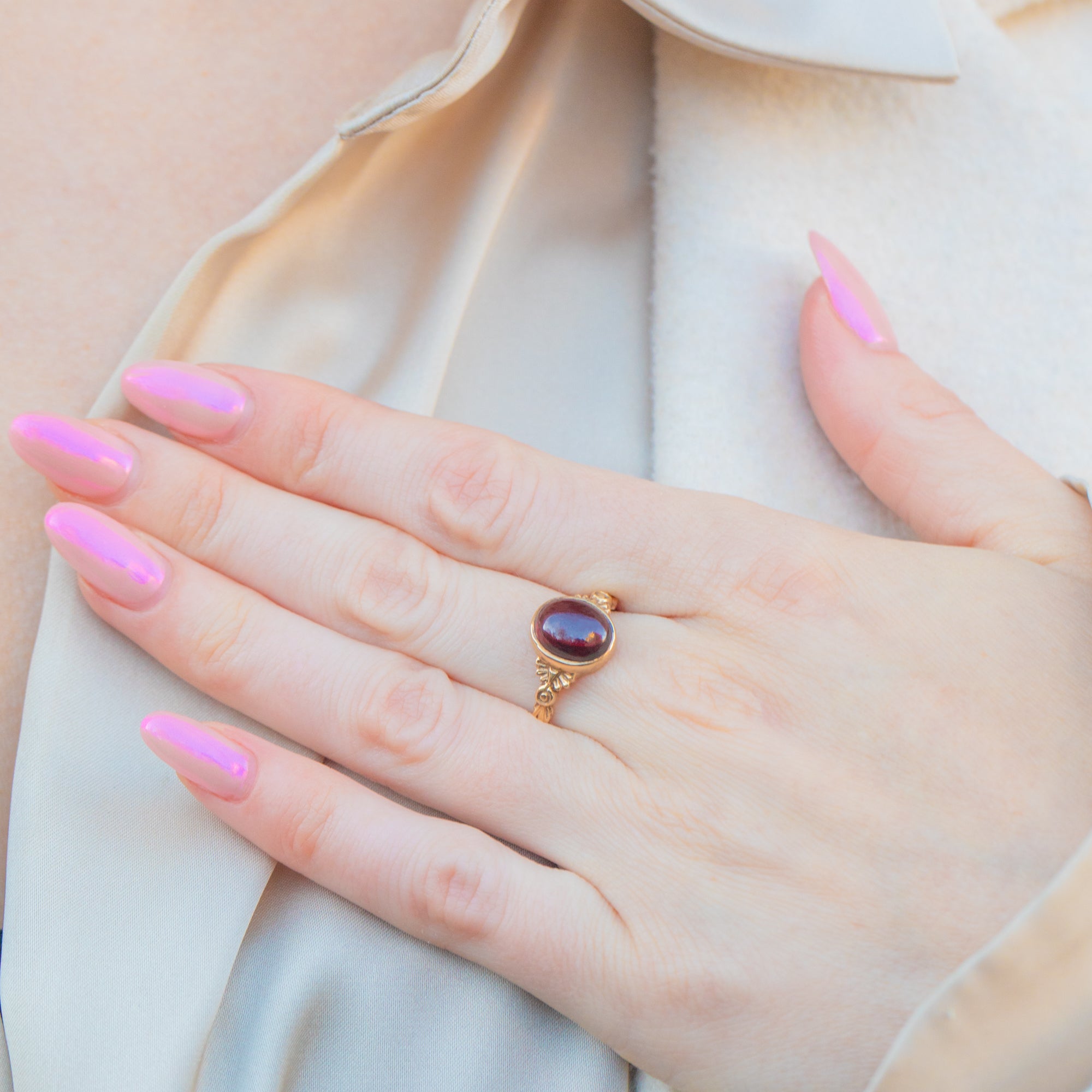 9ct Gold Garnet Cabochon Ring, Ornate Shoulders