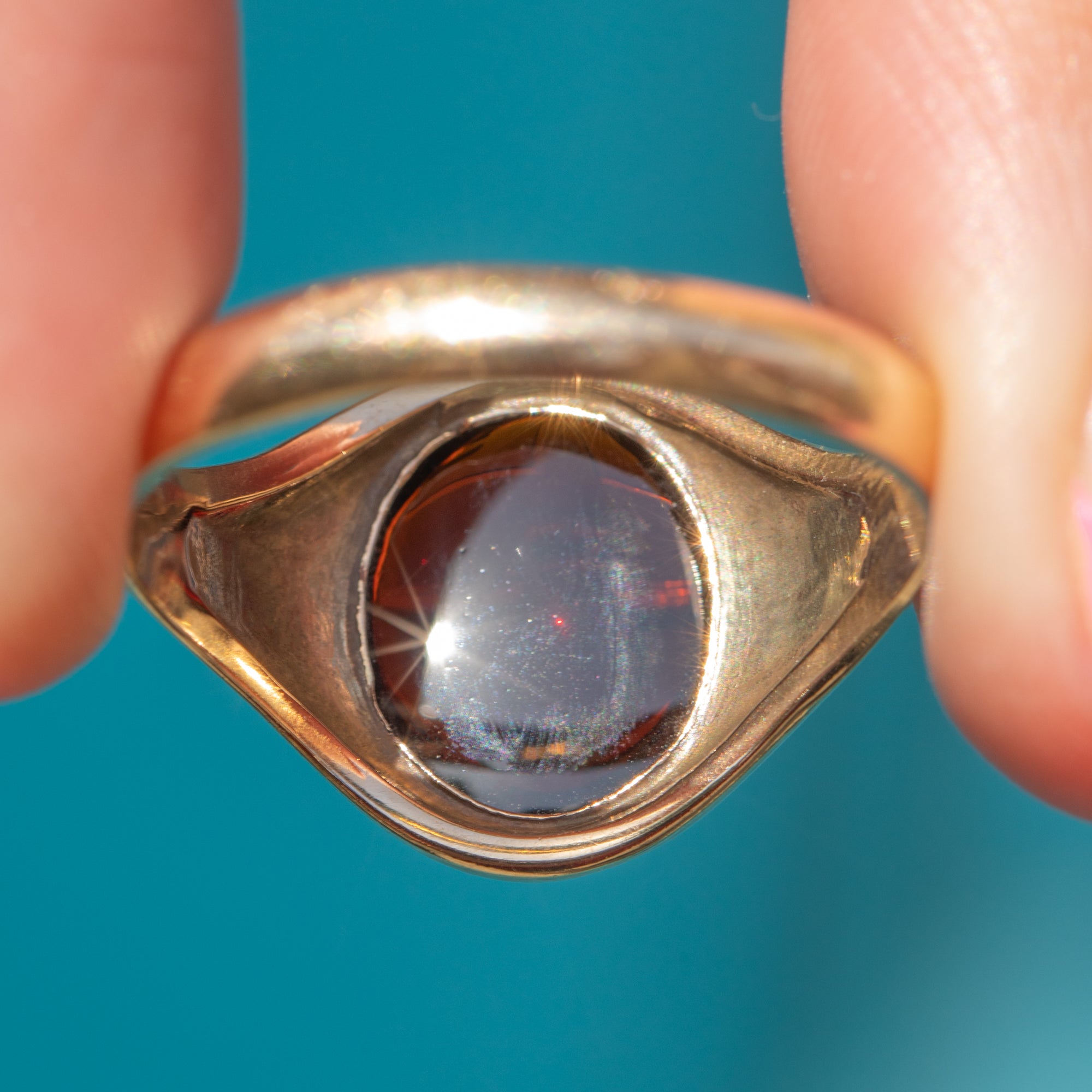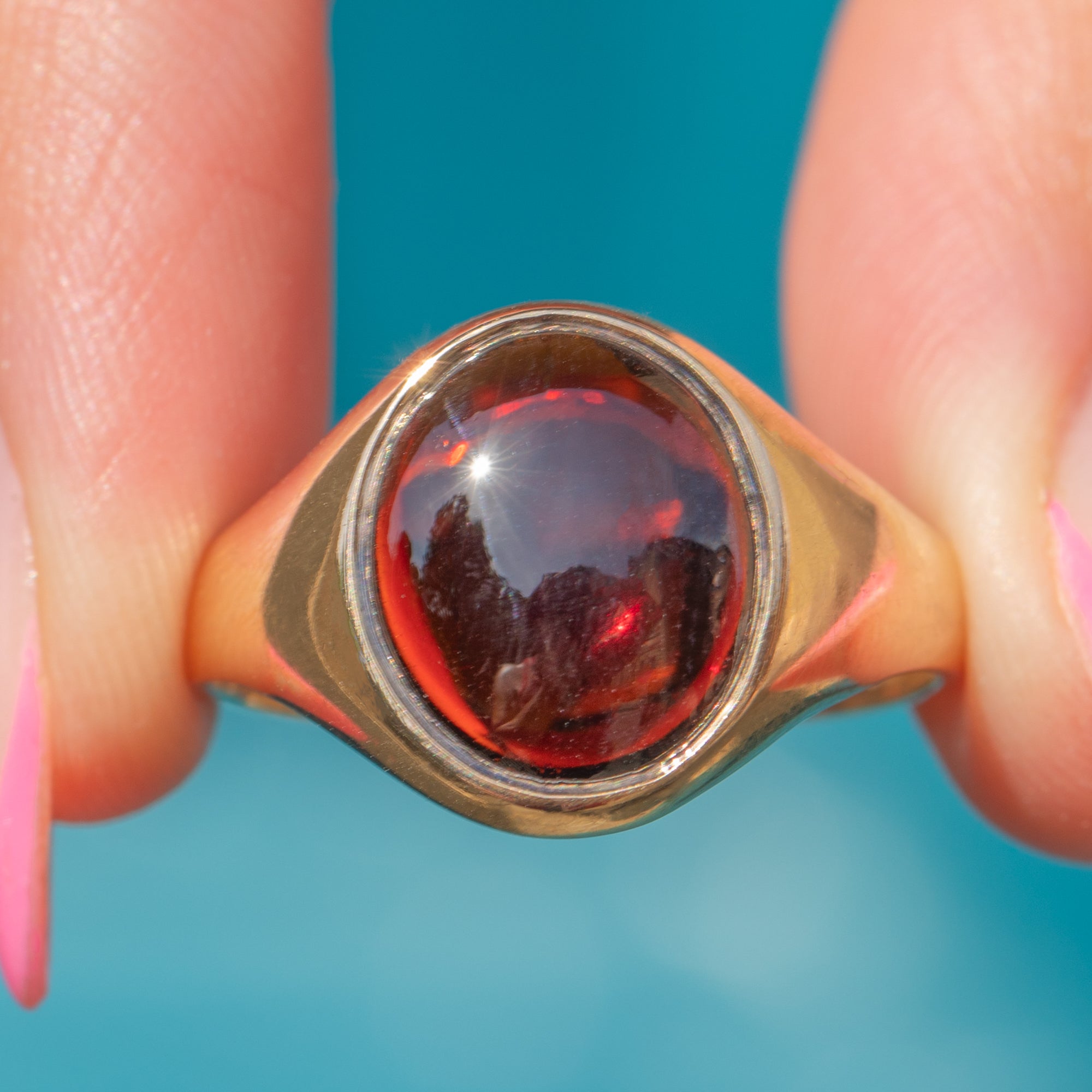 In her centre sits a deep sanguine Garnet cabochon, with her smooth domed surface projecting juicy red-orange hues as she captures the light. The Garnet is set within a glossy 9ct Gold signet ring, with its chunky band providing comfortable wear and guaranteed to make a statement.