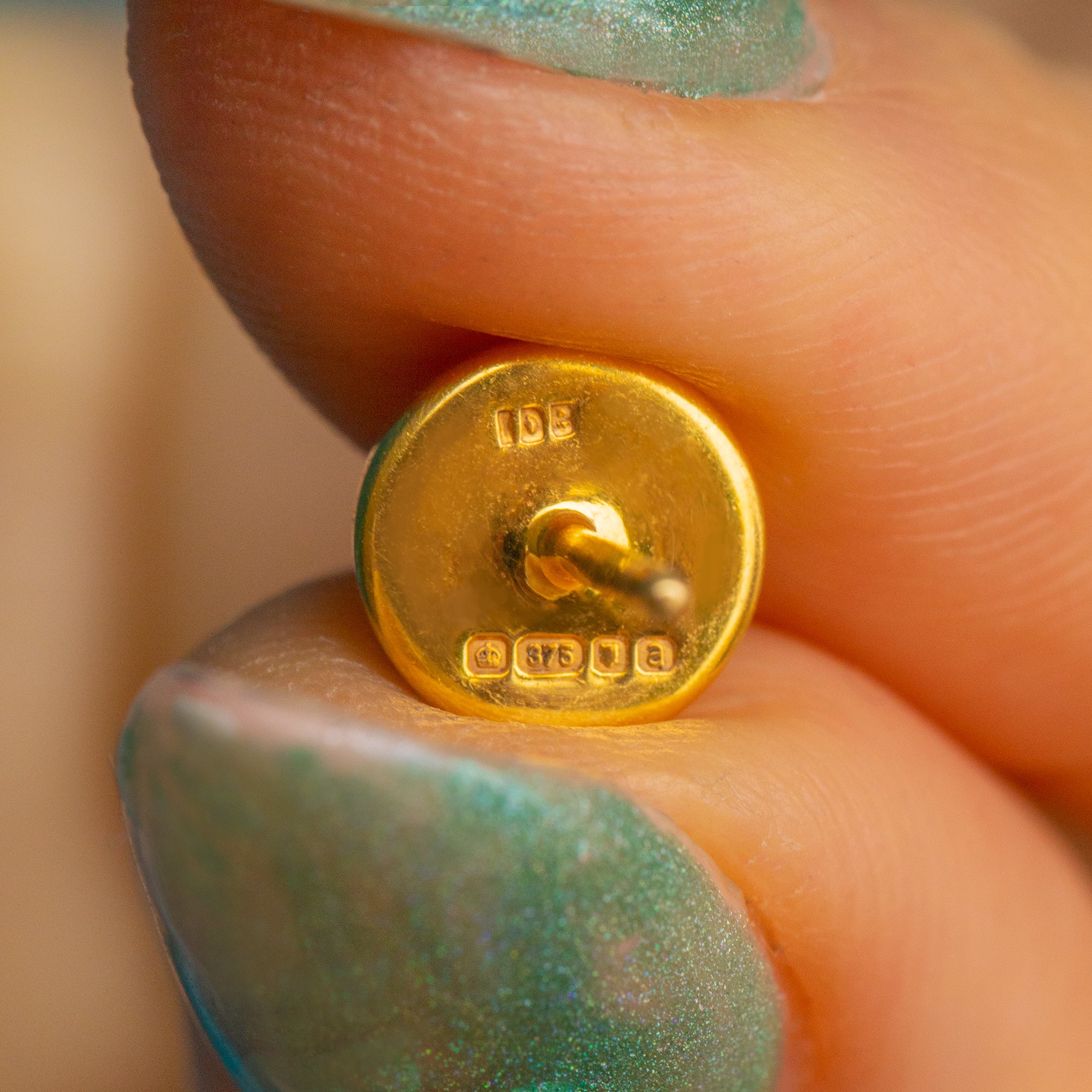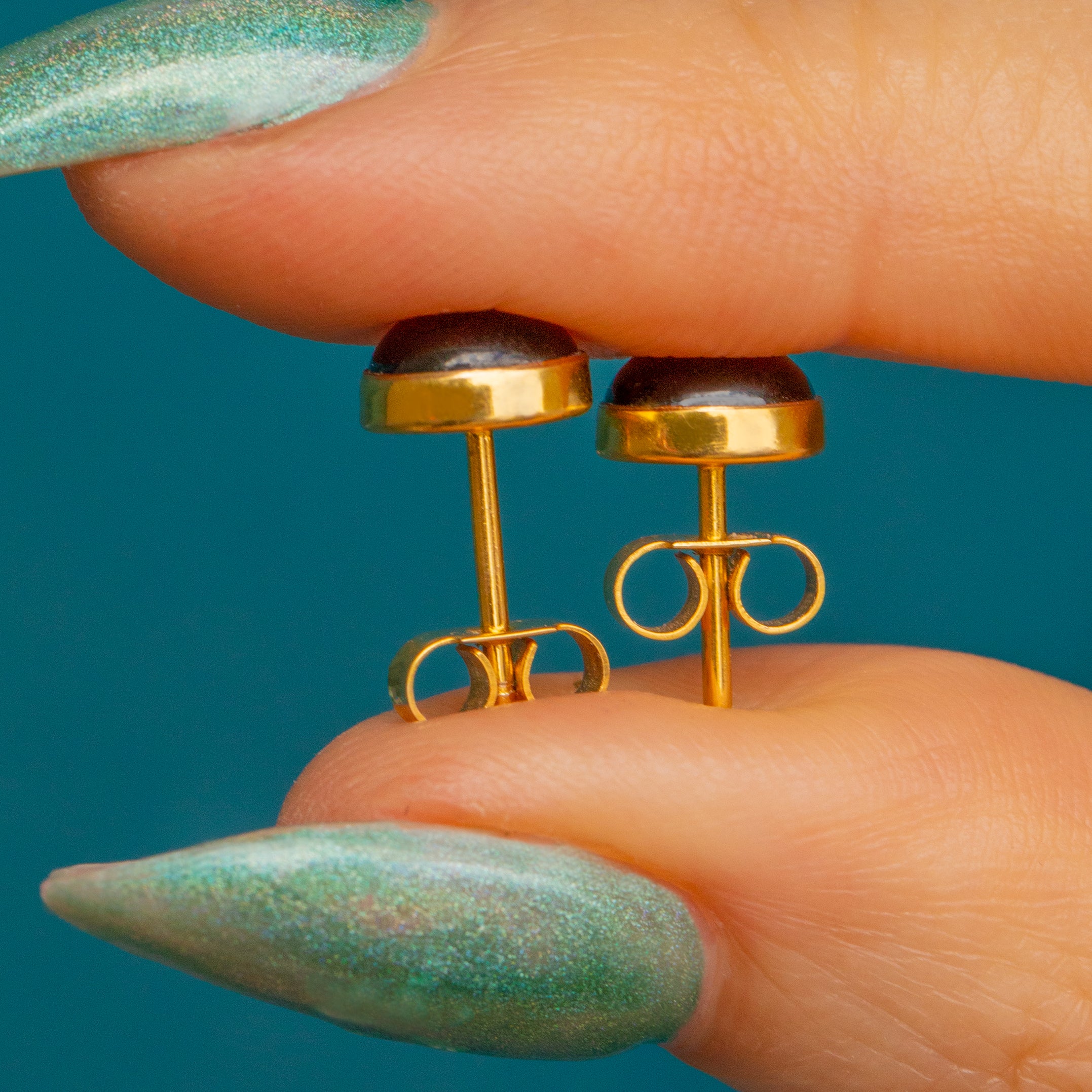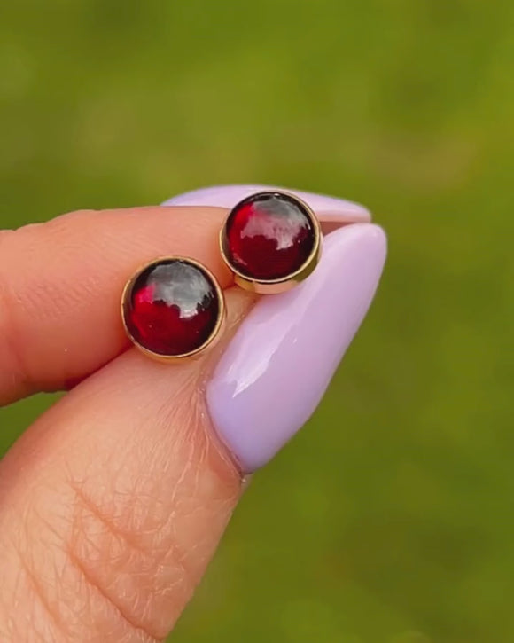 Add a touch of Vintage elegance to your ensemble with these exquisite 9ct Gold Garnet cabochon stud earrings! Deep berry red hues seep from the depths of the smoothly cut Garnet cabochons, revealing flashes of crimson as they catch the light.