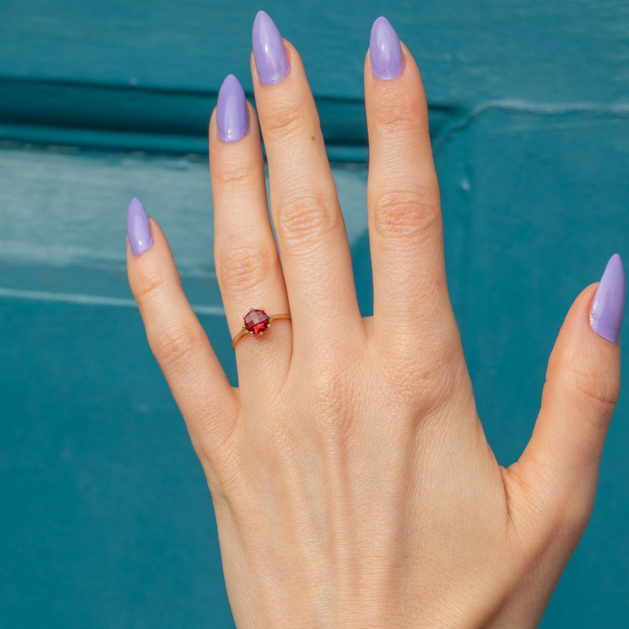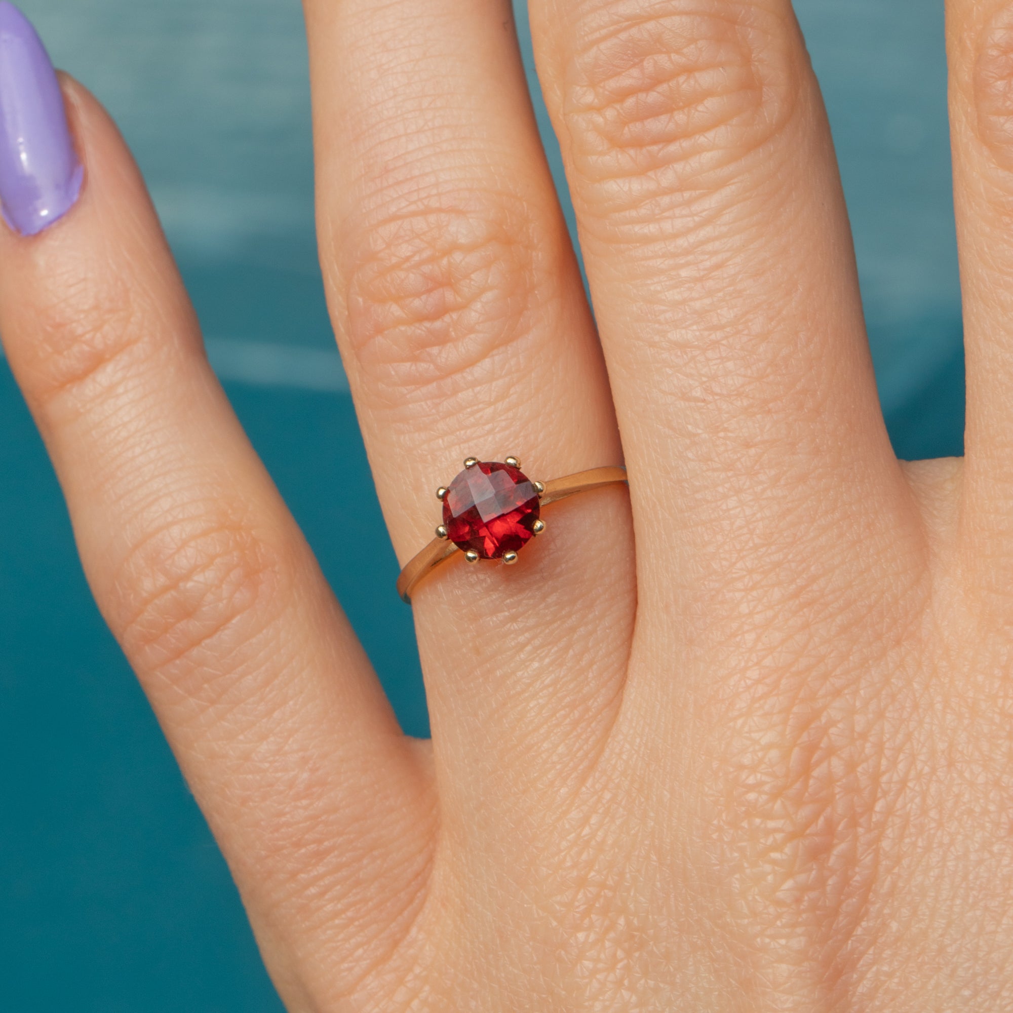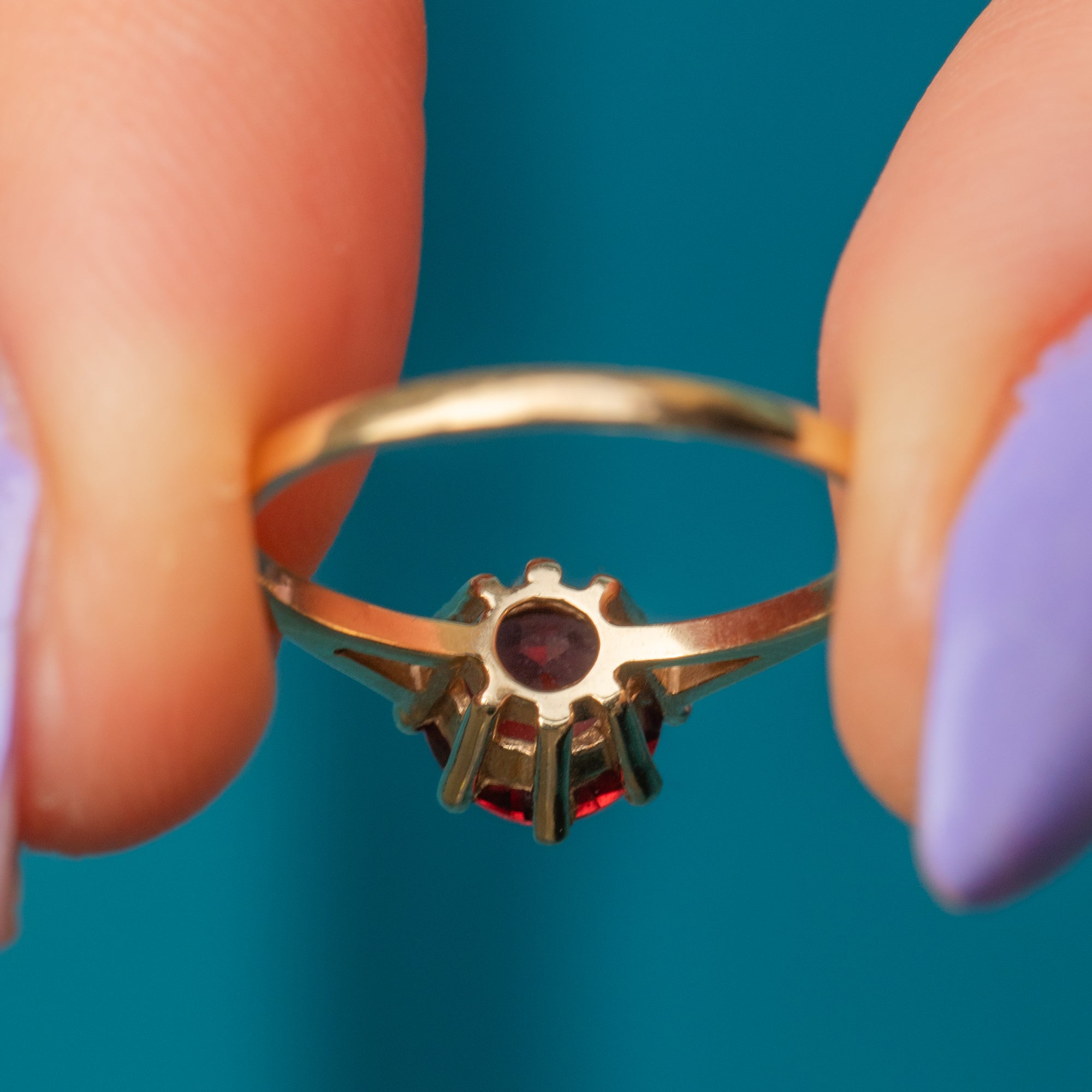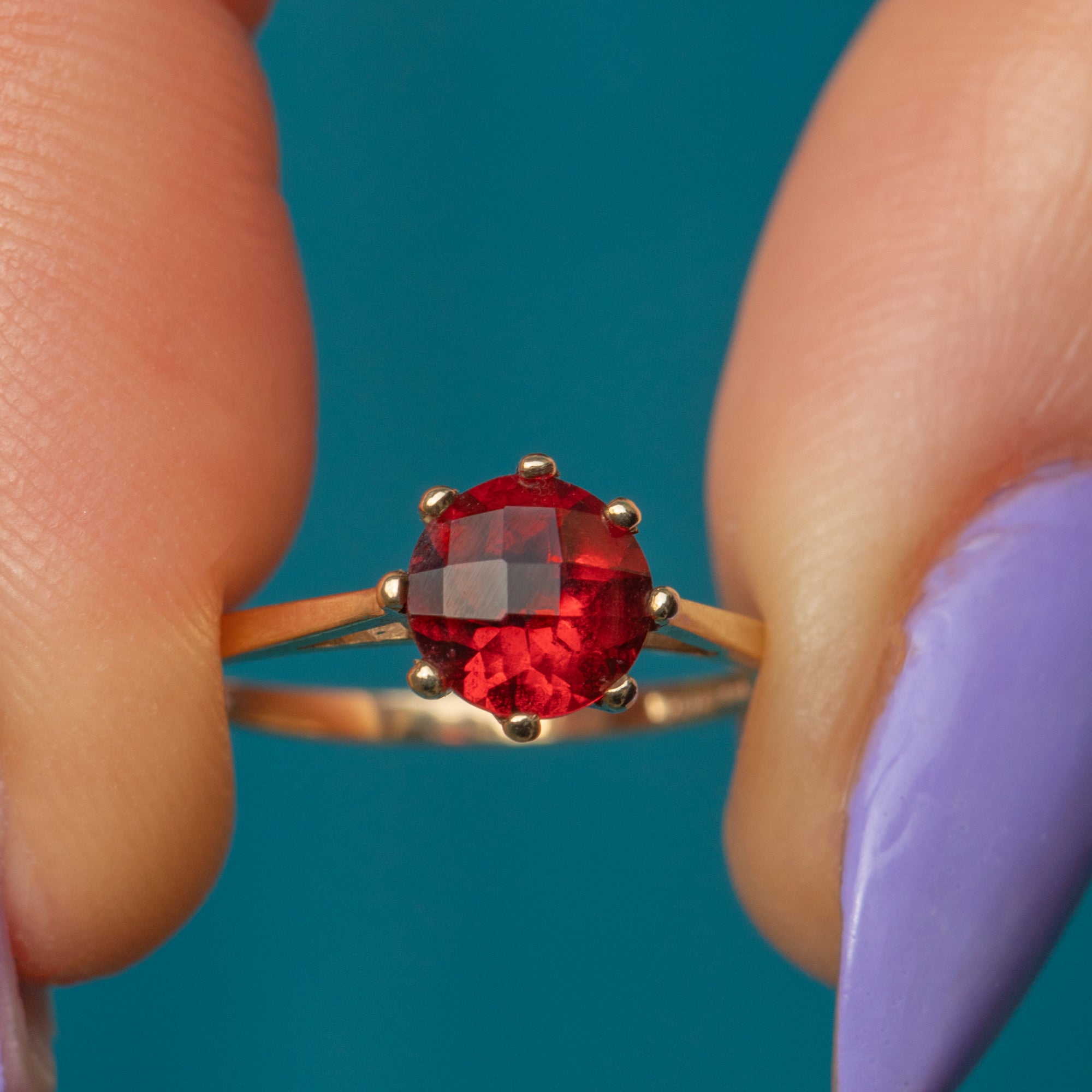 EXCELLENT. With little to report, this 9ct Gold Garnet chequerboard-cut solitaire ring is in excellent condition! The Garnet is fabulously faceted and securely set. All of the claws are present, and the 9ct Gold band is sturdy and smooth, making this vintage Granet ring a comfortable choice for daily wear!