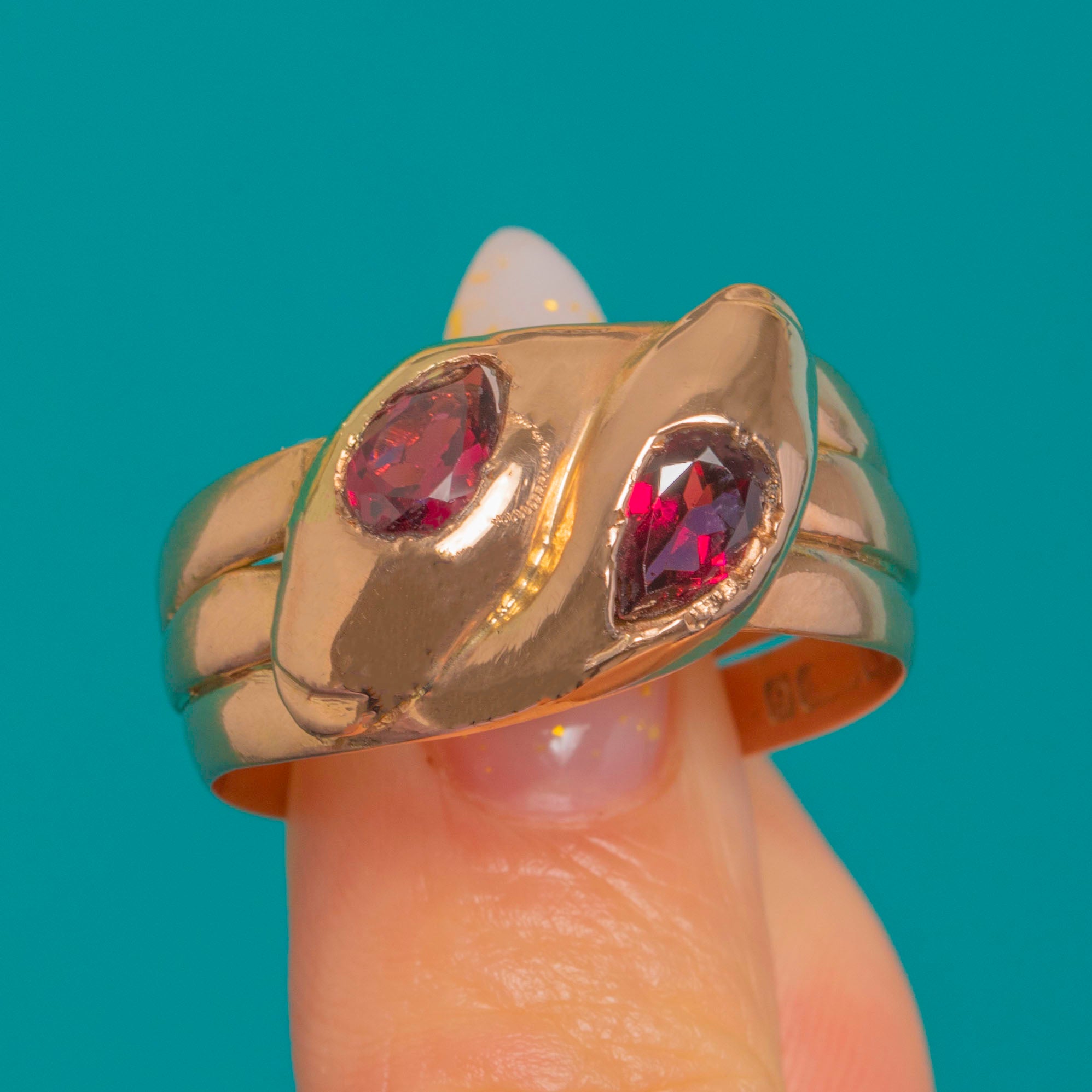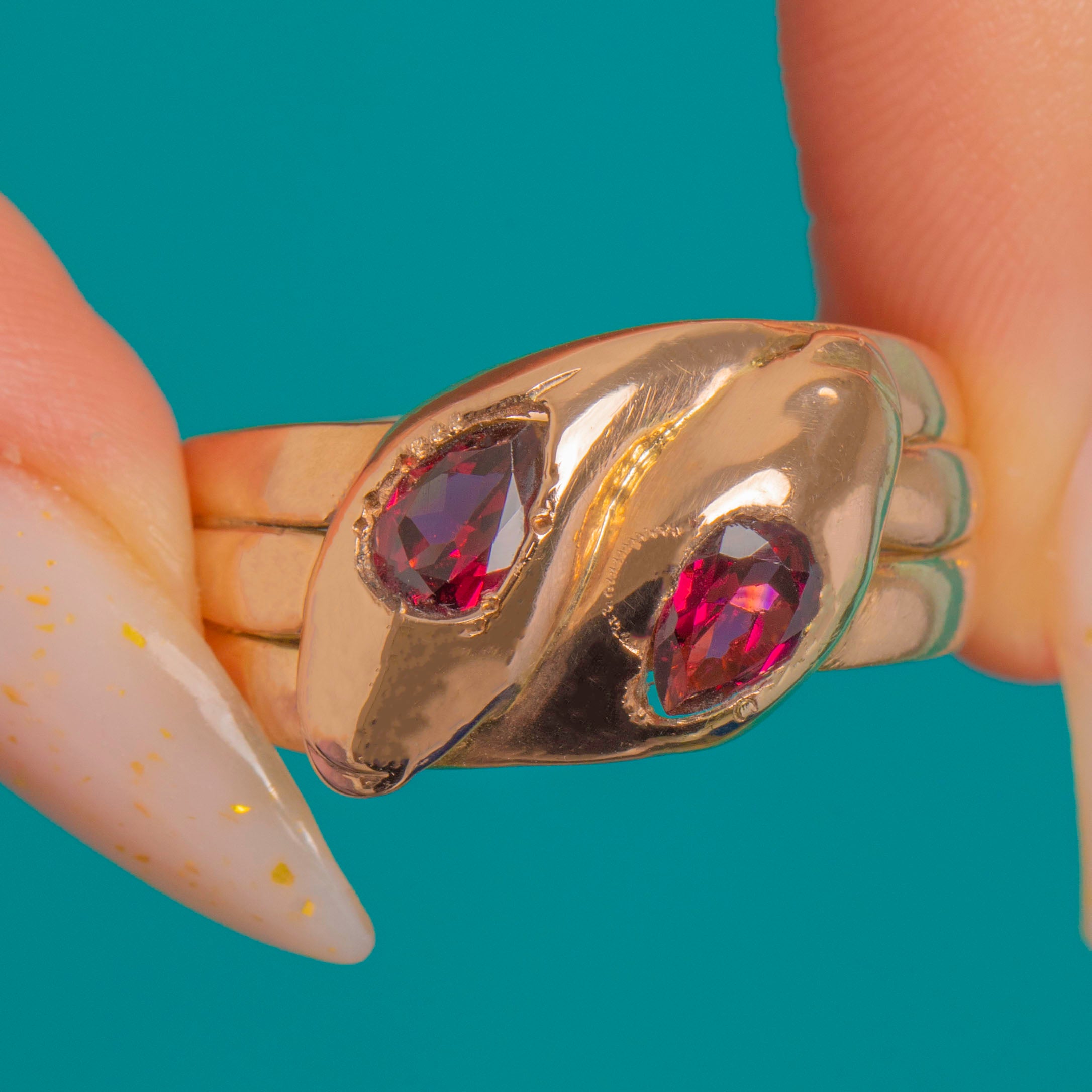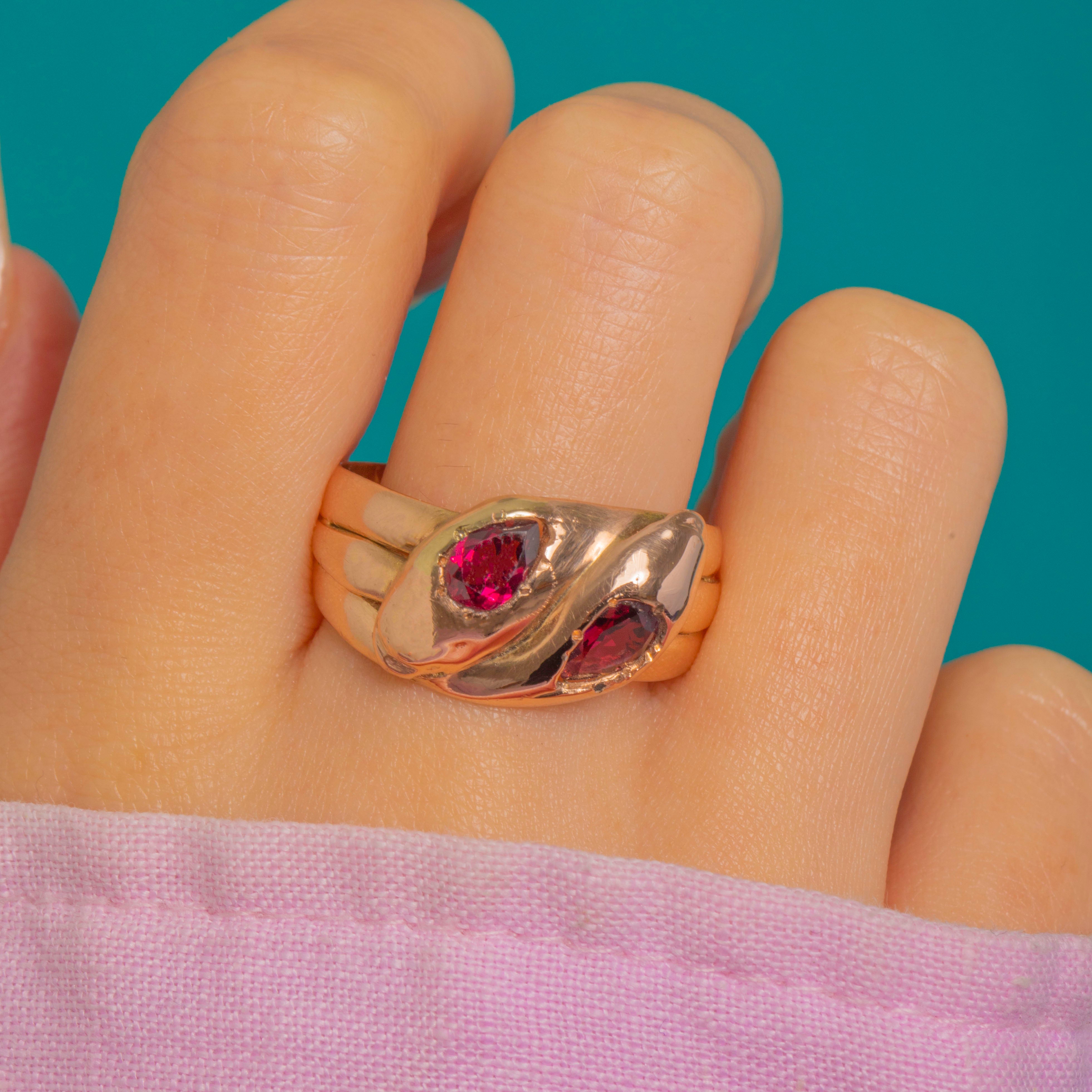 A striking double-serpent “toi et moi” ring crafted in 9ct Gold, this sculptural design brings two stylised snake heads together in a romantic S-curve. Each head is flush-set with a pear-cut deep pink-red Garnet, creating a sleek profile with a smooth, polished finish.