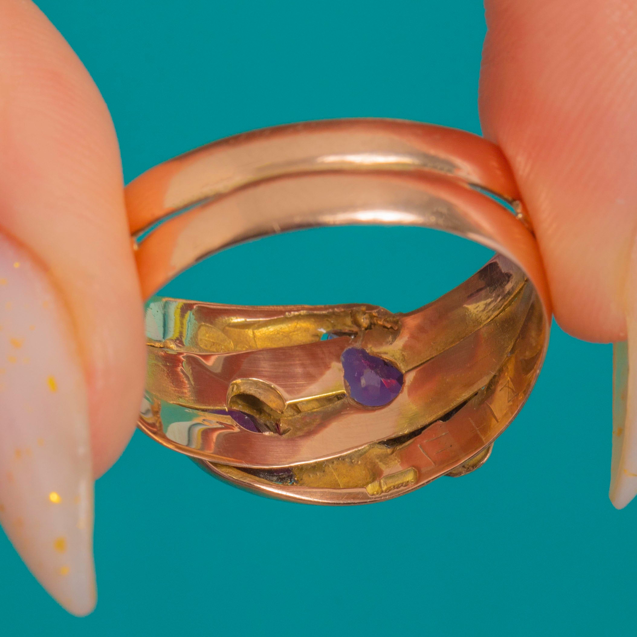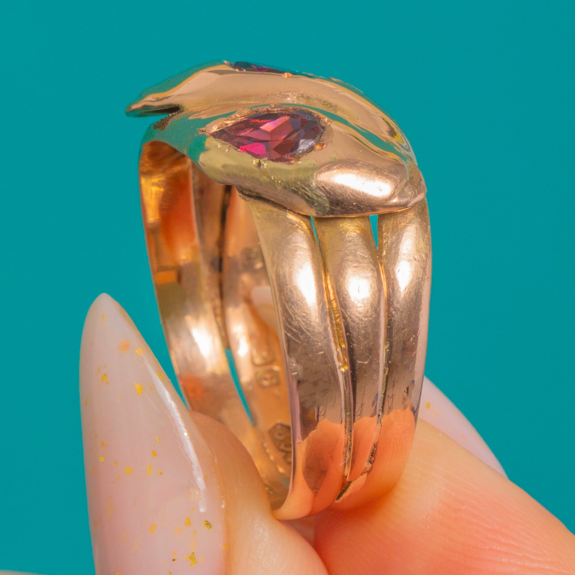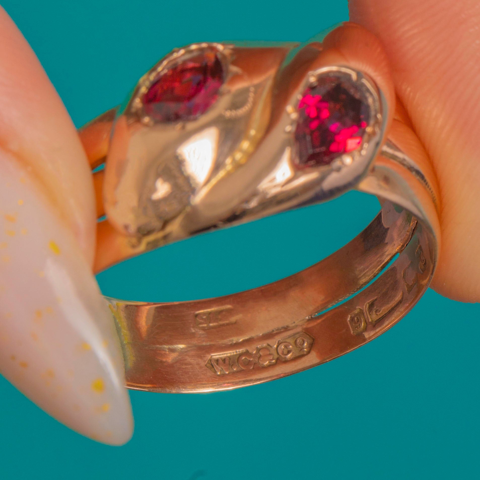 A striking double-serpent “toi et moi” ring crafted in 9ct Gold, this sculptural design brings two stylised snake heads together in a romantic S-curve. Each head is flush-set with a pear-cut deep pink-red Garnet, creating a sleek profile with a smooth, polished finish.