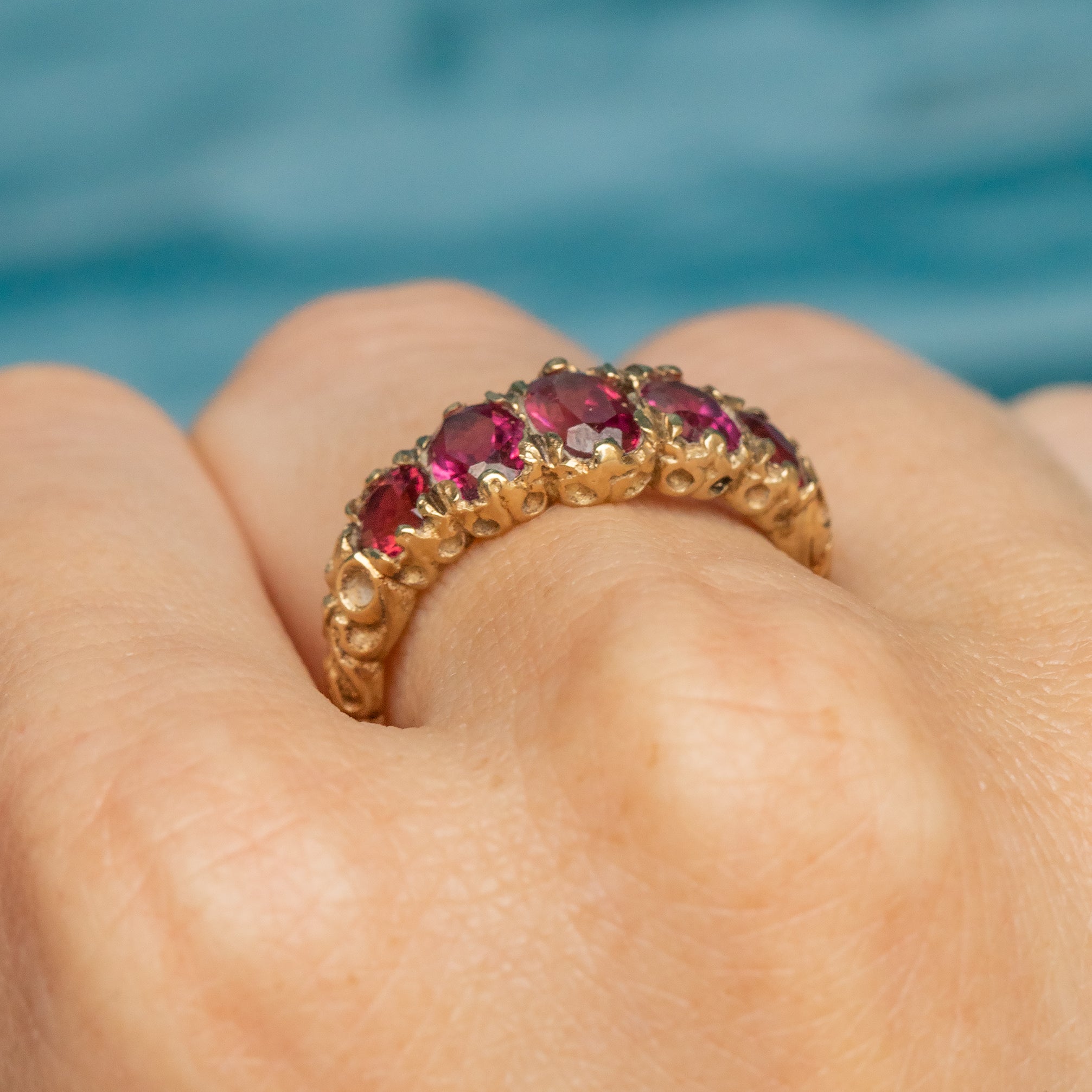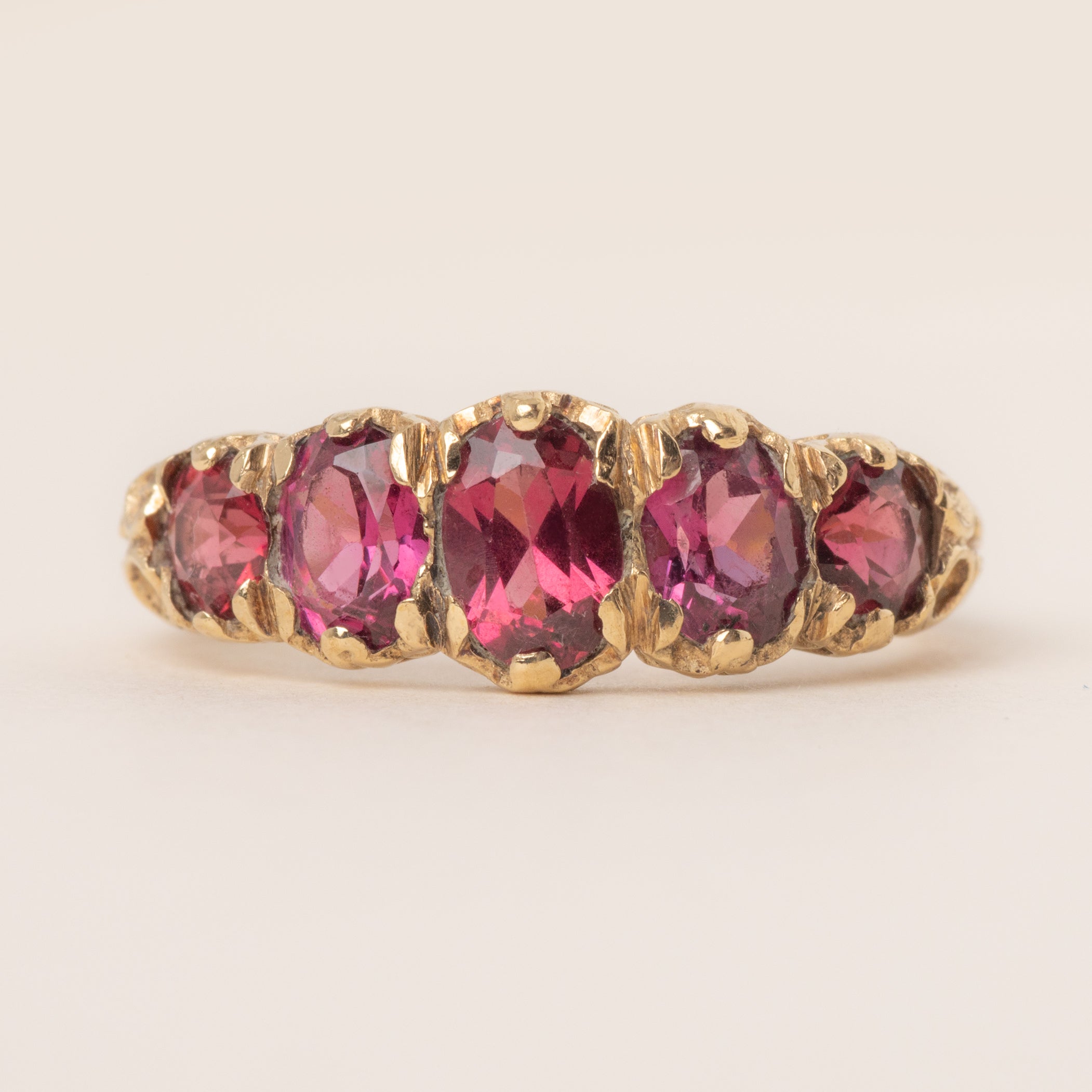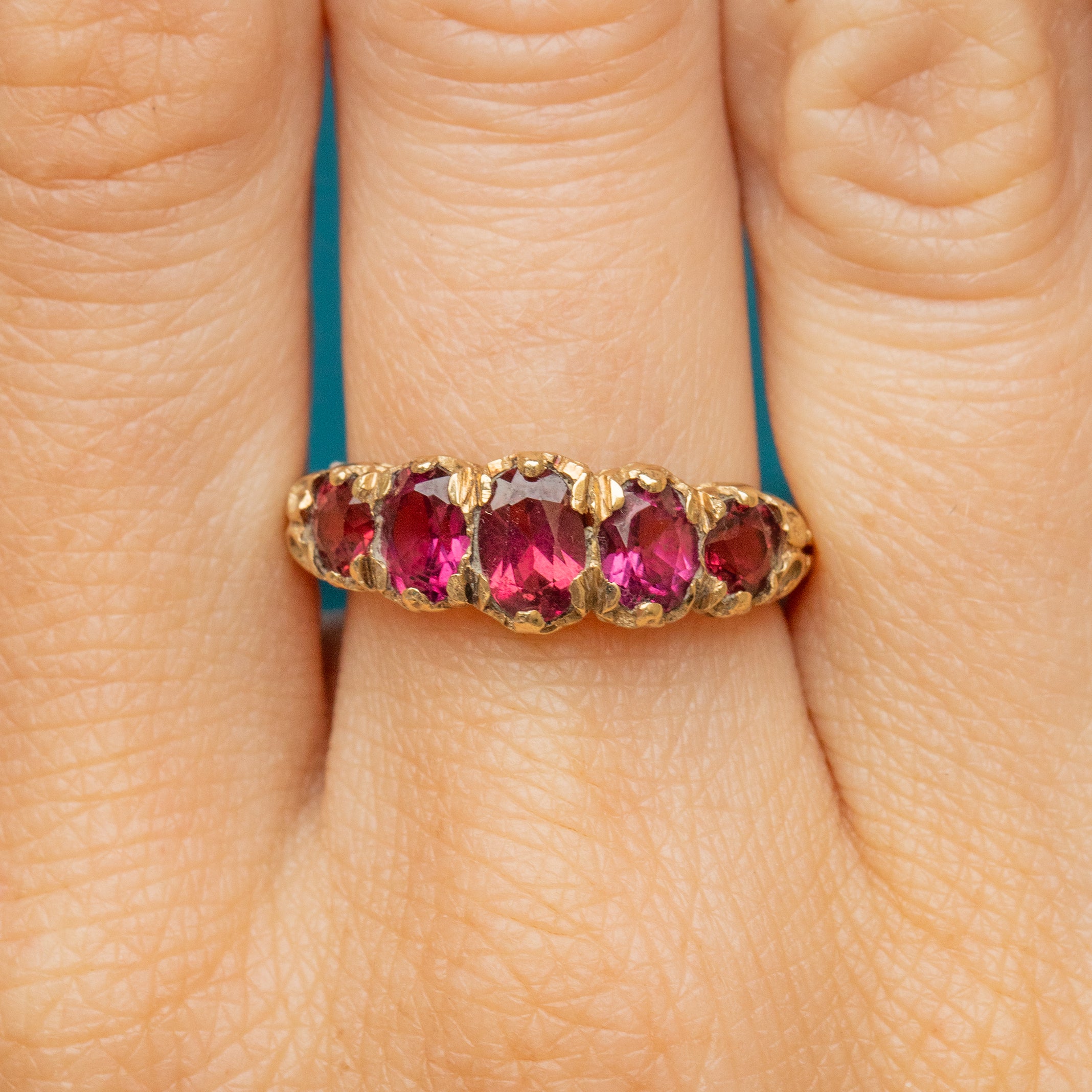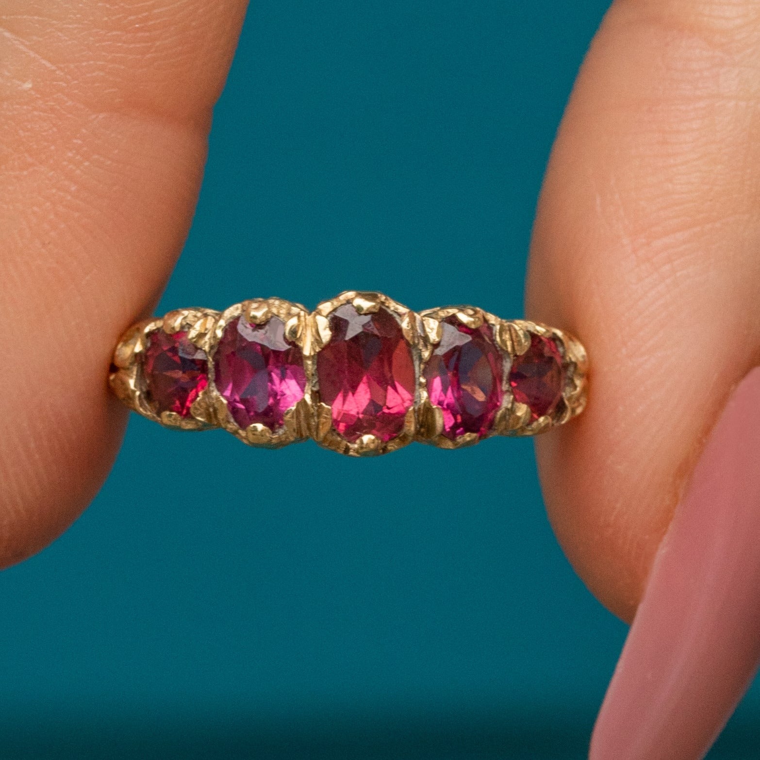 This 9ct Gold Garnet five stone ring takes heavy inspiration from the romanticism and seduction of the Victorian period, with pink and jammy plum-hued Garnets, their fabulously faceted form catches perfectly beneath the light!