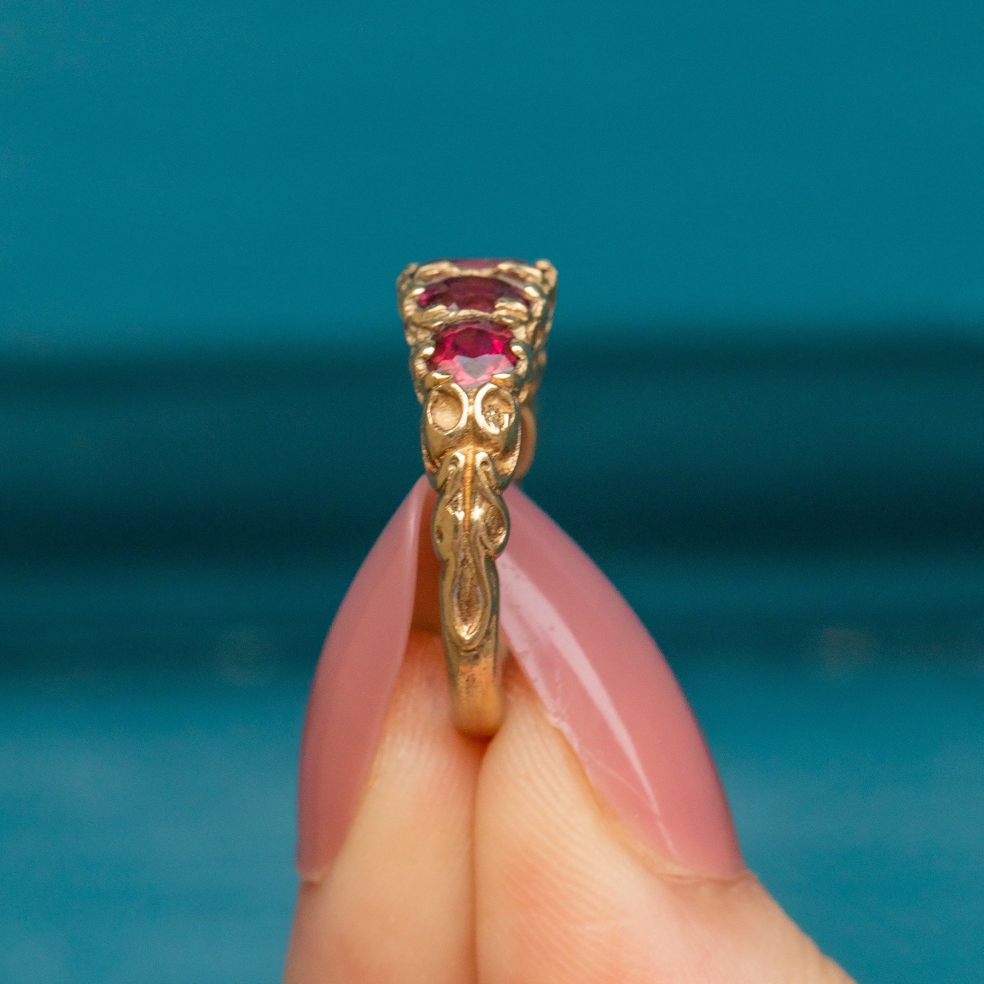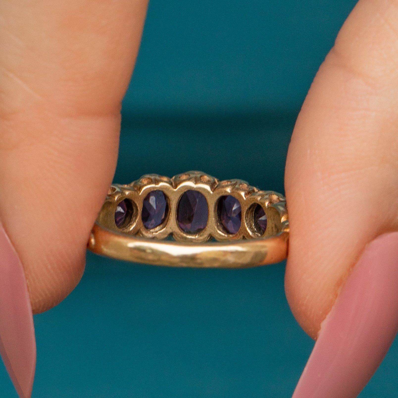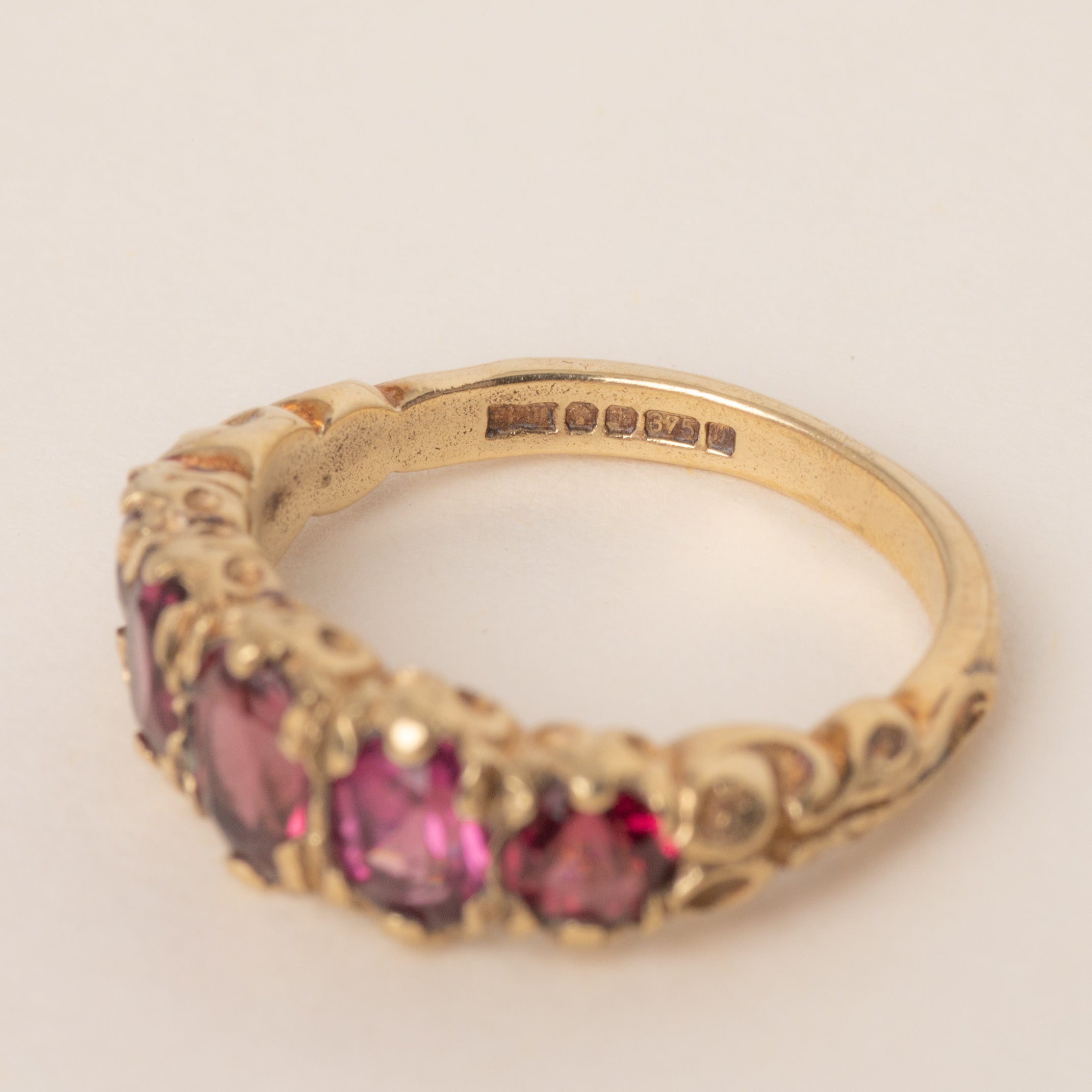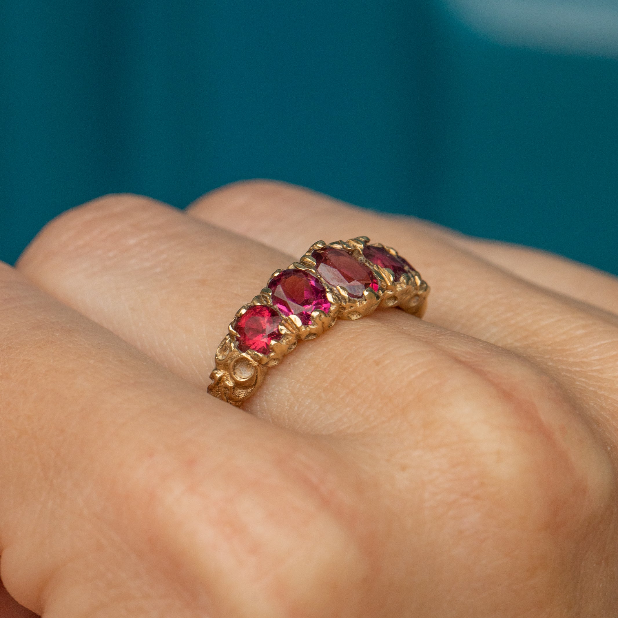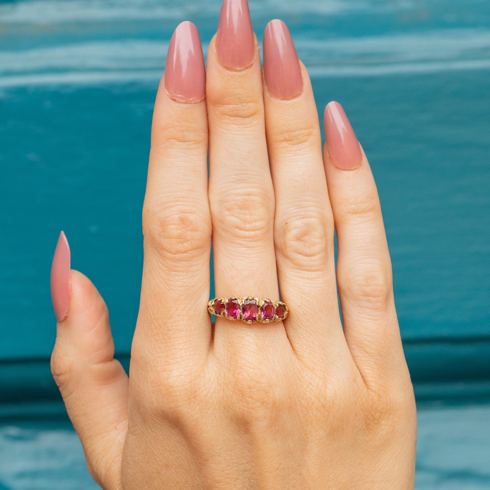 This 9ct Gold Garnet five stone ring takes heavy inspiration from the romanticism and seduction of the Victorian period, with pink and jammy plum-hued Garnets, their fabulously faceted form catches perfectly beneath the light!