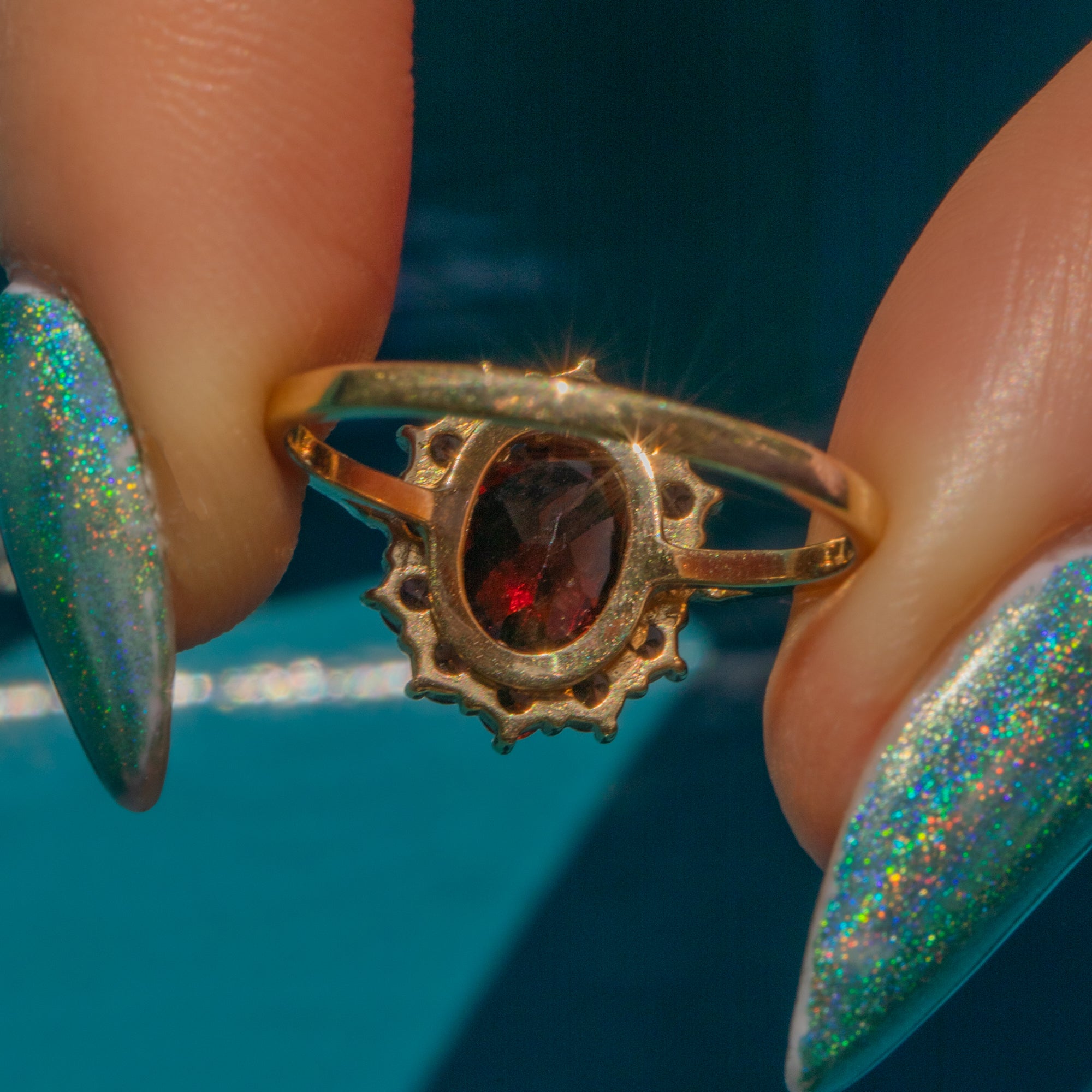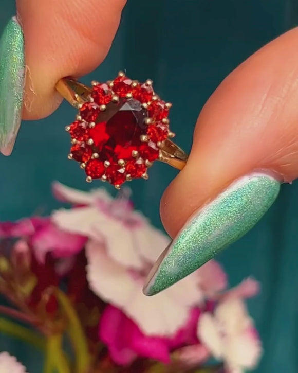 This 9ct Gold Garnet flower cluster ring is bursting with romance and seduction. Her juicy crimson hues bounce from one Garnet to the next, forming her feminine floral cluster that provides wonderful hand coverage.