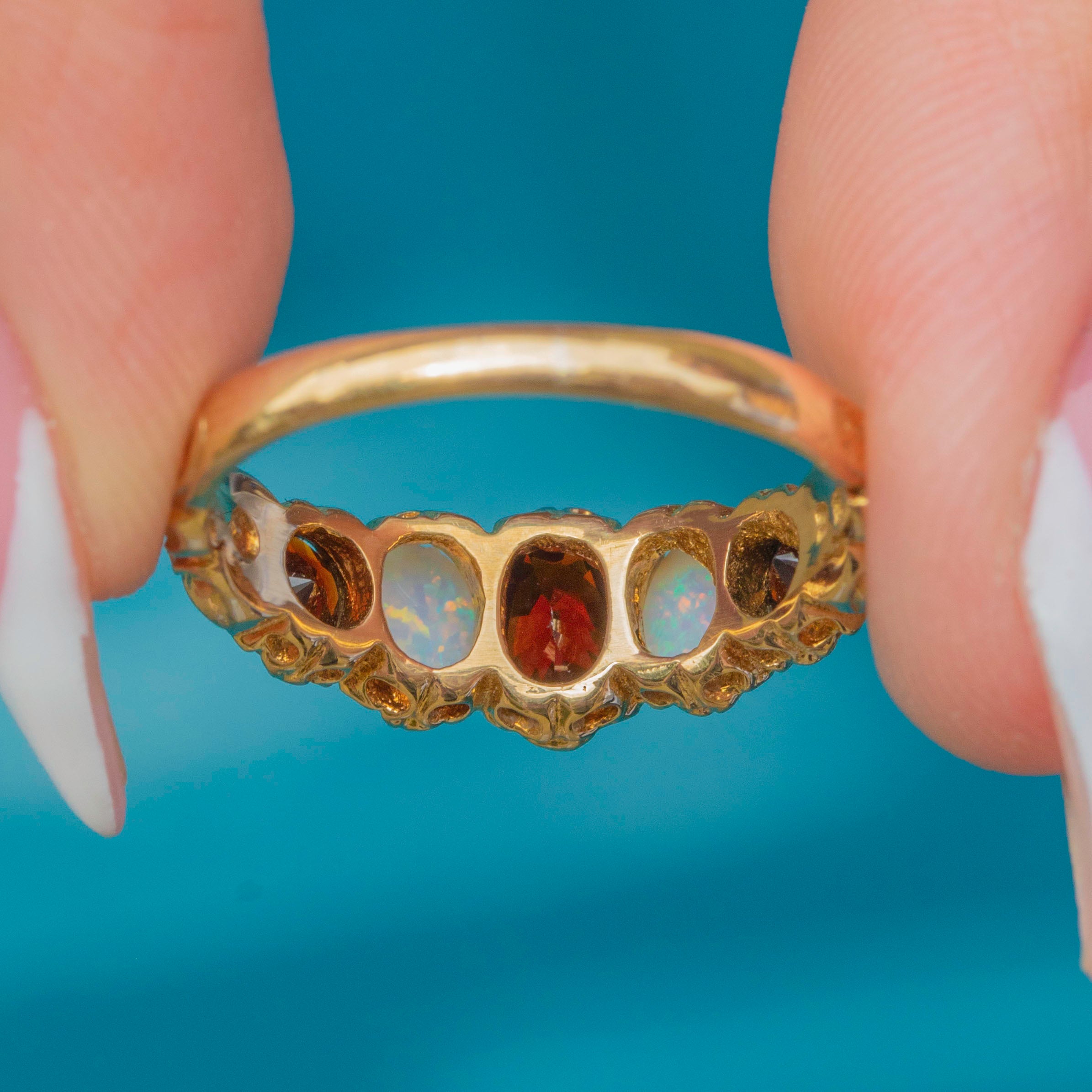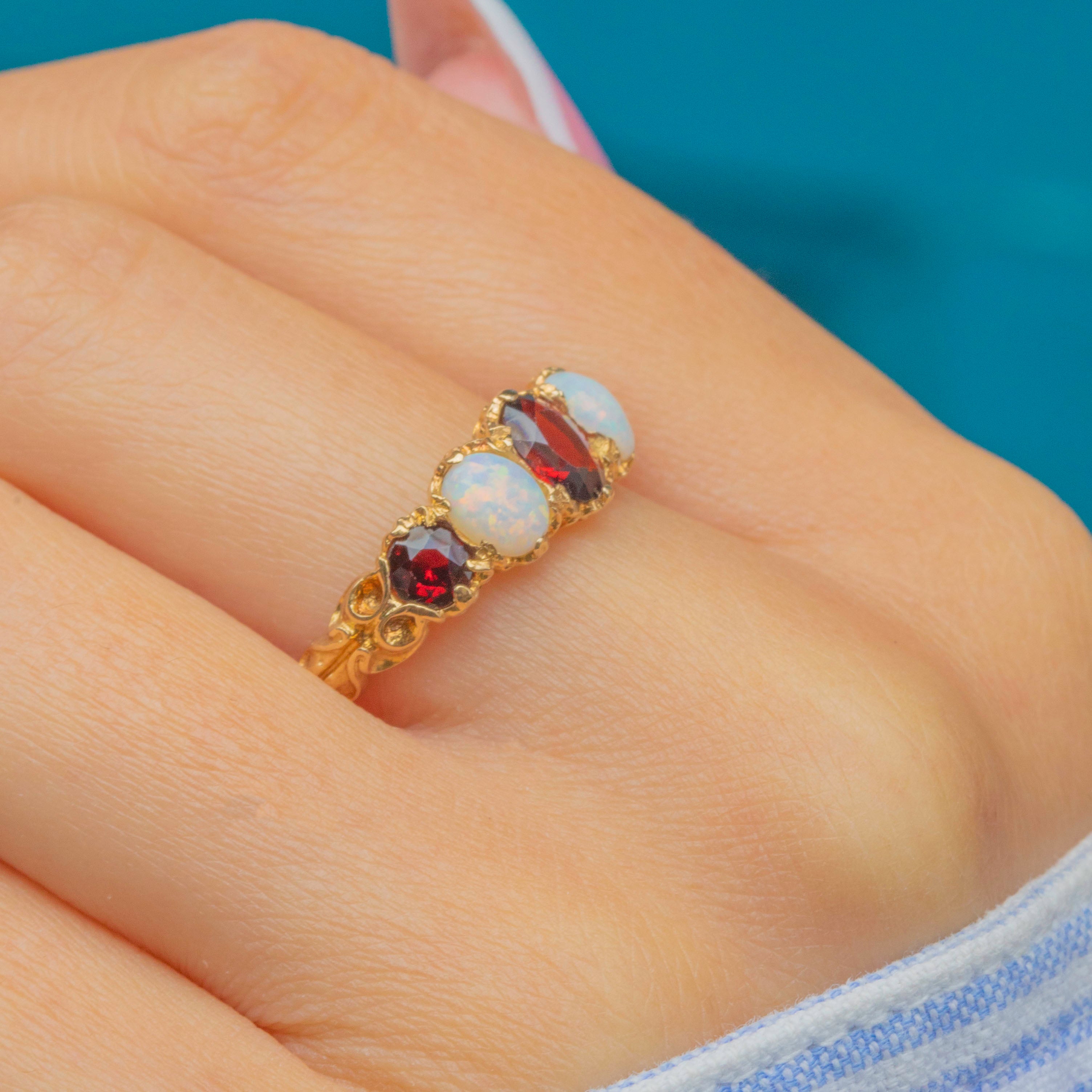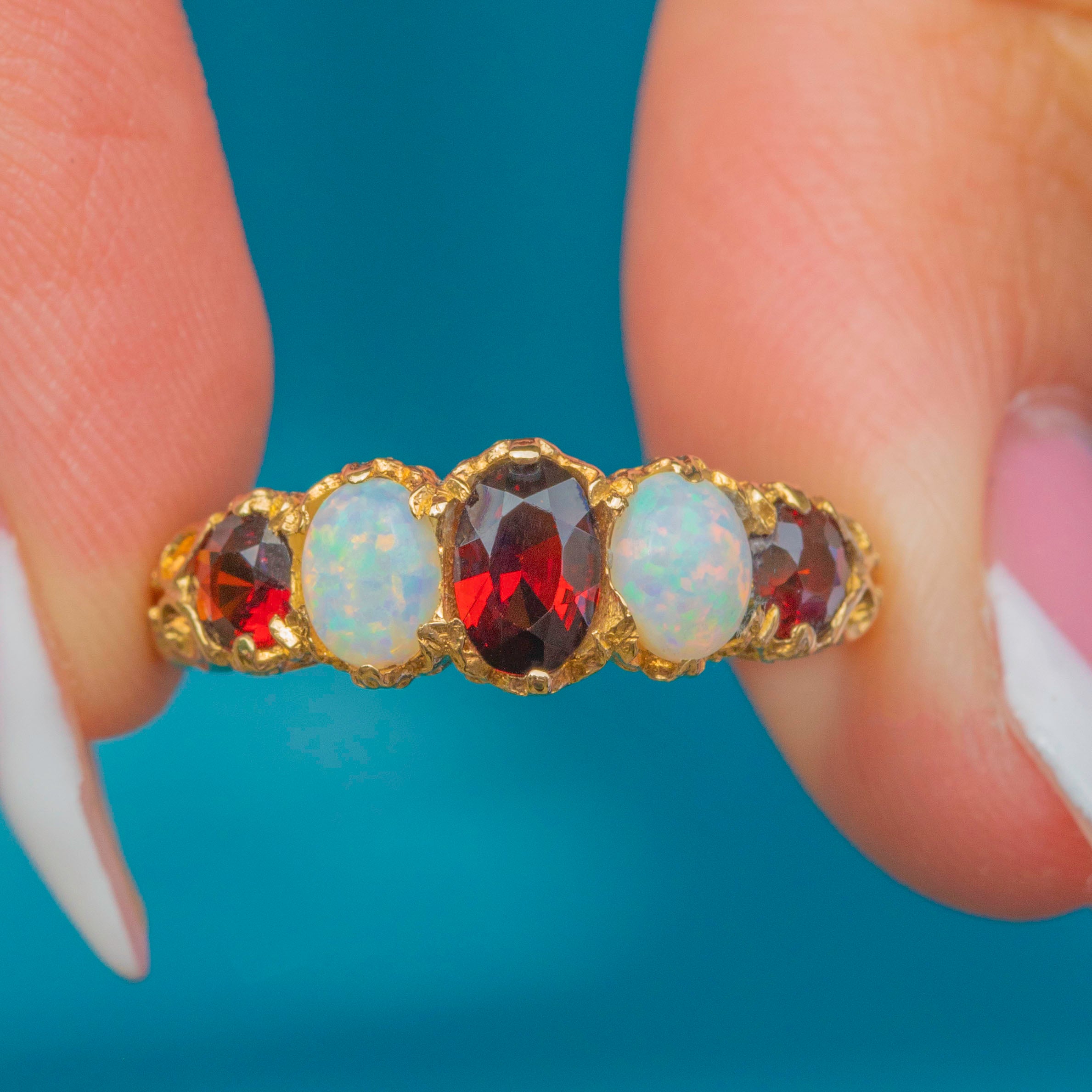 This vibrant five-stone ring pairs deep wine-red Garnets with lustrous Opals flashing pastel play-of-colour, all set in rich 9ct Gold. The gemstones graduate gracefully across the finger, secured by ornate claw settings with a decorative, scroll-detailed gallery and shoulders.