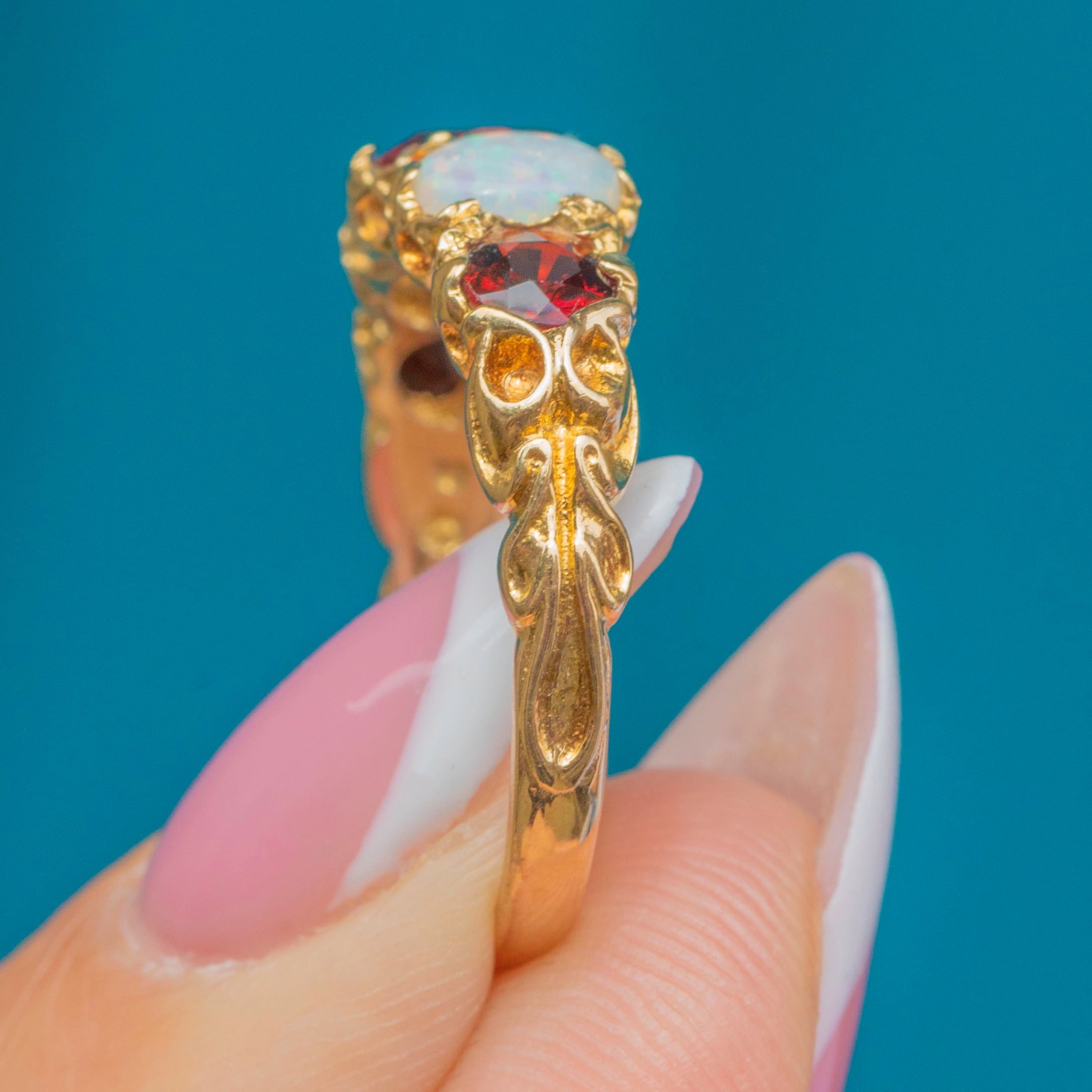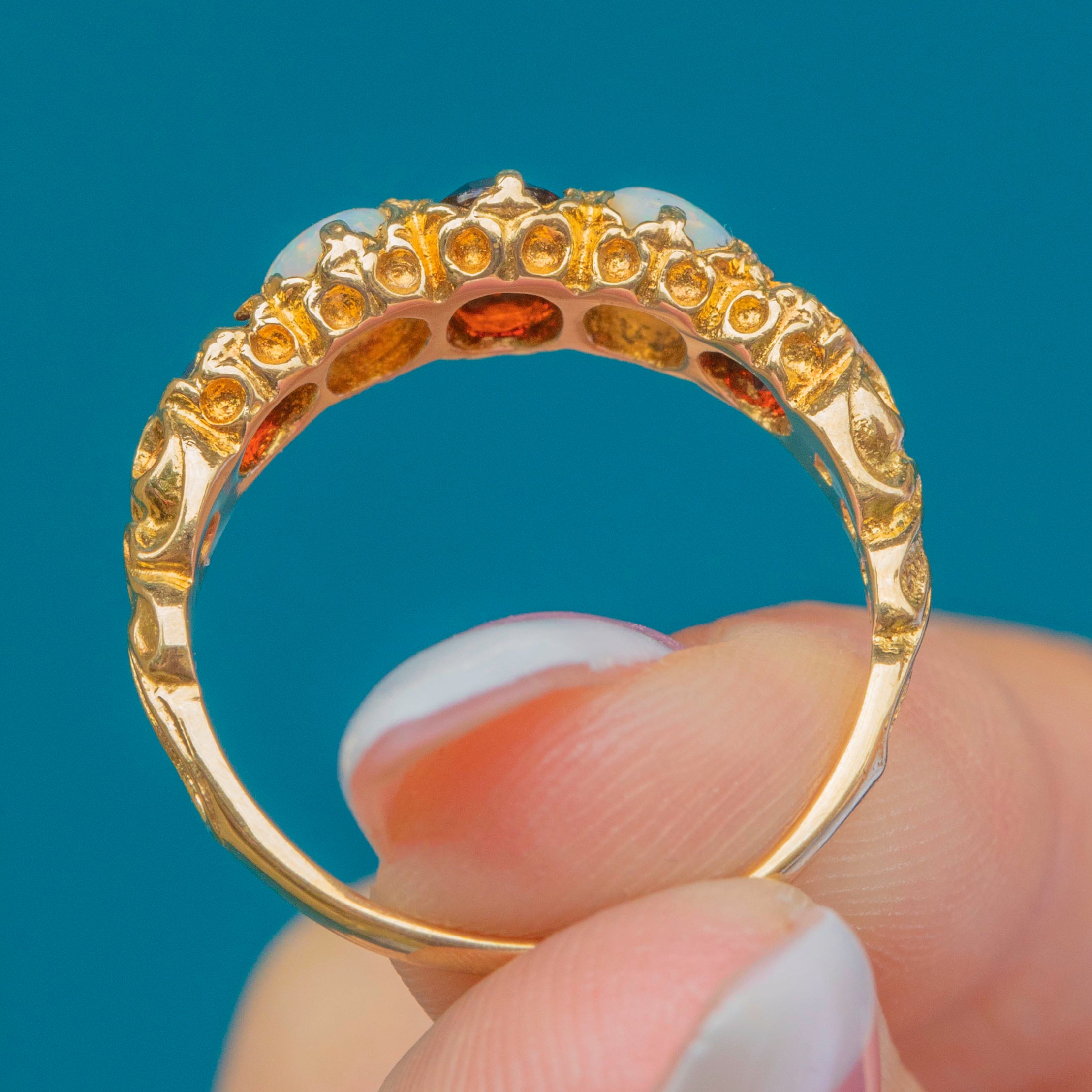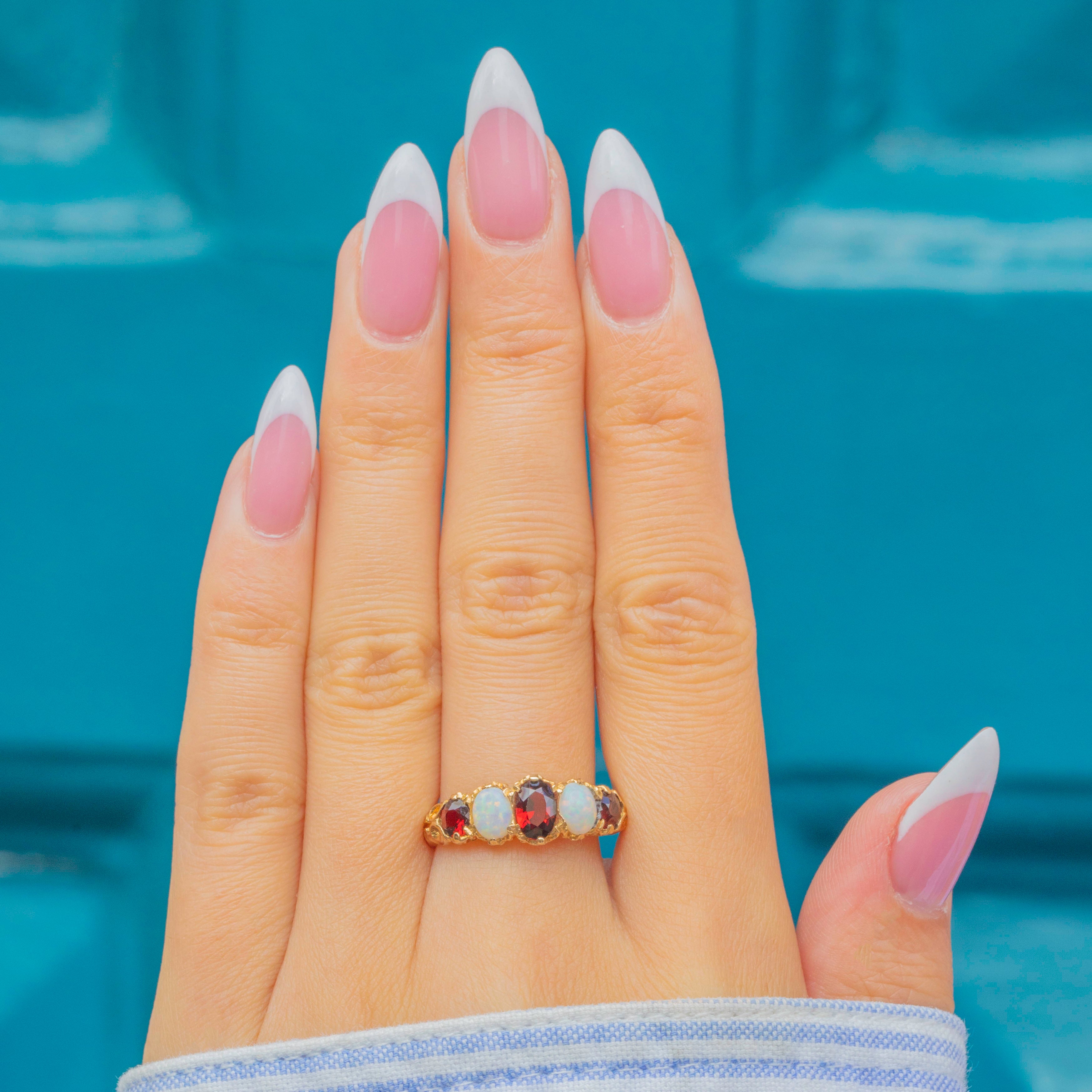 This vibrant five-stone ring pairs deep wine-red Garnets with lustrous Opals flashing pastel play-of-colour, all set in rich 9ct Gold. The gemstones graduate gracefully across the finger, secured by ornate claw settings with a decorative, scroll-detailed gallery and shoulders.