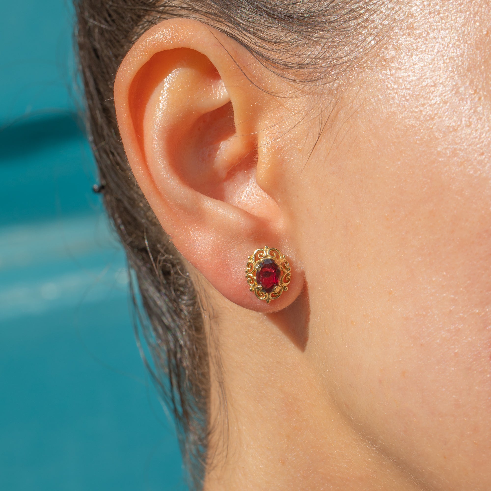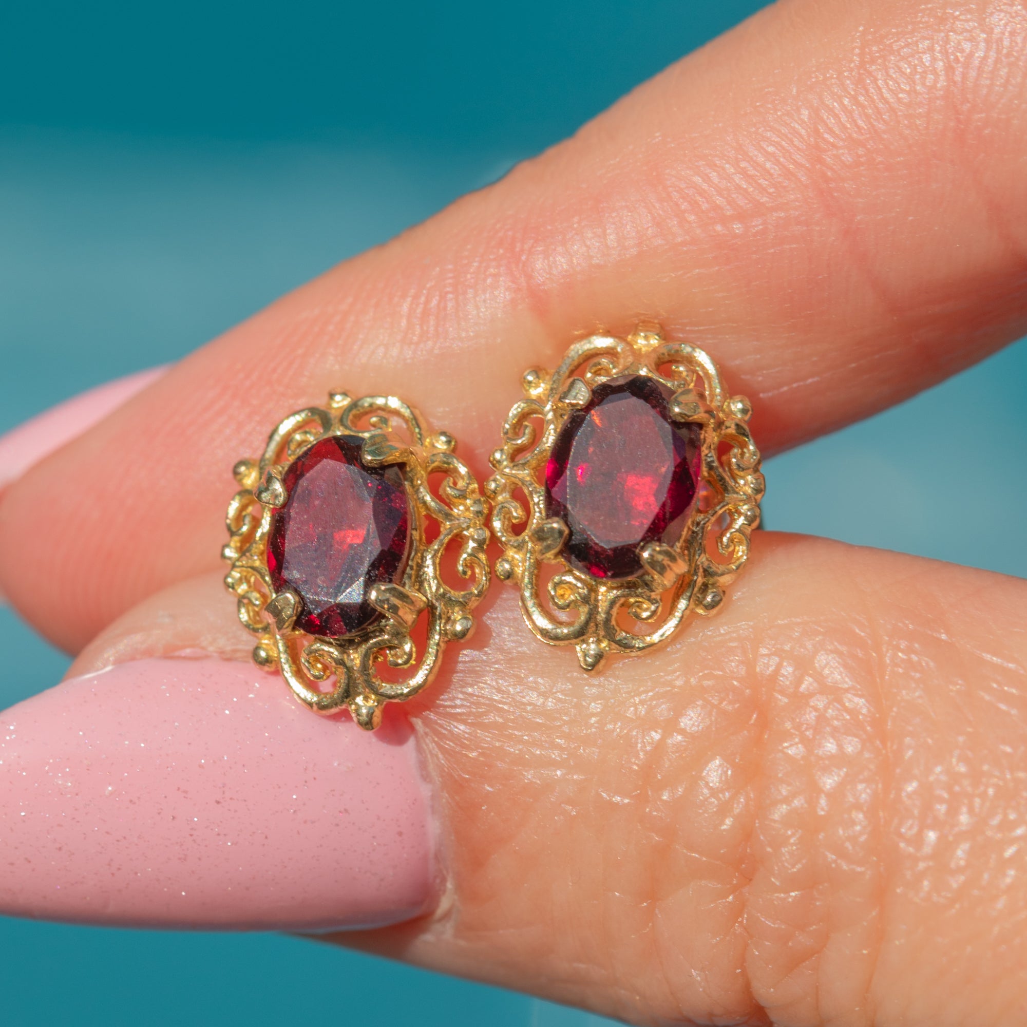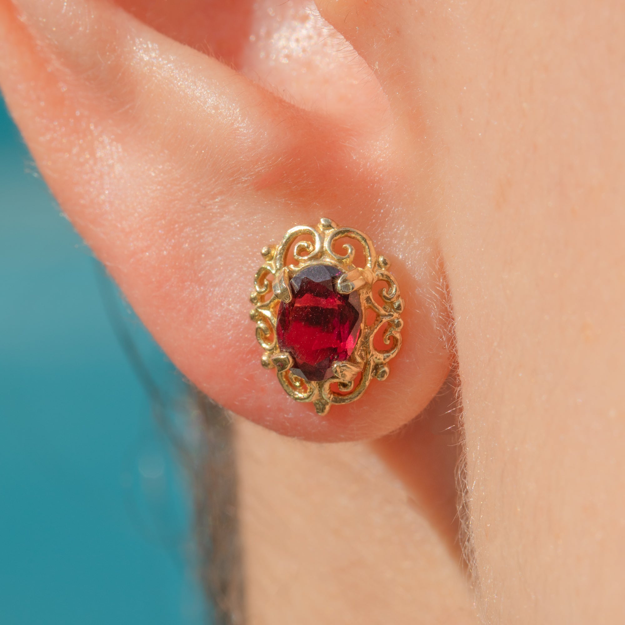 EXCELLENT: These 9ct Gold Garnet openwork stud earrings are in immaculate condition. The 9ct Gold retains a warm, even tone, and the Garnets are securely set with no chips or abrasions. The openwork design remains crisp and well-defined, with no signs of wear or damage. These earrings are ready to be worn and enjoyed for years to come!