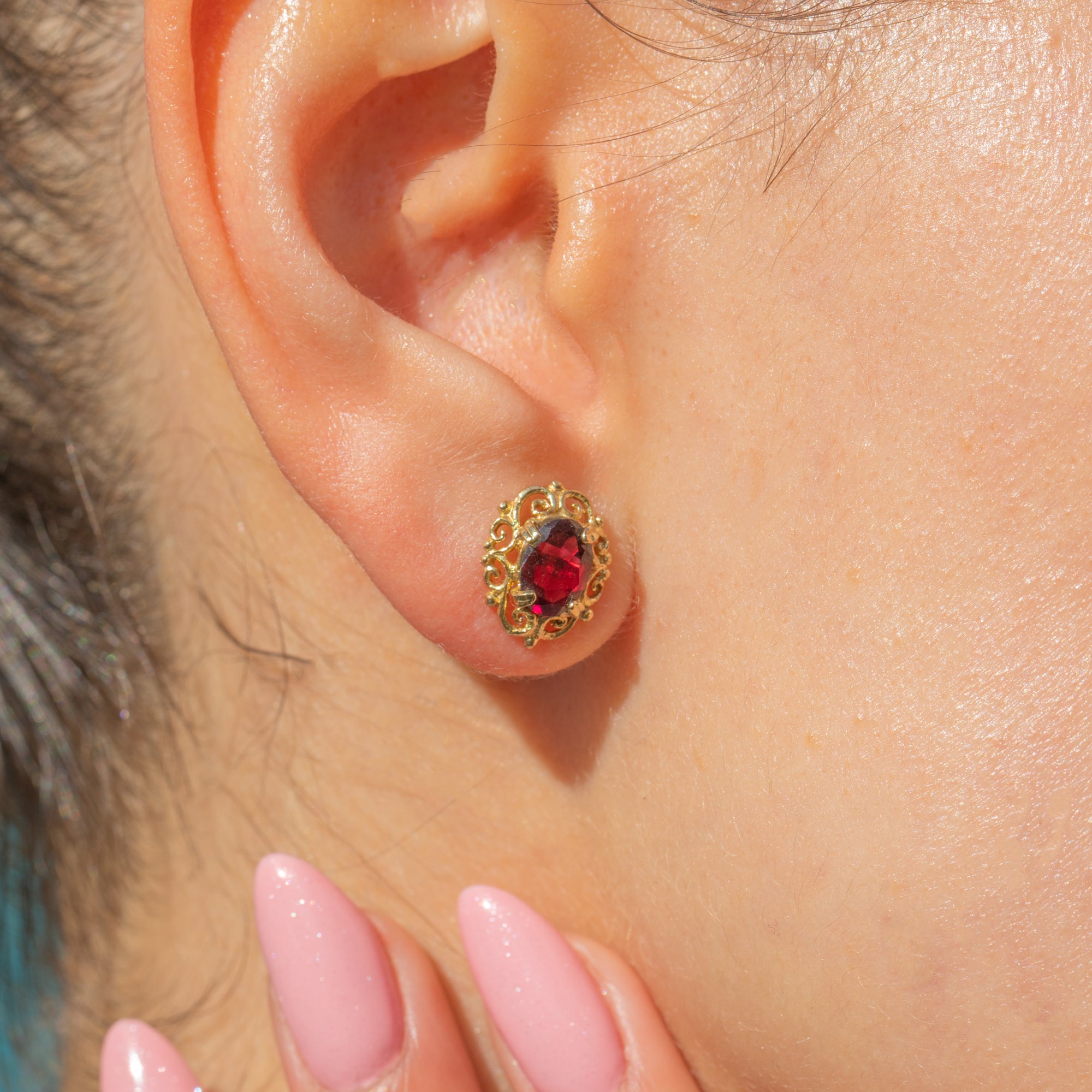 These exquisite 9ct Gold Garnet openwork stud earrings will add a decorative flair to your lobes! Each earring boasts a wonderfully faceted 0.50ct Garnet, shimmering with rich crimson hues, and is adorned by a halo of beautifully crafted ornate openwork.