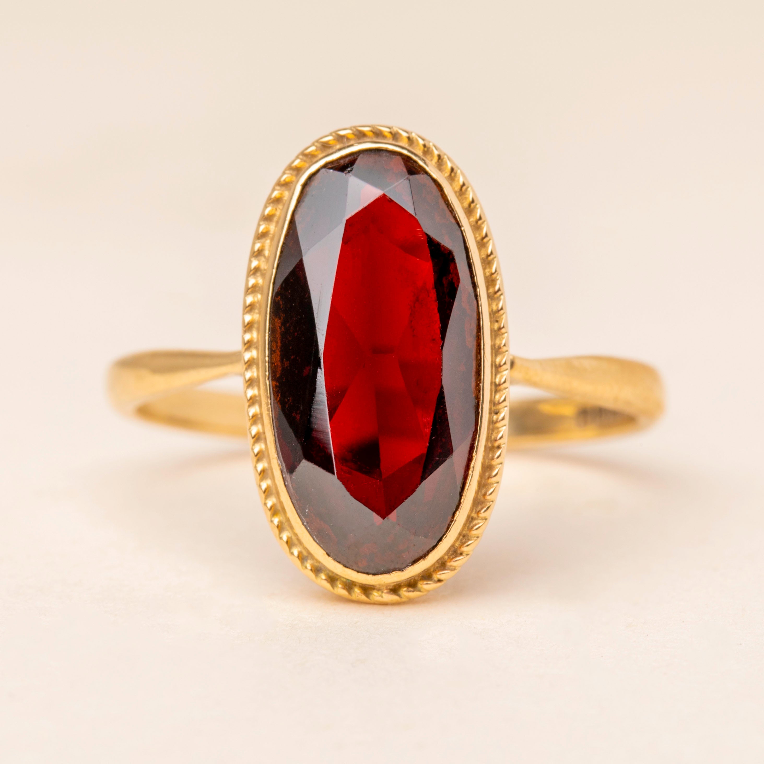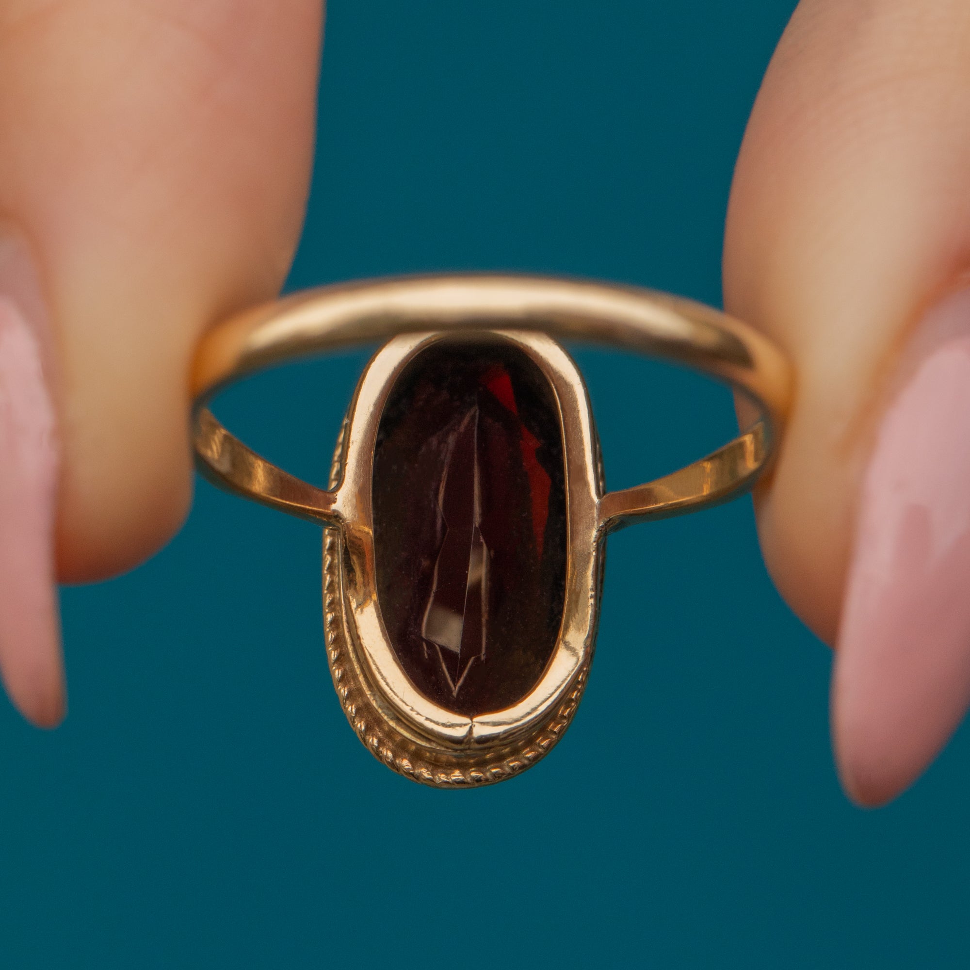 EXCELLENT. We are pleased to present this 9ct Gold Garnet Oval dress ring in excellent condition. The Garnet is vibrant and free from any nibbles or scuffs and sits securely within the ring's lustrous bezel, allowing for confident wear. The Gold is buttery and the band has retained its form well. This vintage Garnet ring promises many more years of wear and enjoyment!