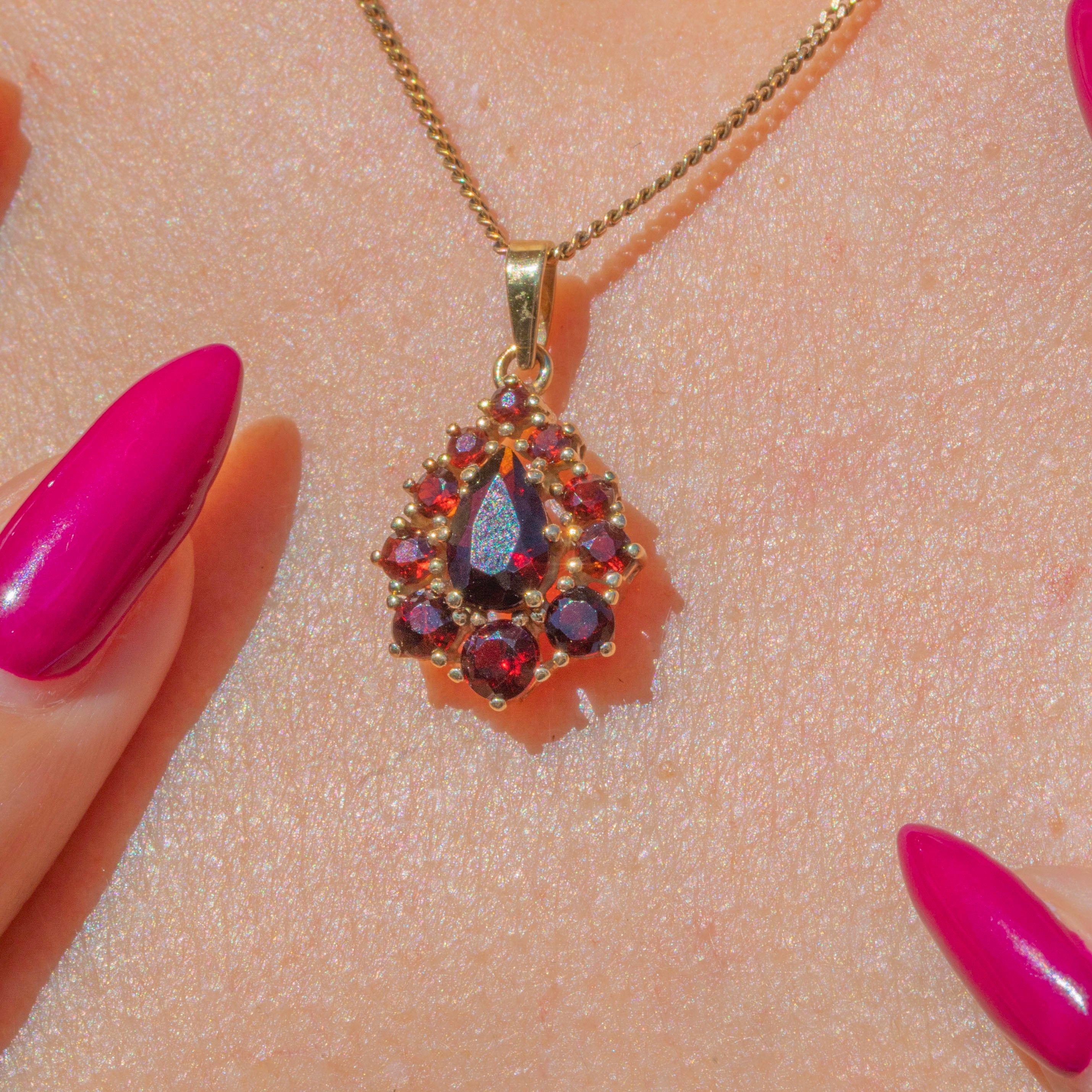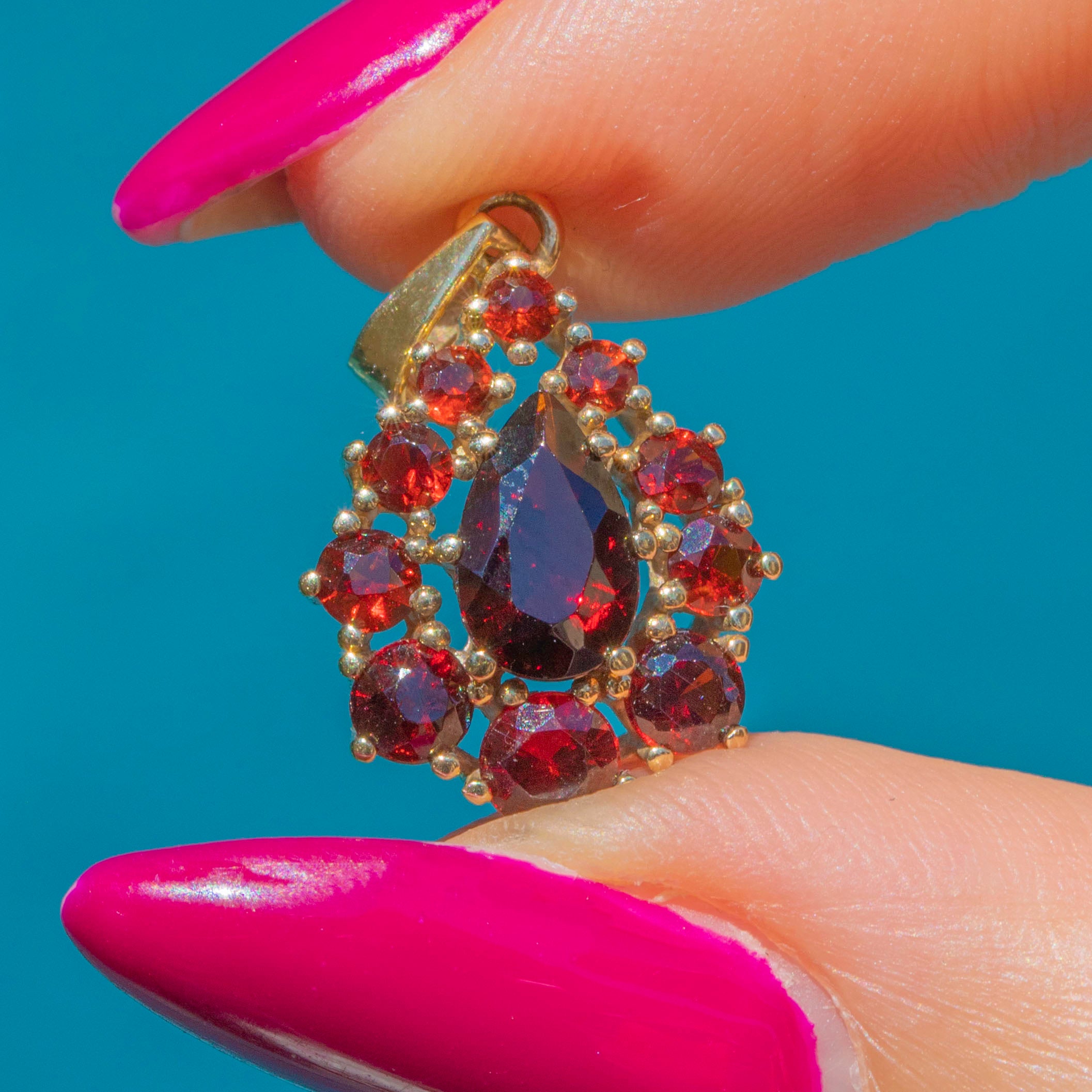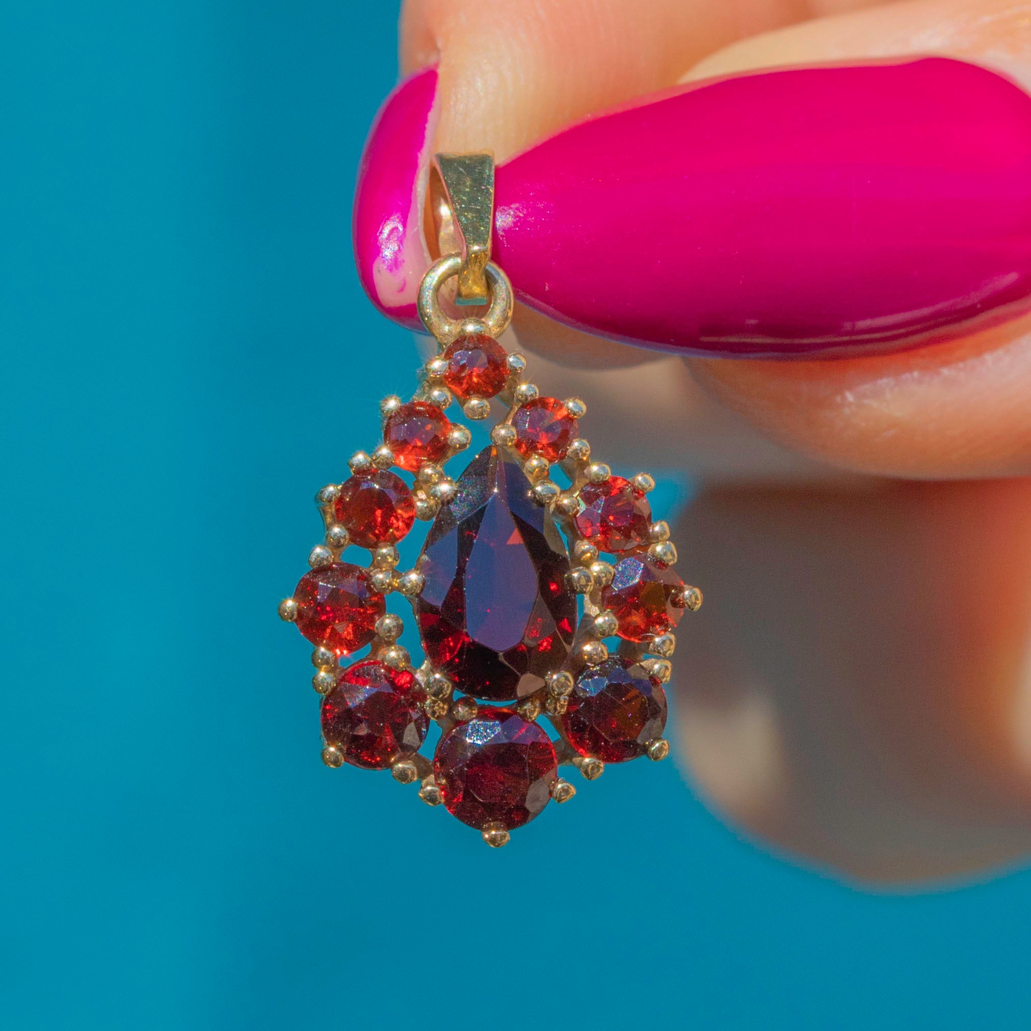 Displaying dazzling Garnets, weighing 2.25ct combined, each arranged into a pear-shaped cluster motif, this vintage charm is vibrant and elegant.